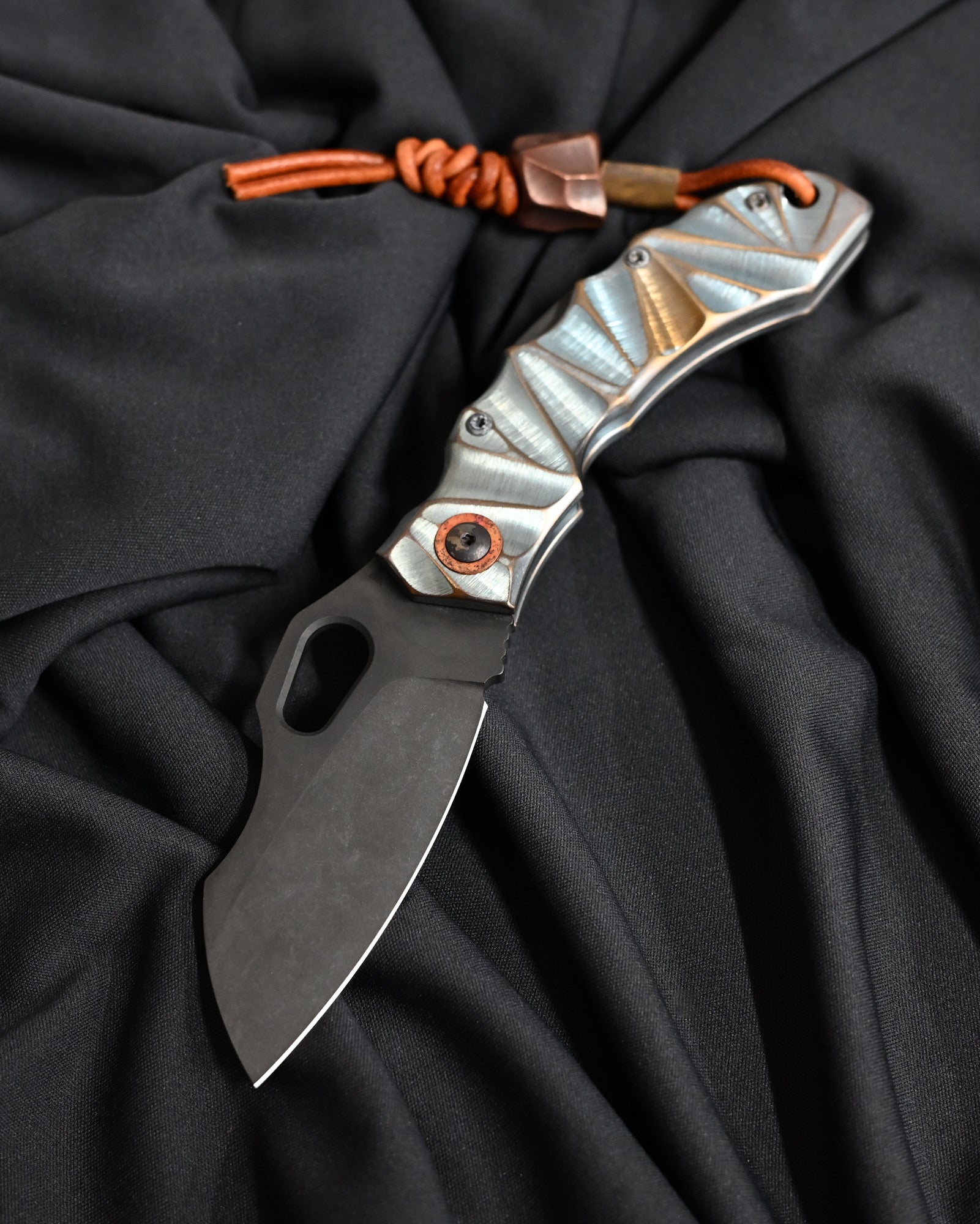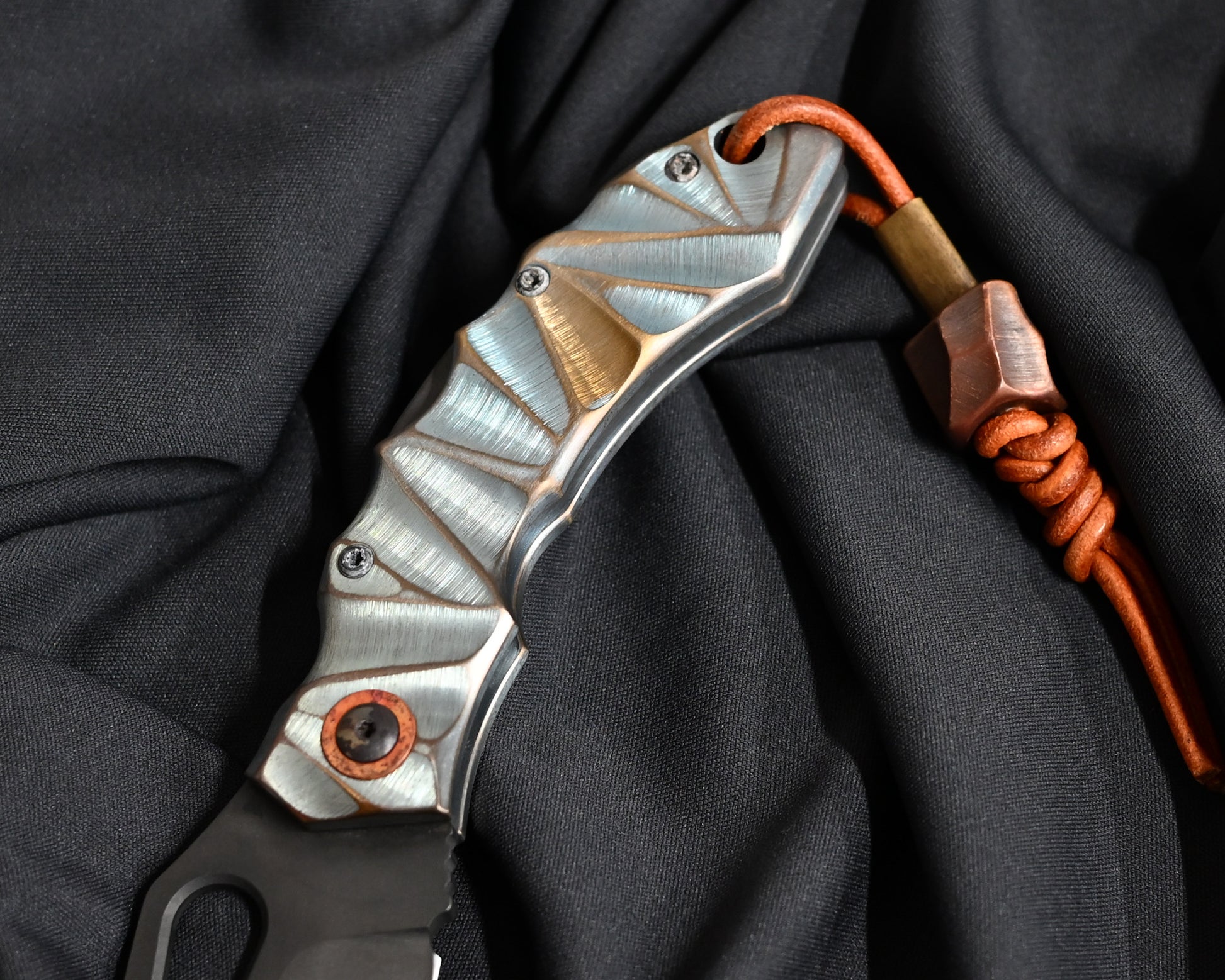 チタンハンドル人間工学に基づいたデザイン で、握りやすさを追求し、手作業で彫刻された立体幾何学模様 により、優れたグリップ感とタクティカルな印象を与えます。さらに バックロック機構 を搭載し、ブレードをしっかりと固定し、安全性と安定性を確保します。