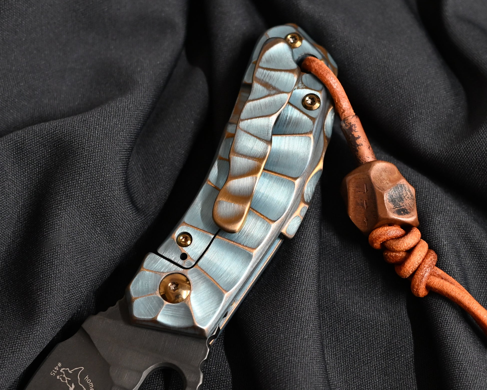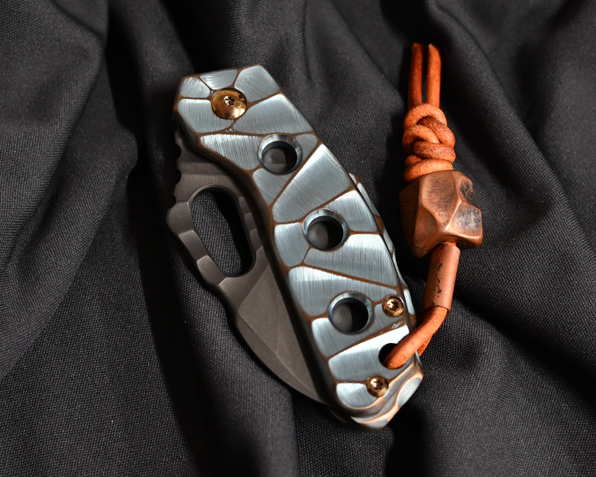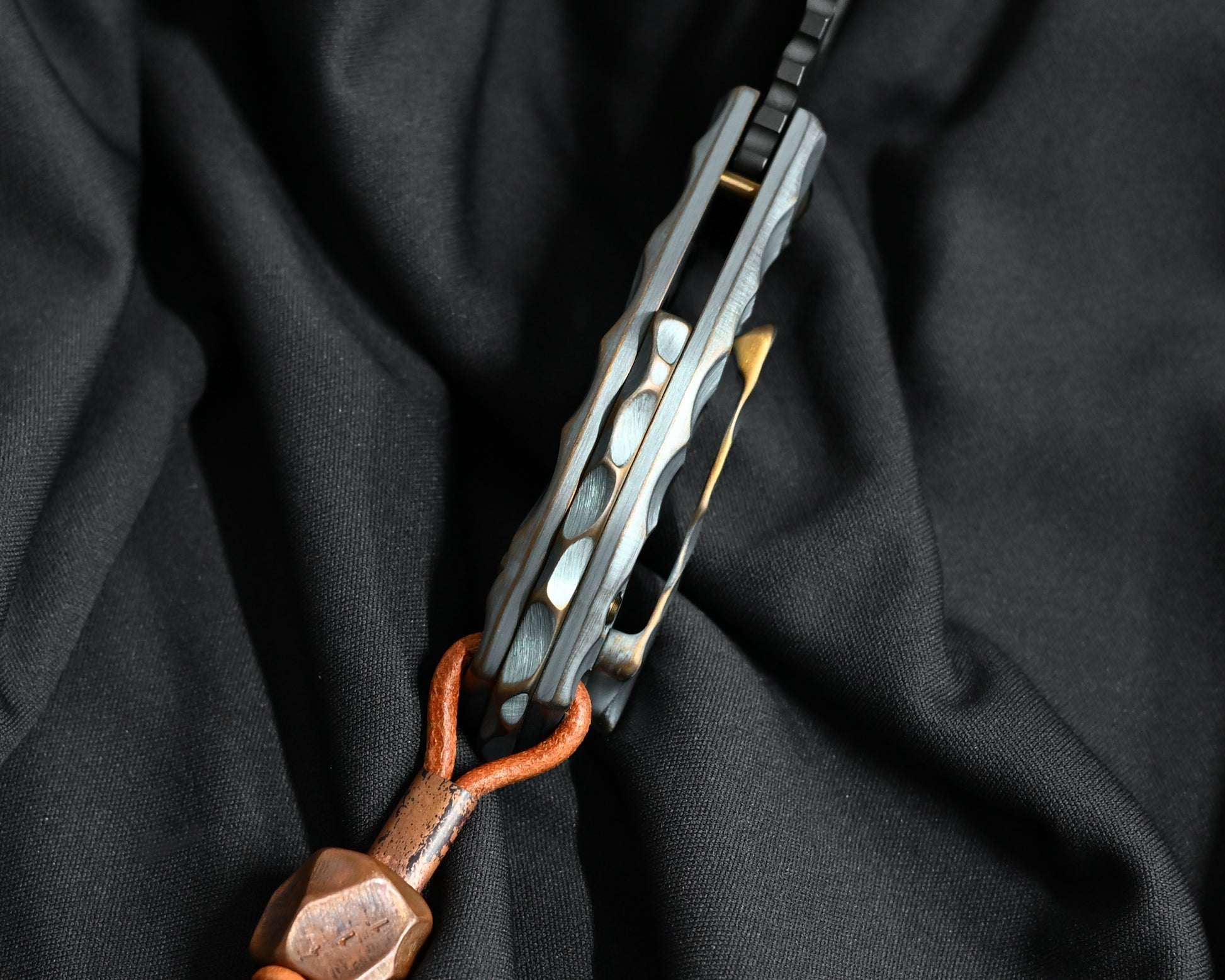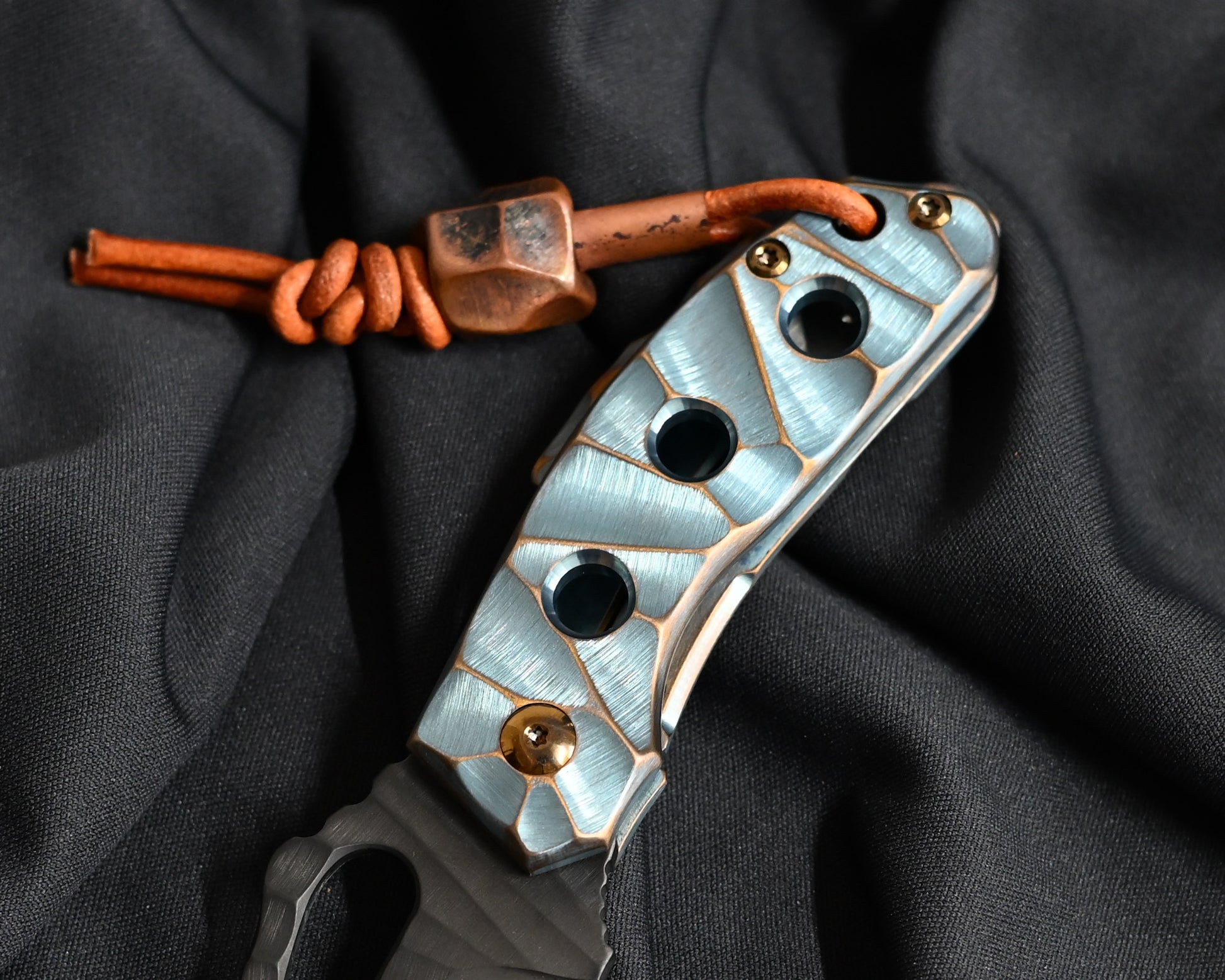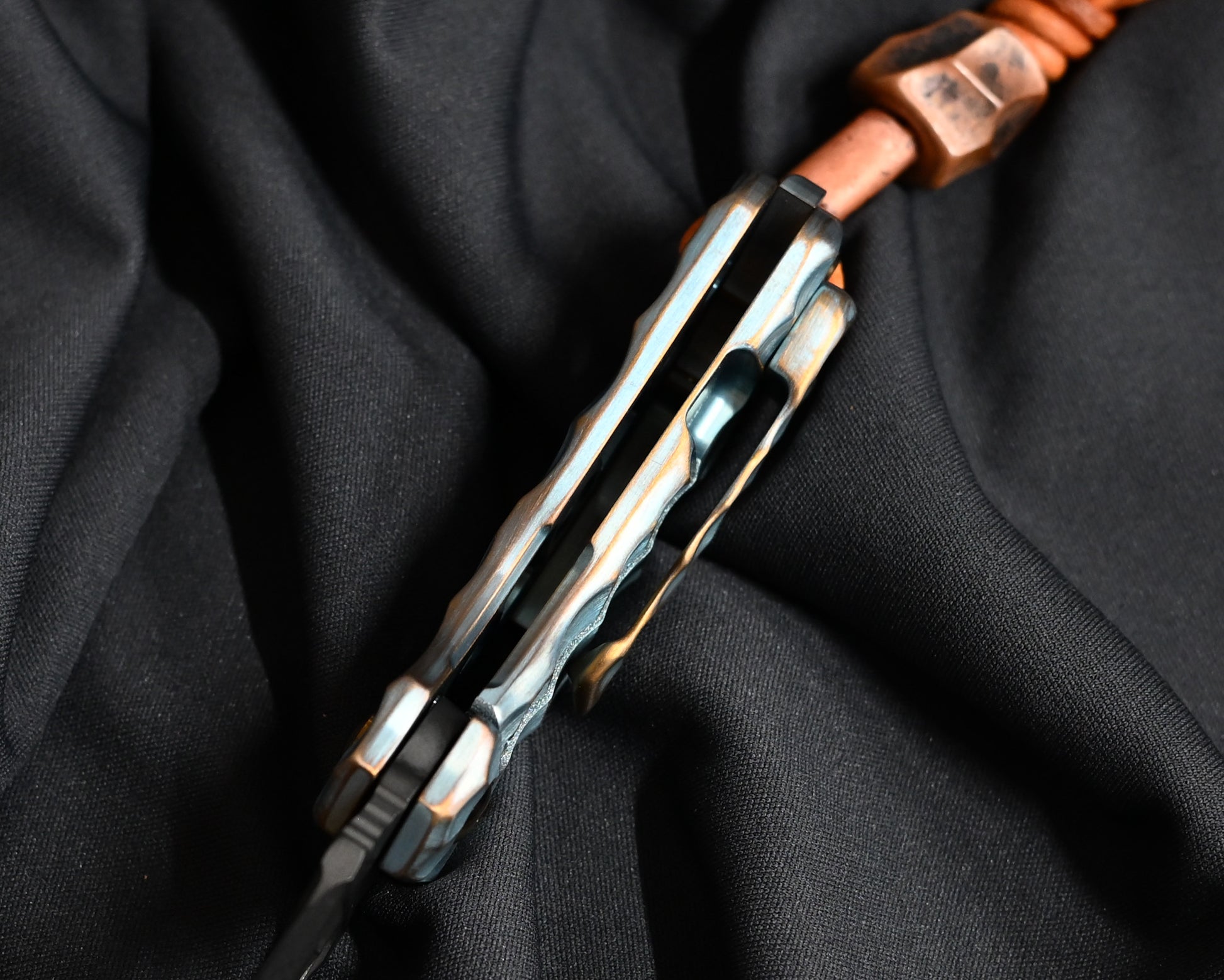 陽極酸化処理を施したチタンハンドル は、手作業で彫刻された幾何学模様 を特徴とし、優れたグリップ性能と視覚的インパクトを実現。セラミックボールベアリングシステム を搭載し、スムーズかつ迅速なブレード展開が可能です。