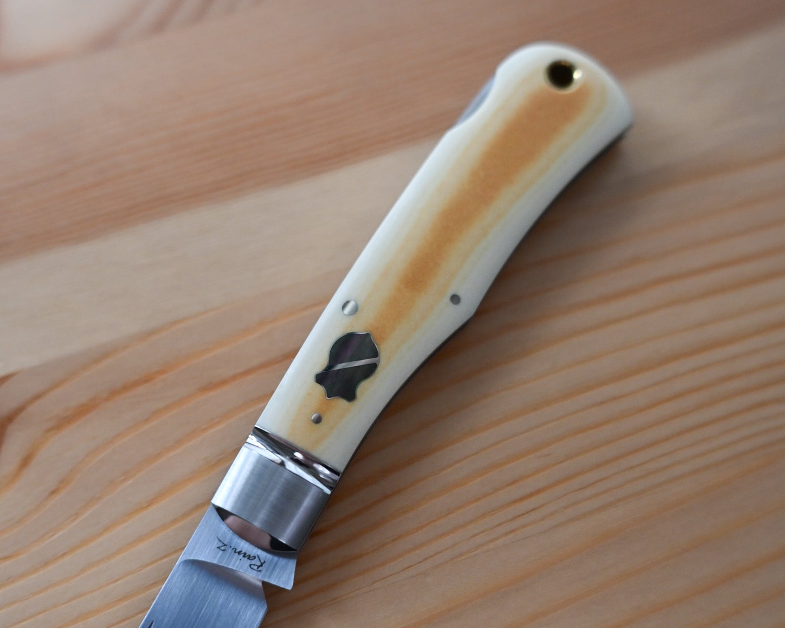 Rain.Z Knives 手作り折りたたみナイフ – 2025年 東京TFKS 唯一モデル RWL34 ボウイナイフ(アンティーク Westinghouse Micarta ハンドル)