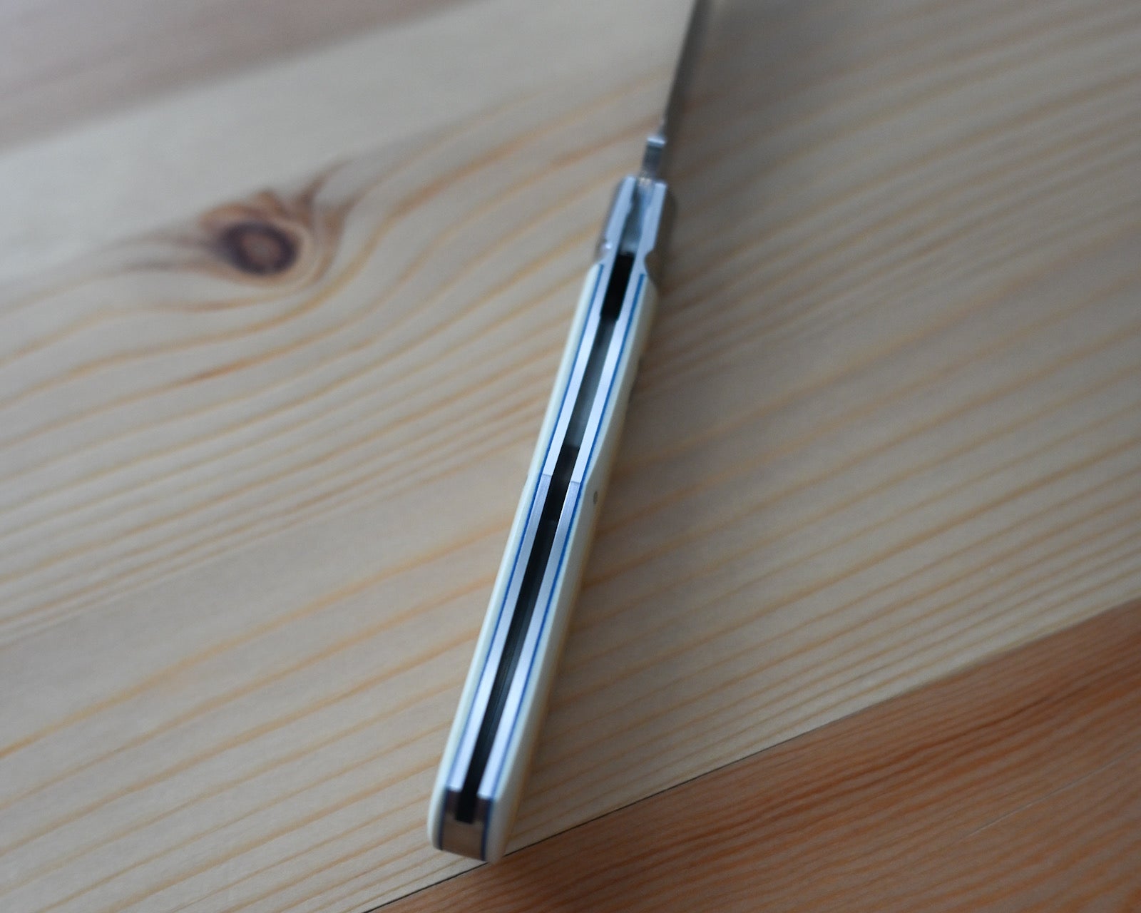 ハンドルには 極めて希少なアンティーク Westinghouse Micarta を採用。これはかつて アメリカの Westinghouse Electric Corporation(西屋電気) によって製造された伝説的な積層素材です。現在では生産が終了しており、その希少価値は非常に高く、世界中のコレクターから熱い注目を集めています。温かみのある手触り、ヴィンテージな風合い、経年変化による味わい を持つこの素材は、時が経つほどさらに魅力を増していきます。このナイフは、単なる実用ツールではなく、歴史そのもの です。