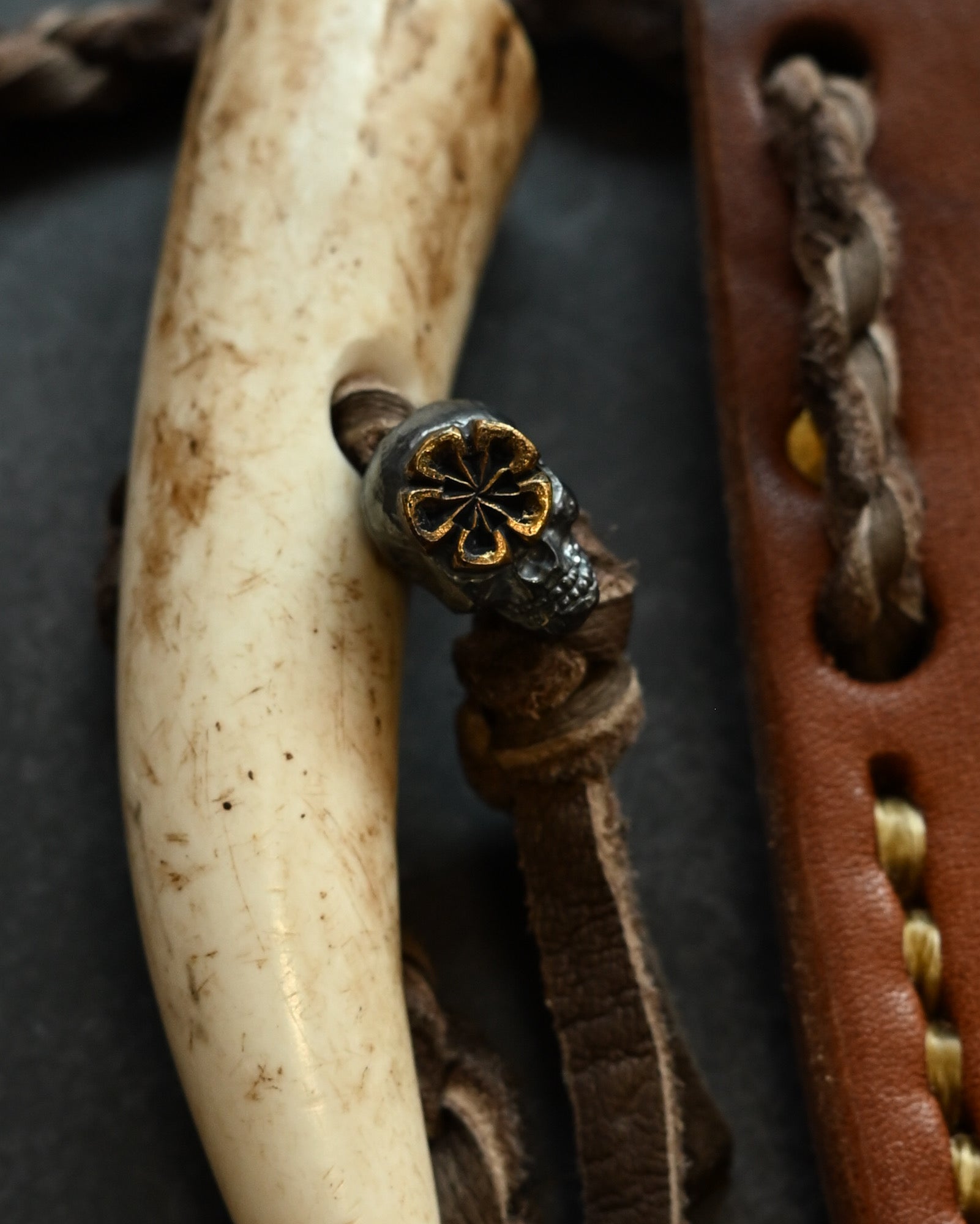 エンド部分には 手編みのレザーコード が取り付けられ、鹿角・925銀スカル・銅製杏花チャーム が組み合わされています。
