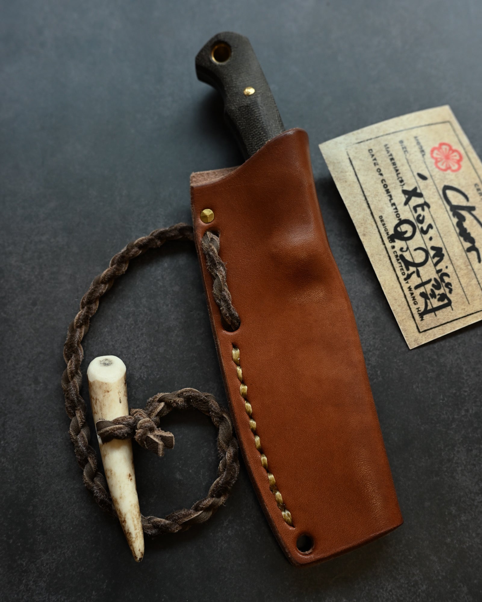さらに、手縫いの植物タンニン鞣し革シース と 鹿革のバースカード が付属し、作品の誕生を記録します。