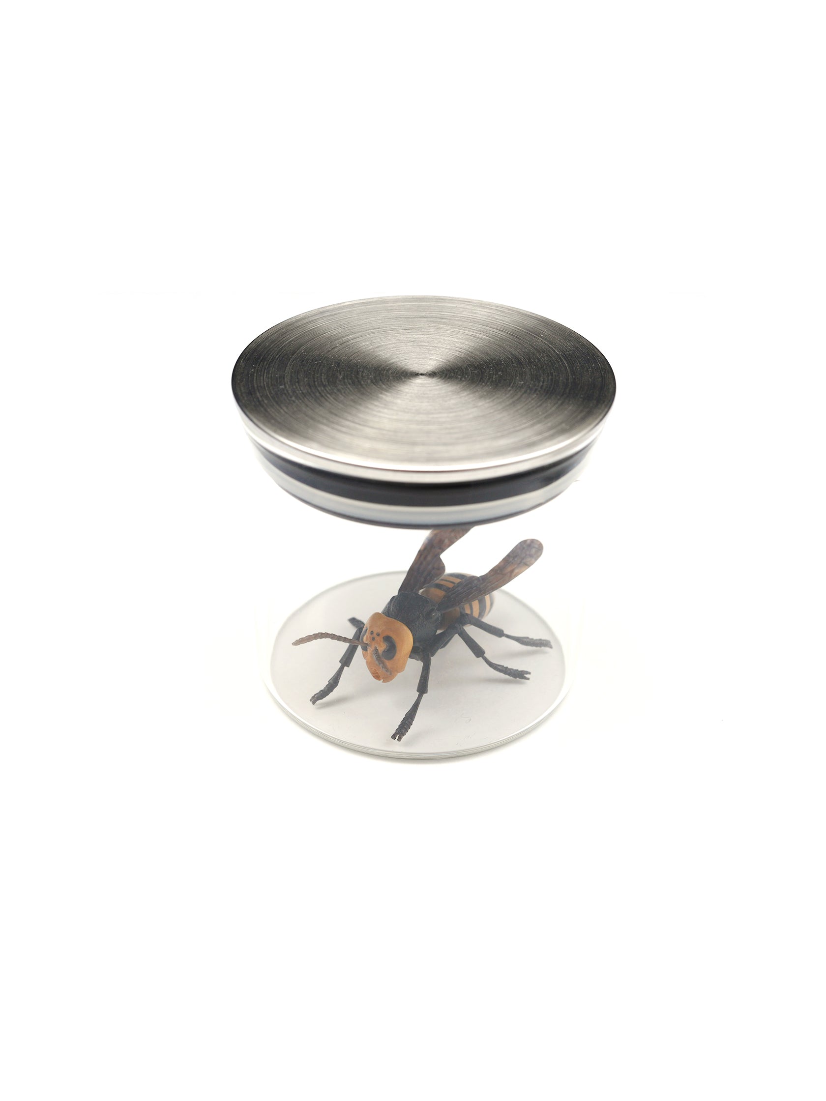 The yellow parts are made from Takushoku, the black parts of the body are made from ebony, the wings, antennae and eyes are made from buffalo horn, the feet are made from ebony and the tips of the feet are made from buffalo horn.