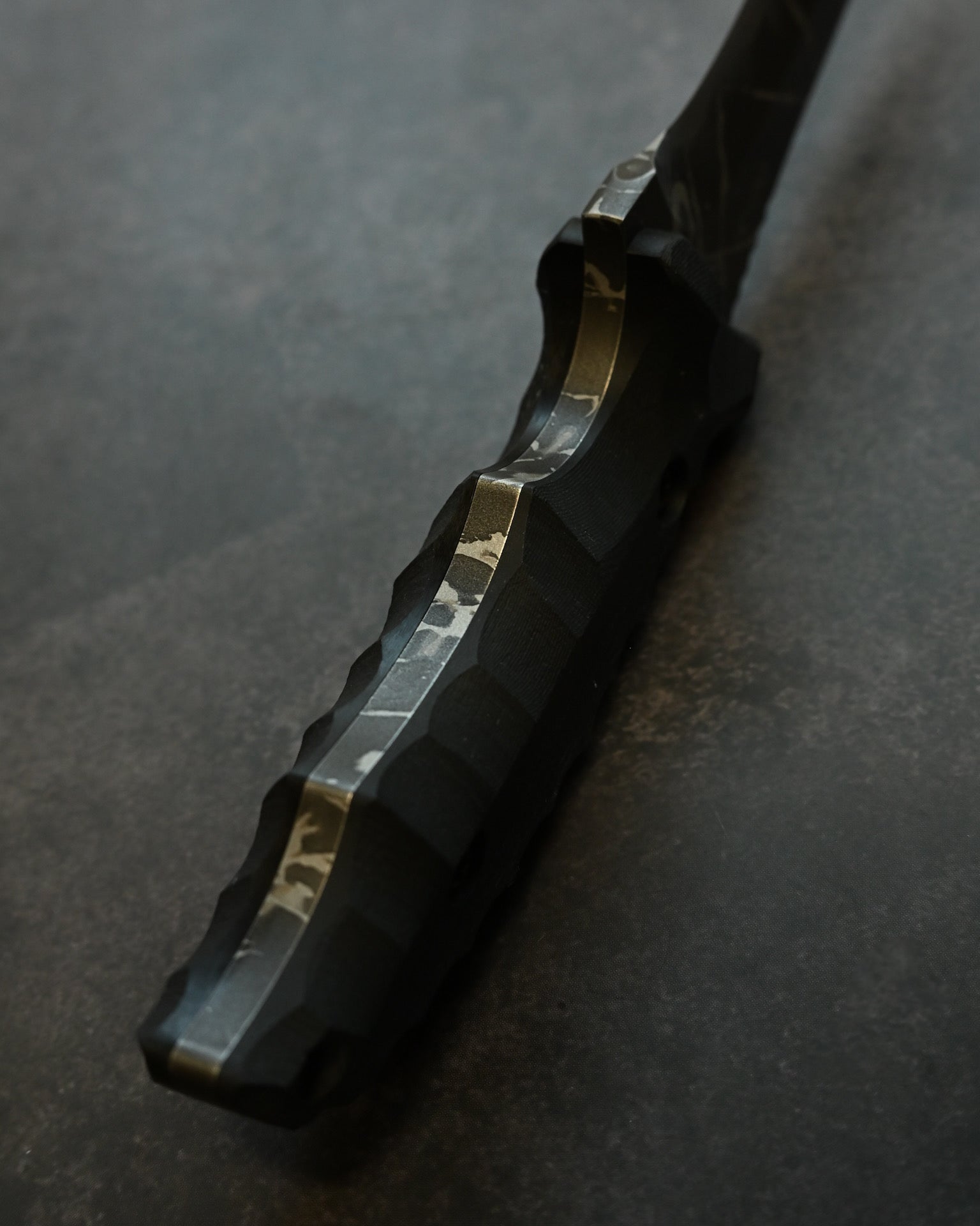 The handle is carved three-dimensionally from black G10, offering excellent grip, lightweight comfort, and weather resistance.