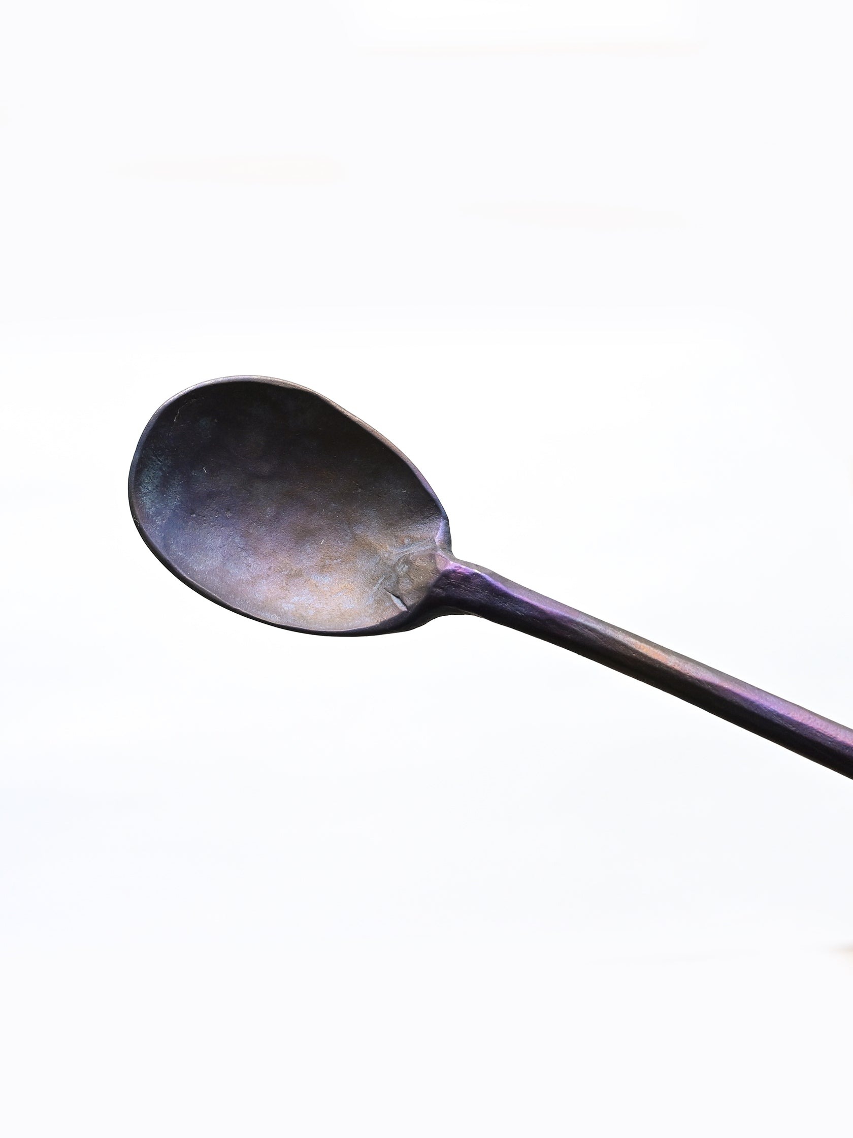 The hammered texture left by forging and polished surface provides a soft and smooth feel, creating a gradient of colors from deep blue and light blue like the ocean, to purple like twilight, and gold-brown like a sunrise, with no two items being identical.