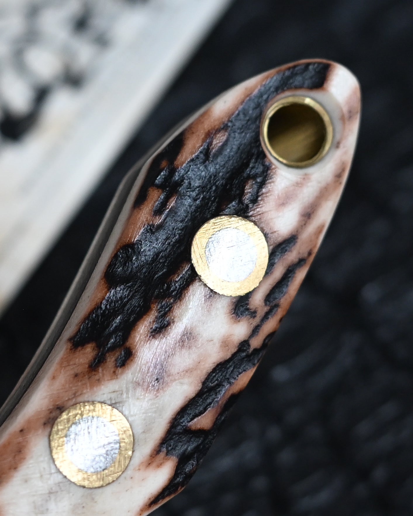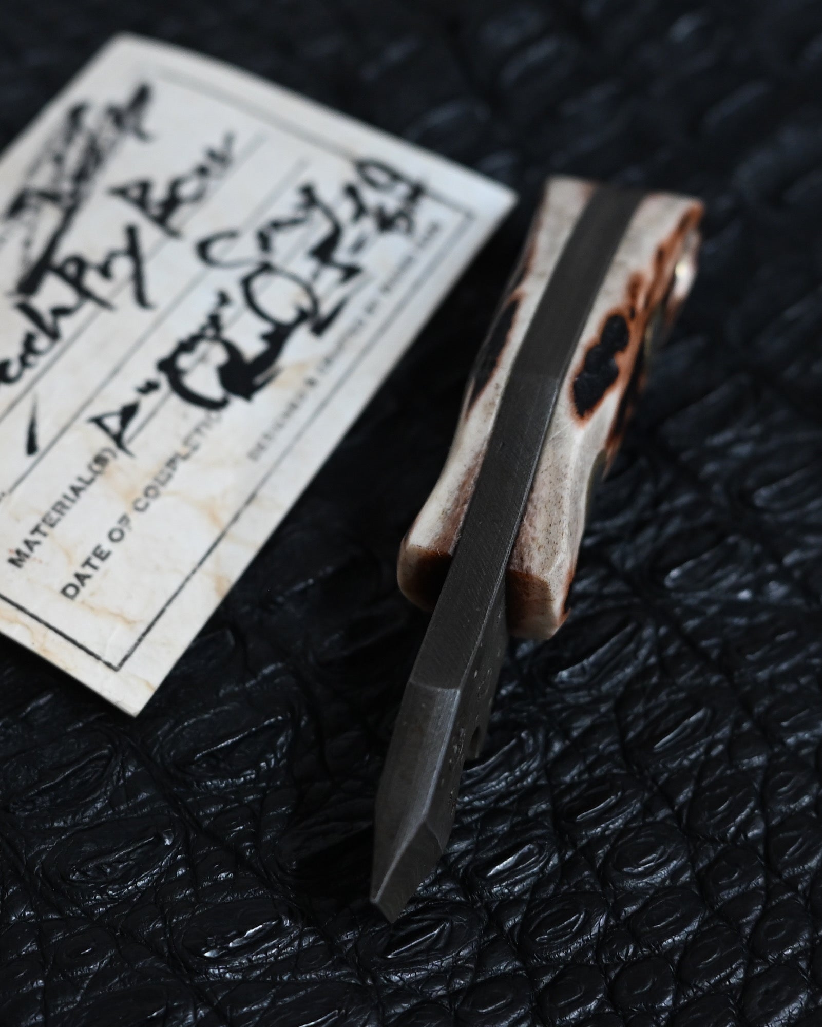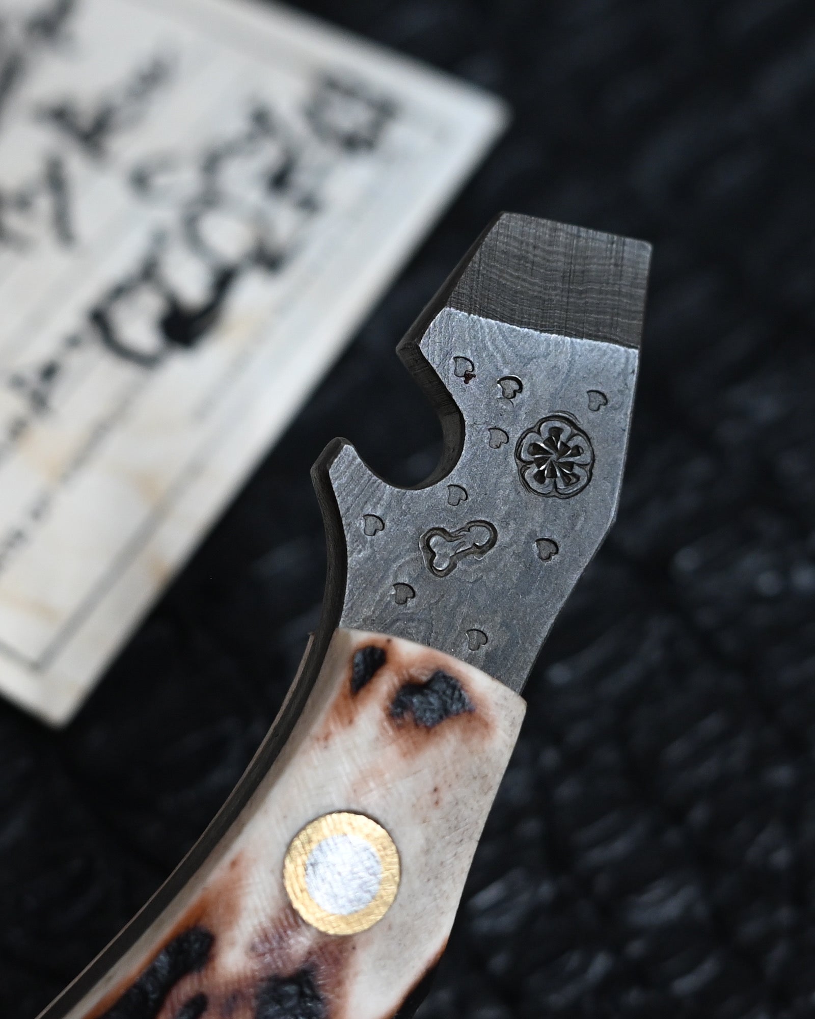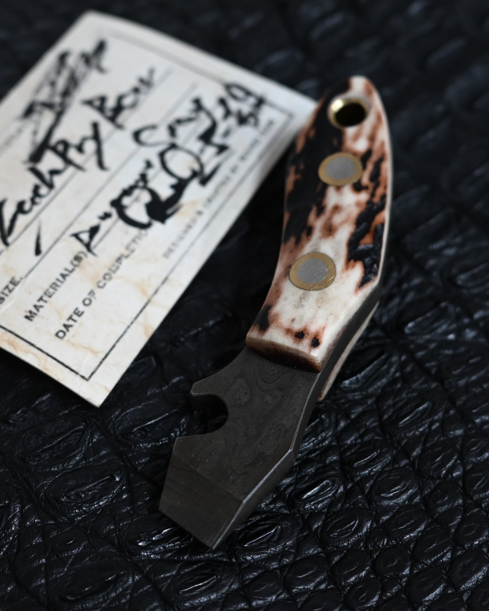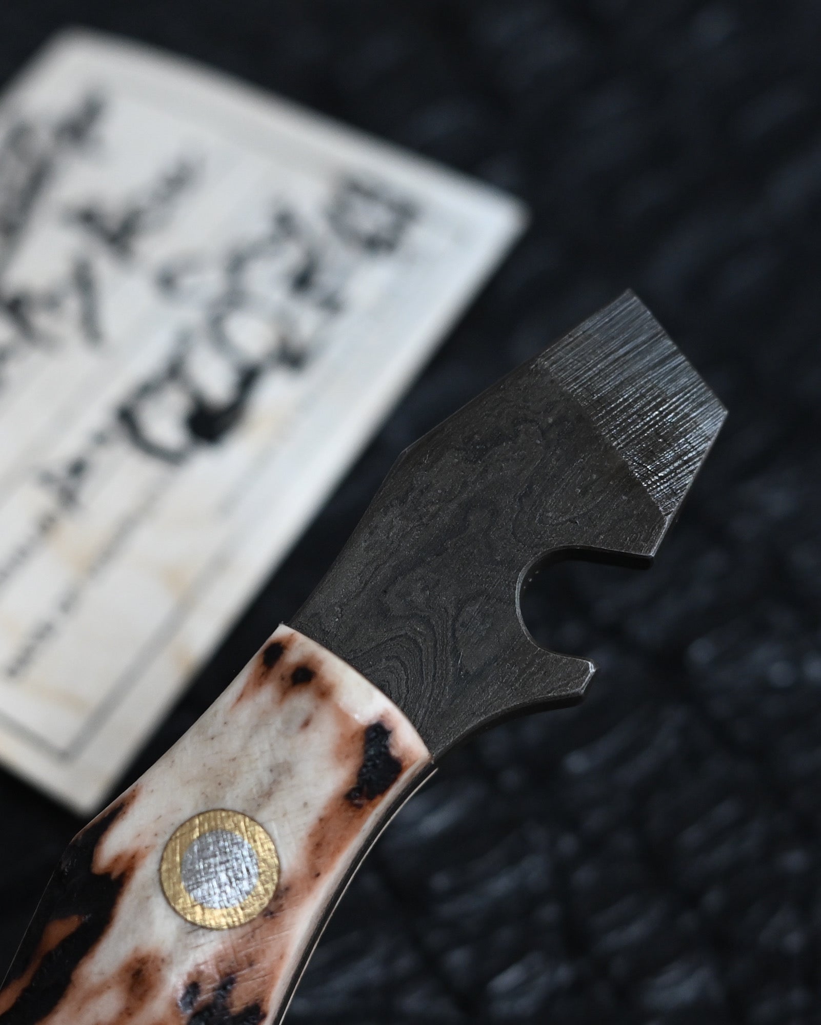 Crafted by Wtopia in June 2025, this one-of-a-kind EDC pry bar is forged from Japanese laminated Damascus steel and paired with a naturally textured Hokkaido deer antler handle. Compact and practical, it features an integrated bottle opener at the tip. Engraved with Wtopia’s signature sakura (cherry blossom), heart, and yang symbol, this piece merges traditional craftsmanship with a bold sense of individuality. Each piece is handmade, with no two exactly alike.