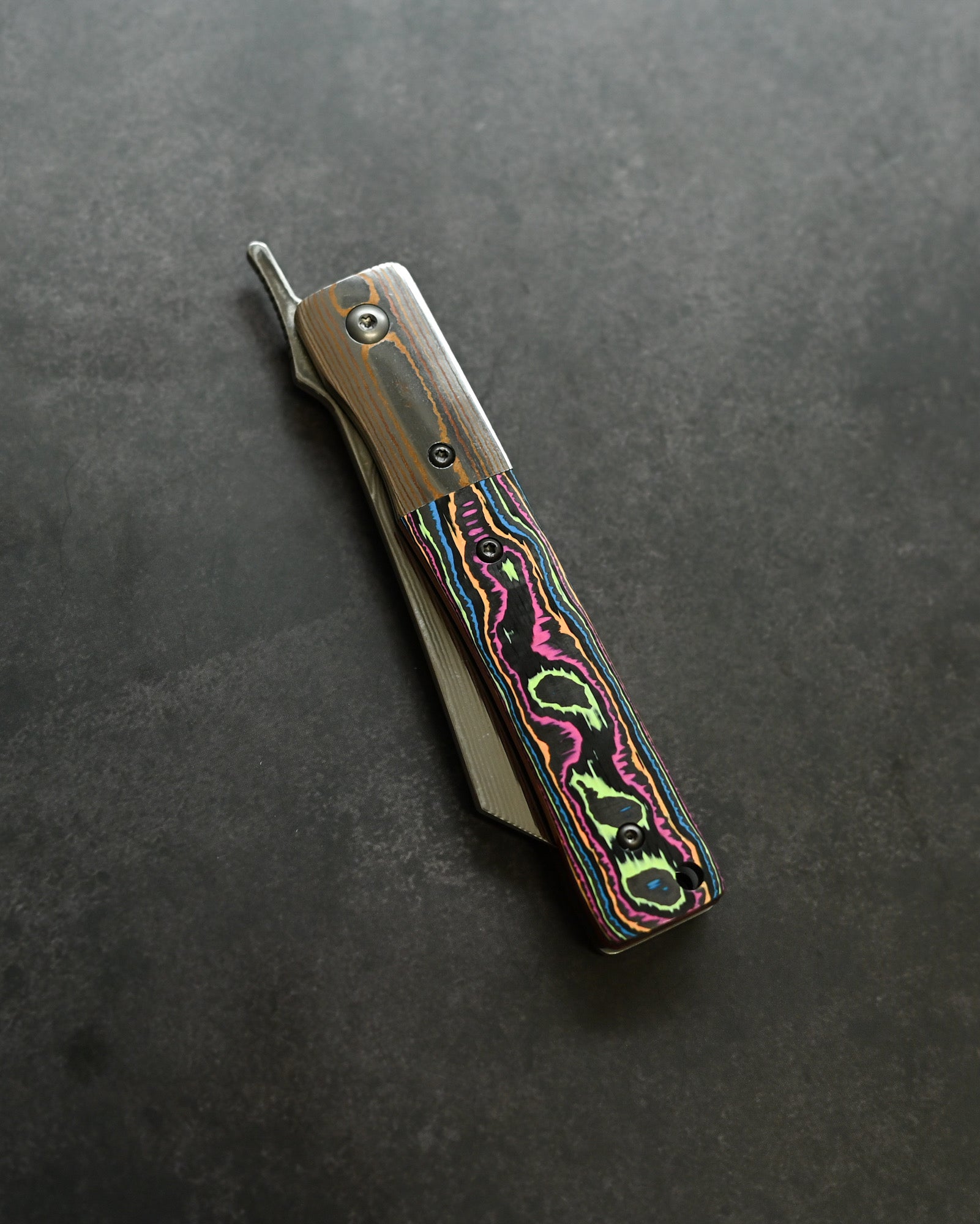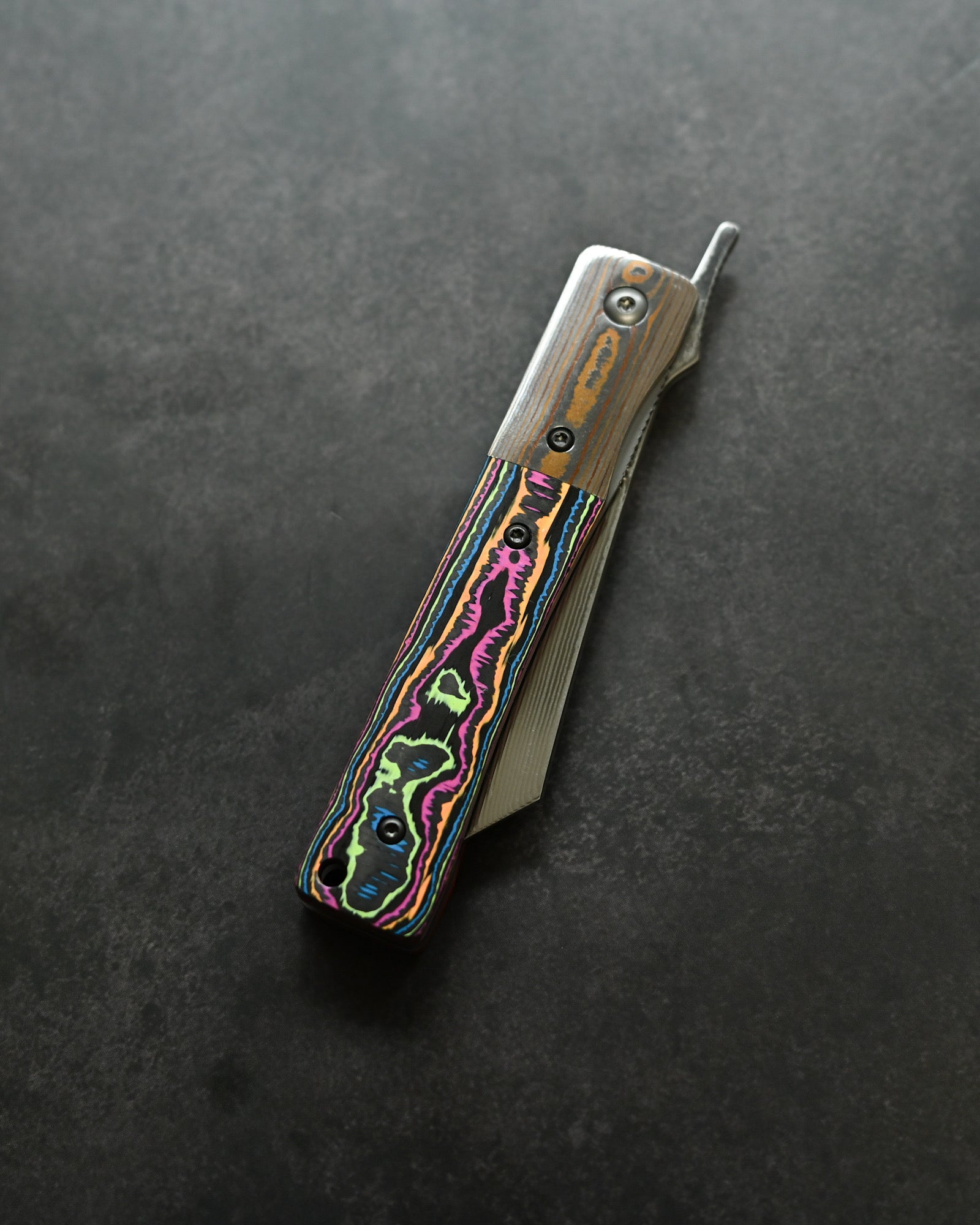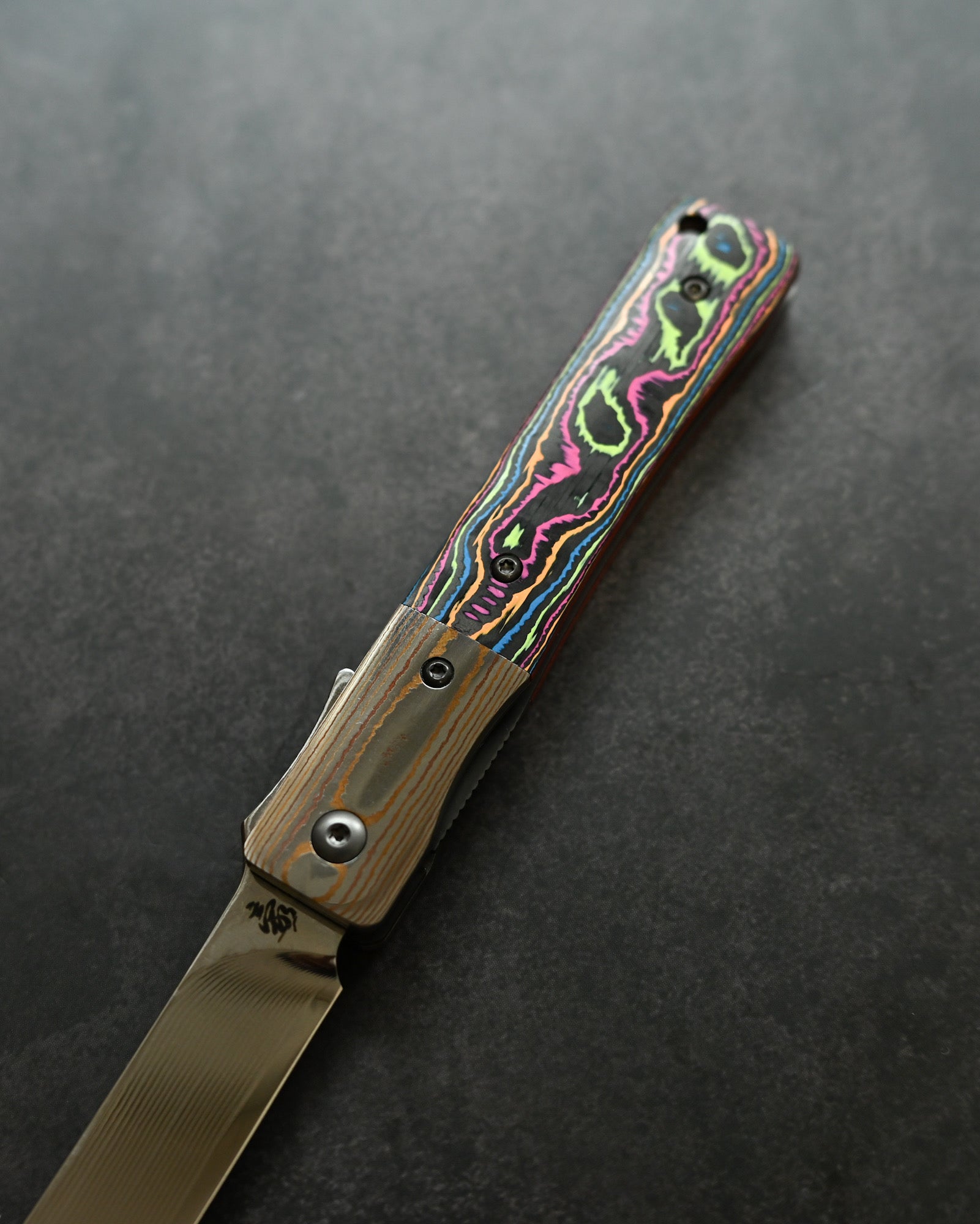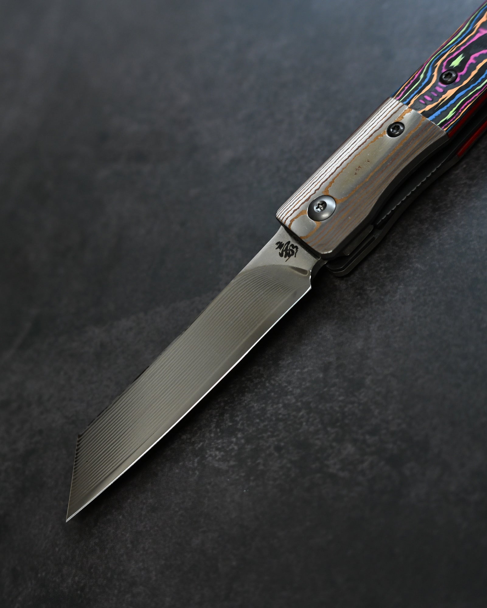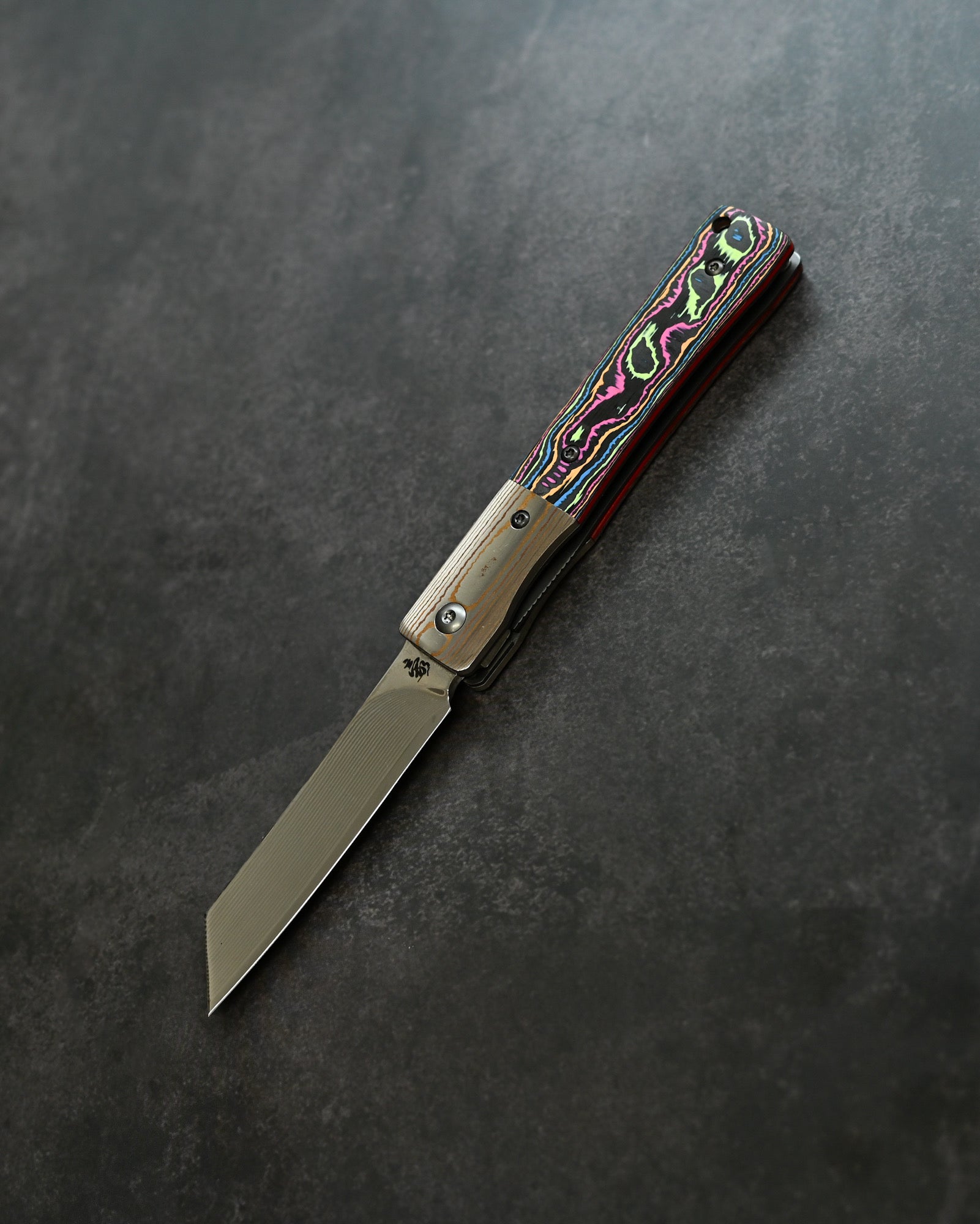 A Mokume-gane bolster flows seamlessly with the blade, while the Ceramic Carbon Fiber handle in Neon Lava finish offers lightweight durability with futuristic aesthetics.