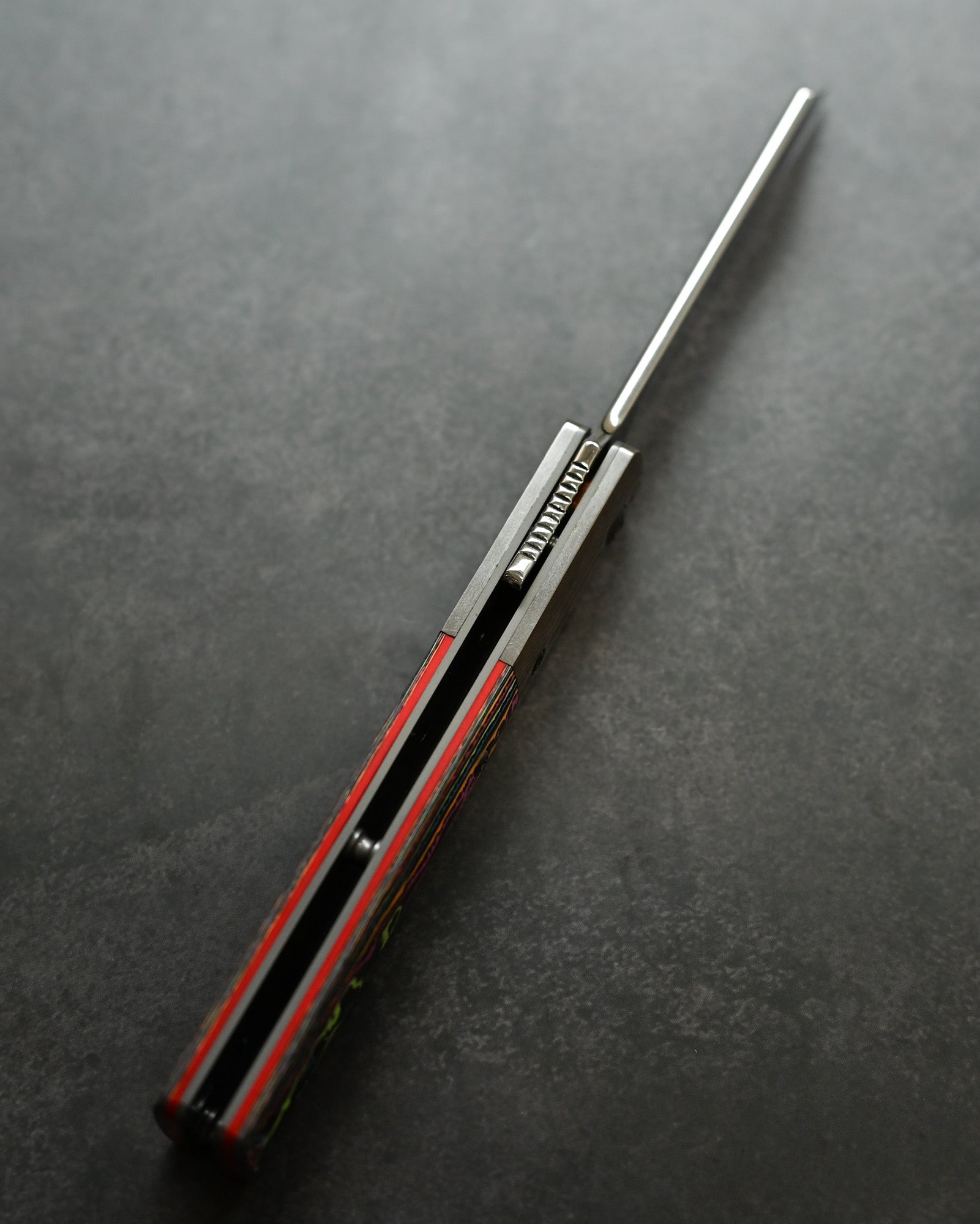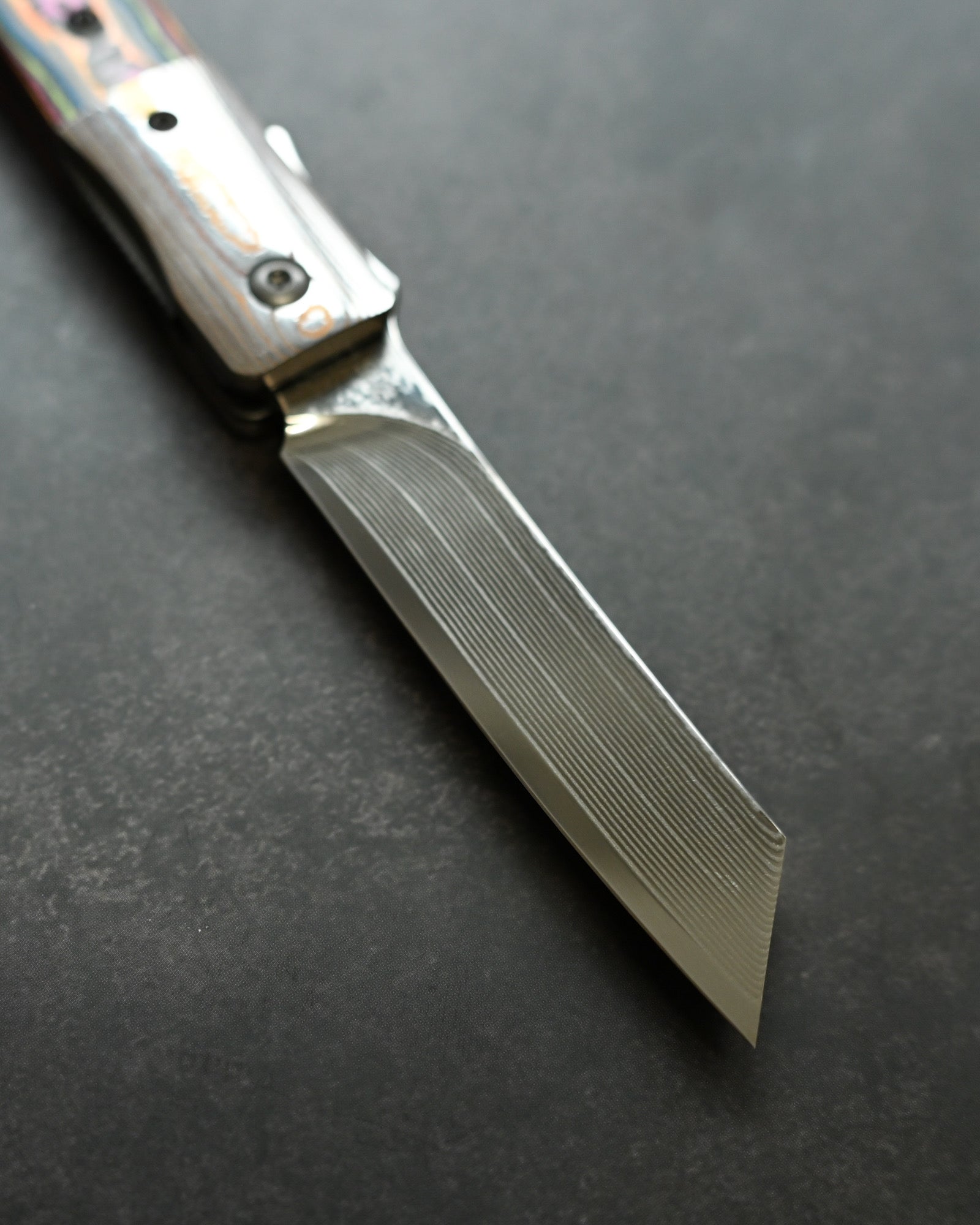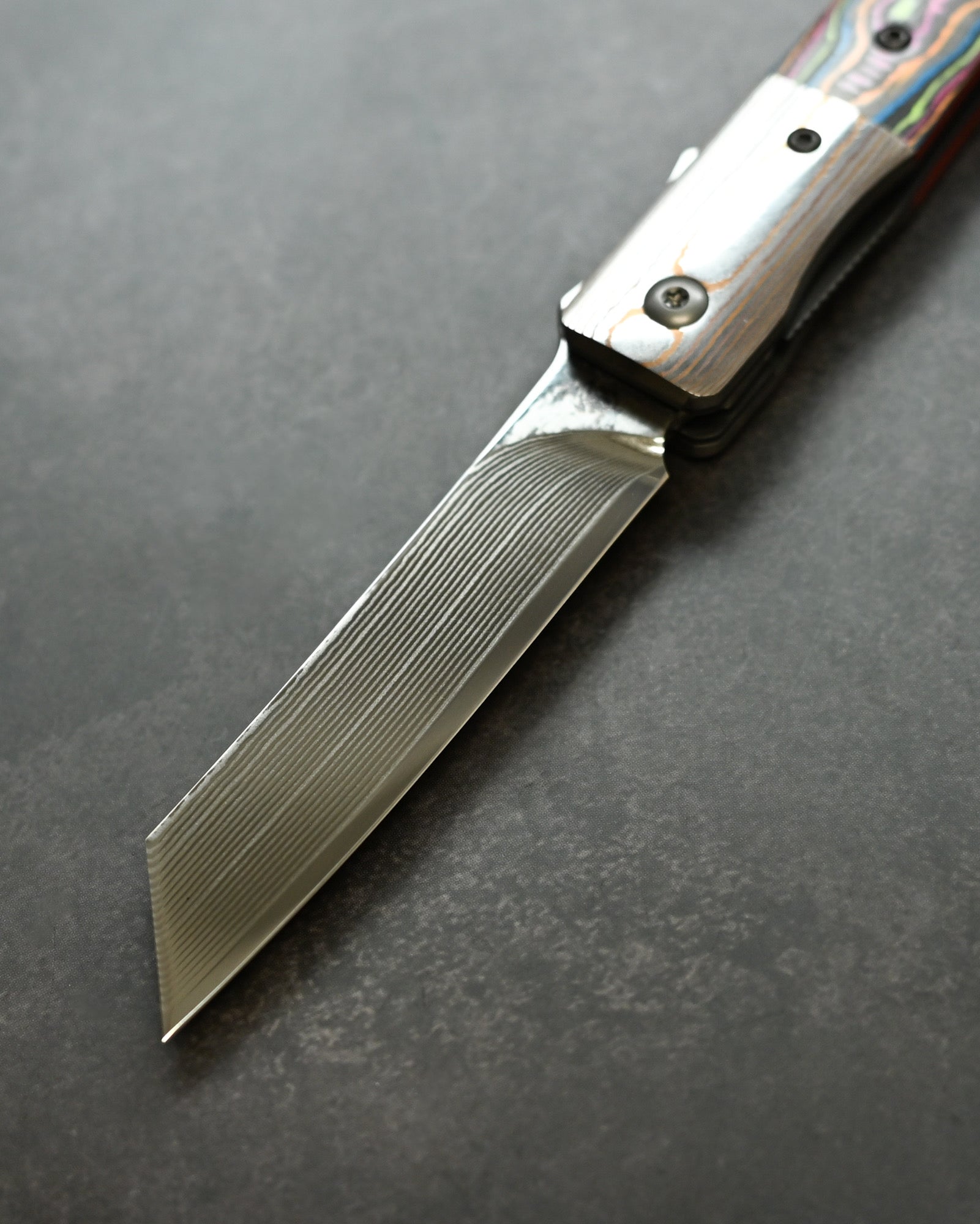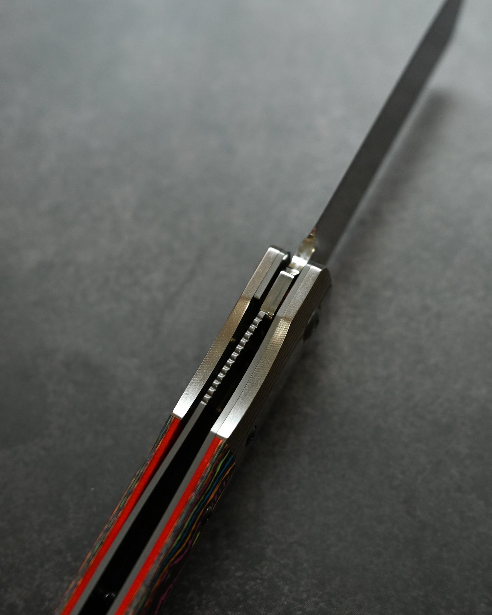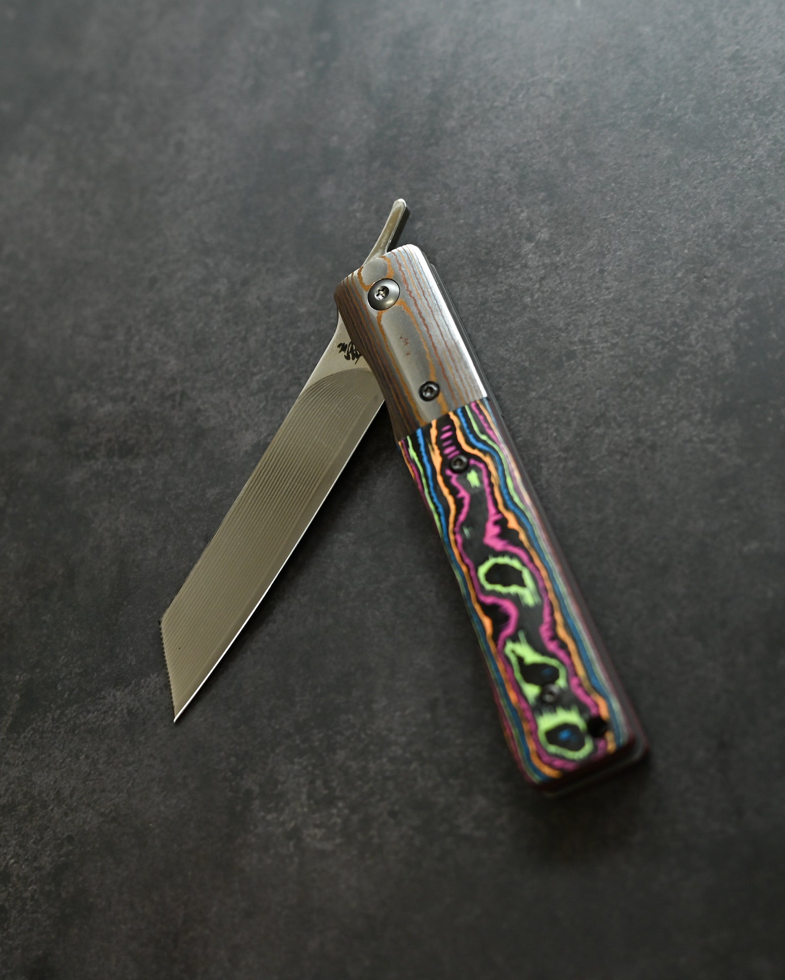 A Mokume-gane bolster flows seamlessly with the blade, while the Ceramic Carbon Fiber handle in Neon Lava finish offers lightweight durability with futuristic aesthetics.