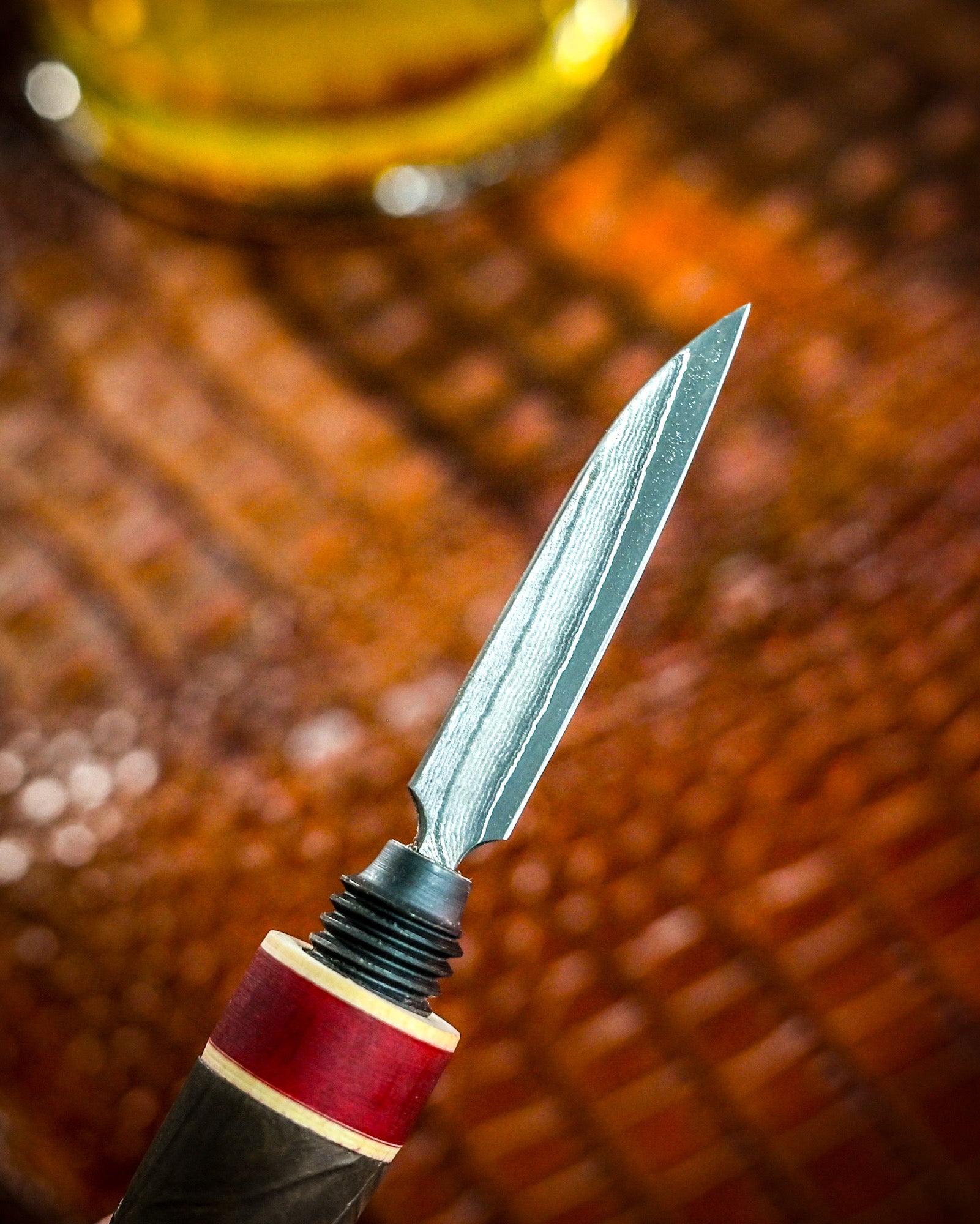 Inspired by the shape of a cigar, this compact piece features a twist-to-open threaded design that reveals a razor-sharp Damascus-patterned blade. A red ring near the handle adds a subtle design accent that enhances its sculptural appeal.