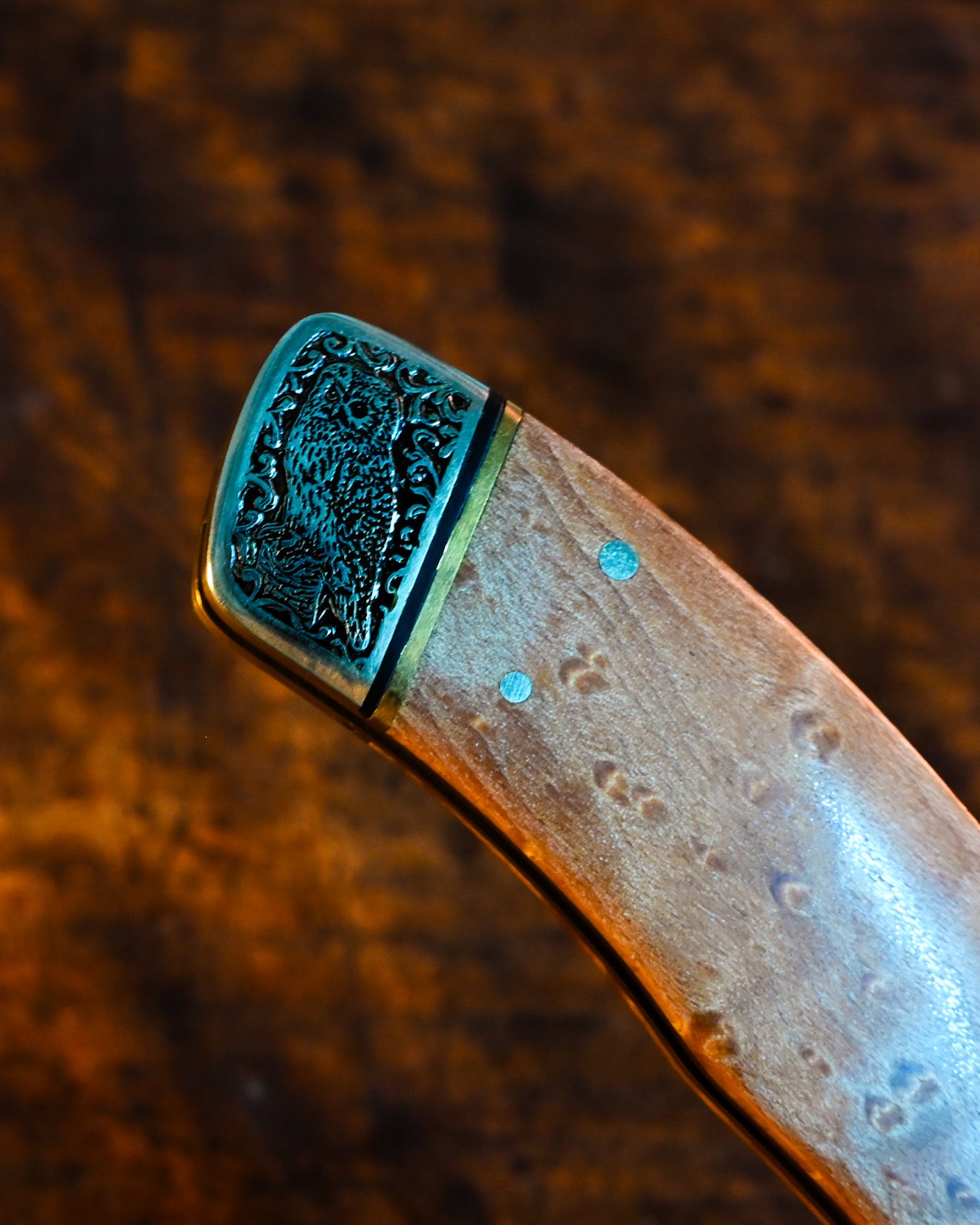 This exquisite folding knife is meticulously handcrafted by renowned Japanese artisan Katsuhiko Miura, blending natural wood, mother-of-pearl inlay, and fine metal engraving. More than just a tool, this knife is a true collector’s masterpiece.