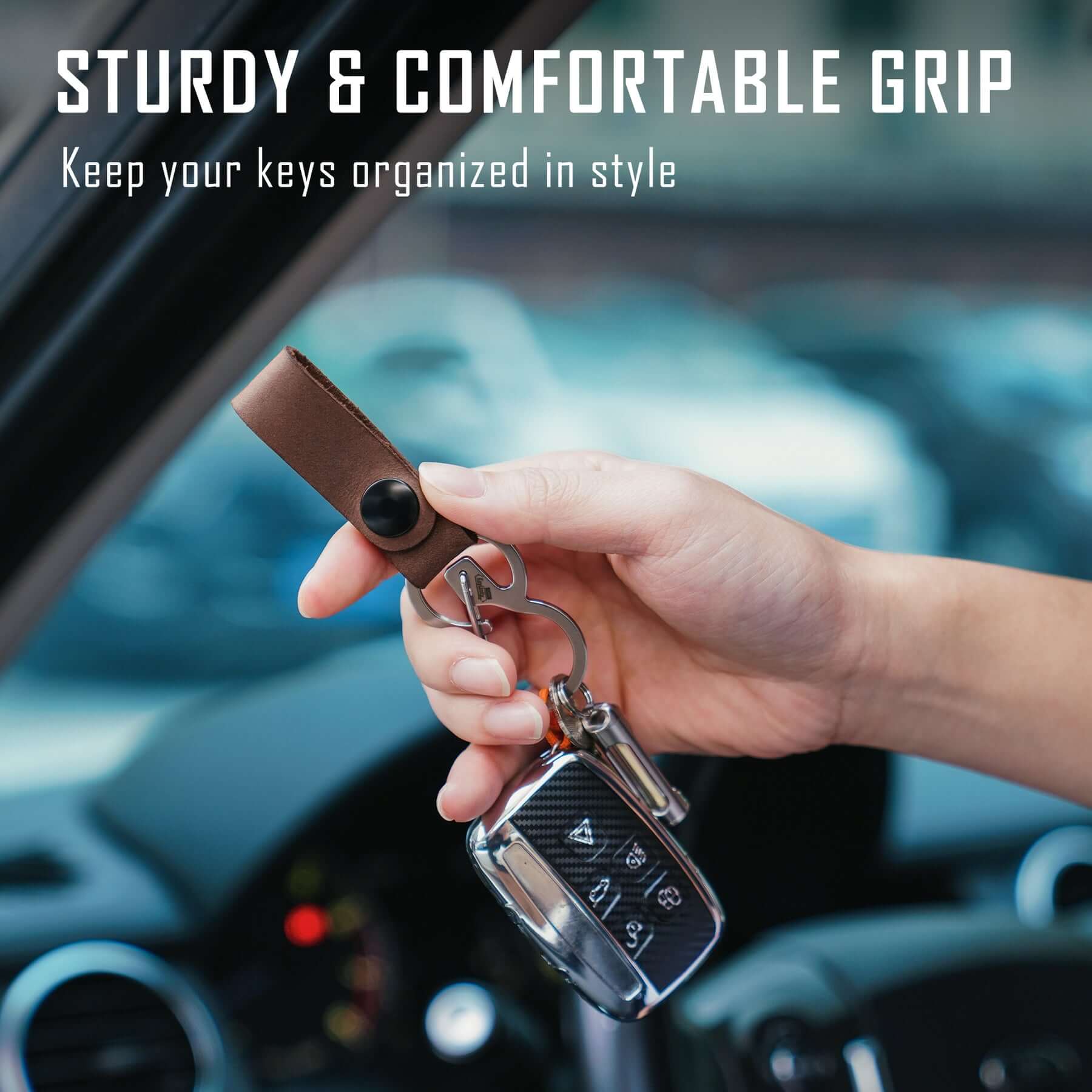- Highlight design: The leather strap is made of 100% real leather, which is used to connect the carabiner and key rings.