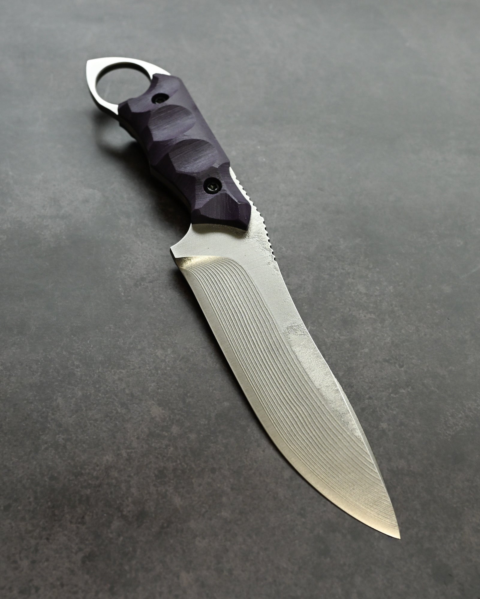 The Purple G10 handle offers a bold appearance and excellent grip, while the Kydex sheath ensures secure carry.