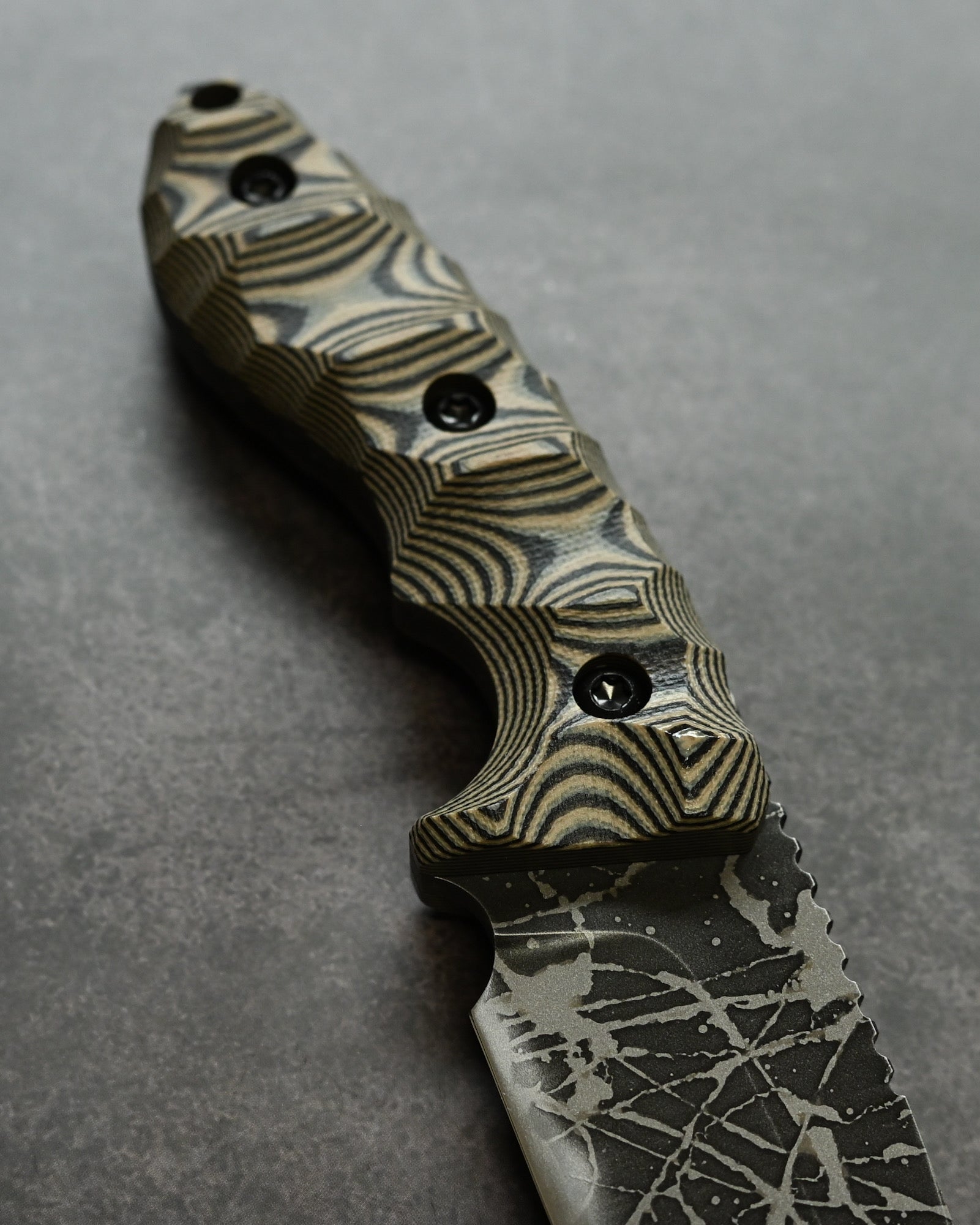 The handle is crafted from layered G-10, providing a secure grip with a unique wave pattern, while the Kydex sheath ensures reliable carry and protection.