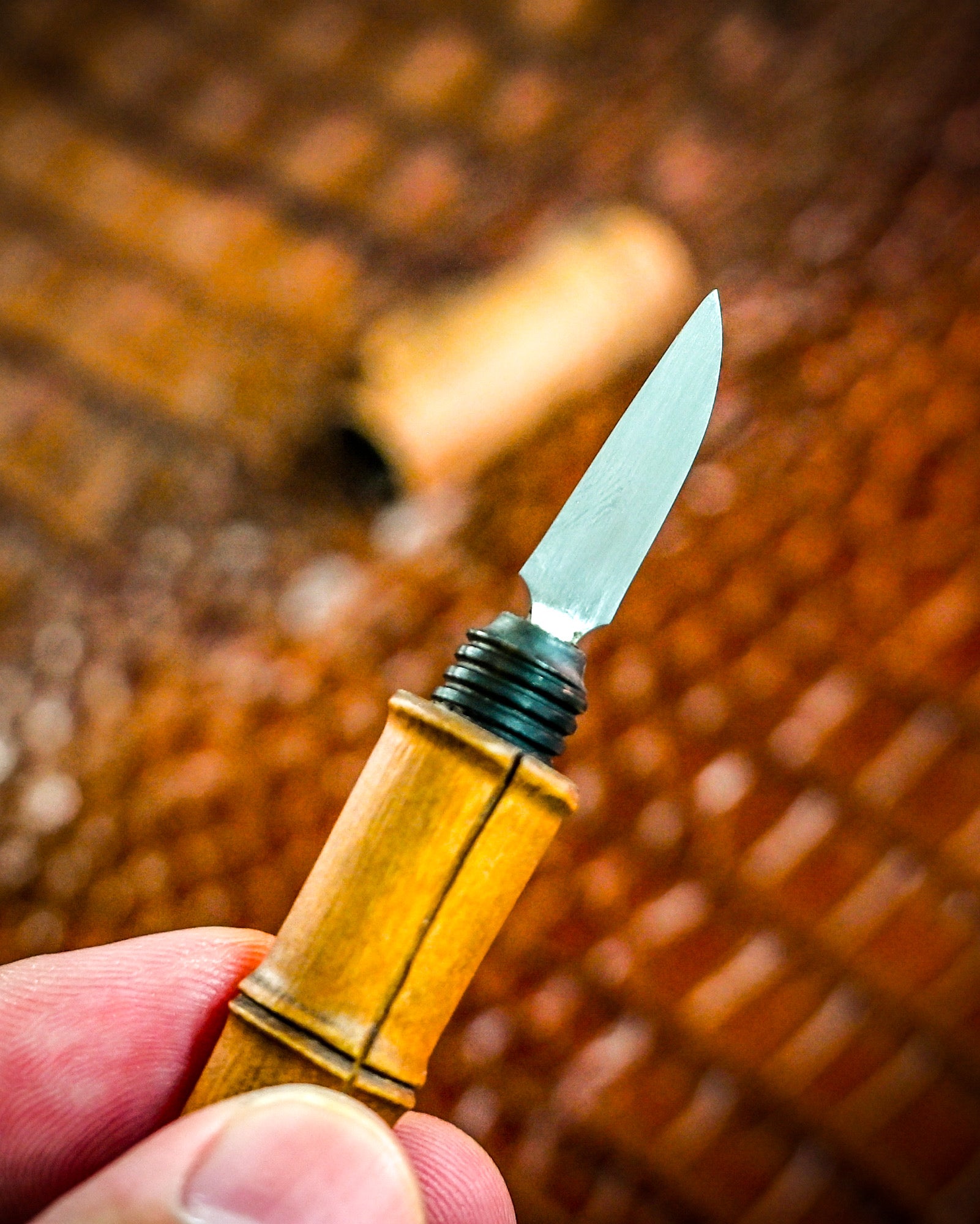 This compact knife features a stealthy twist-open mechanism, a textured exterior mimicking real carbon, and an elegant minimalism that makes it ideal as an EDC conversation piece or collectible art object.