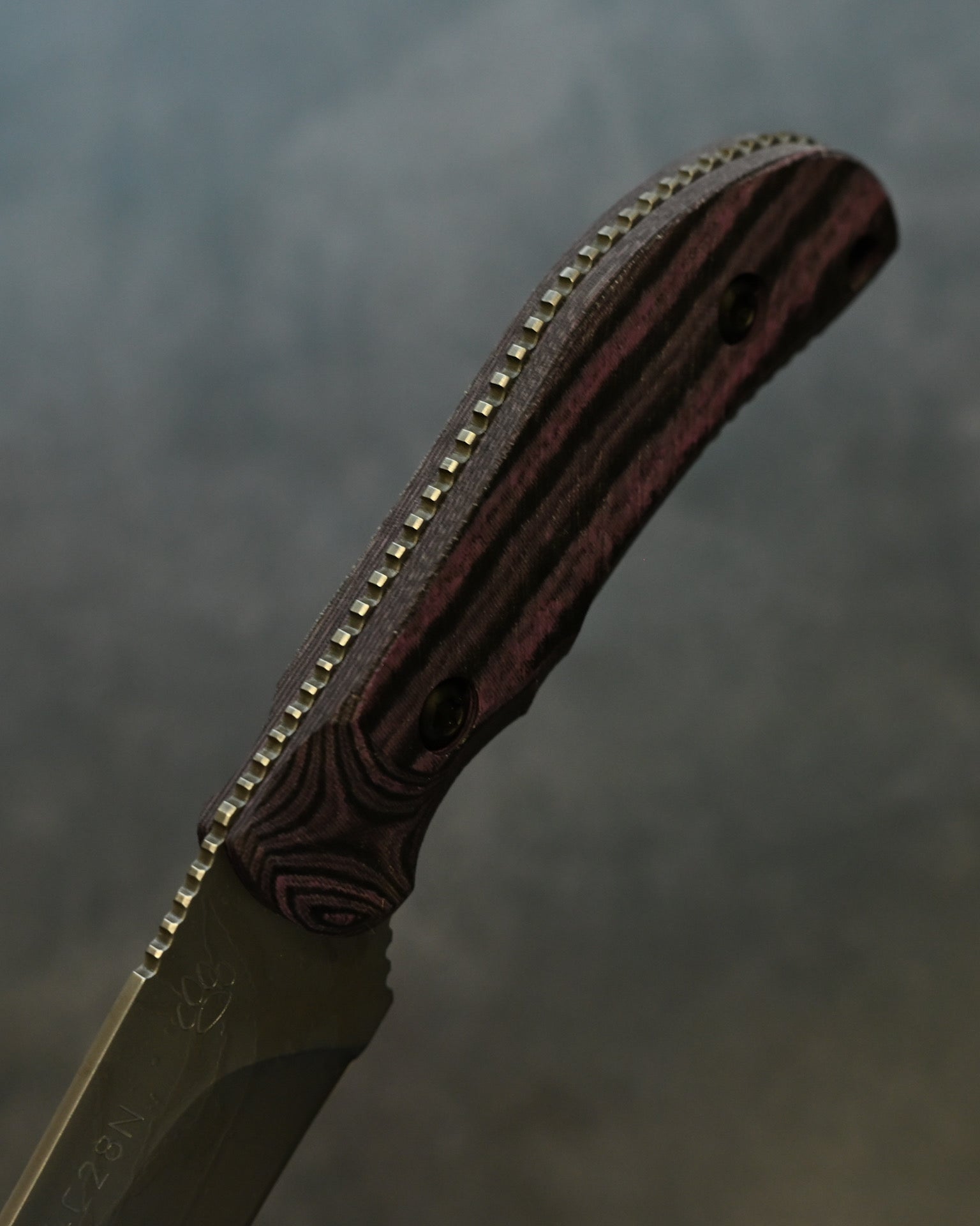 This model features a layered linen Micarta handle, weighing only 110 g (without sheath).