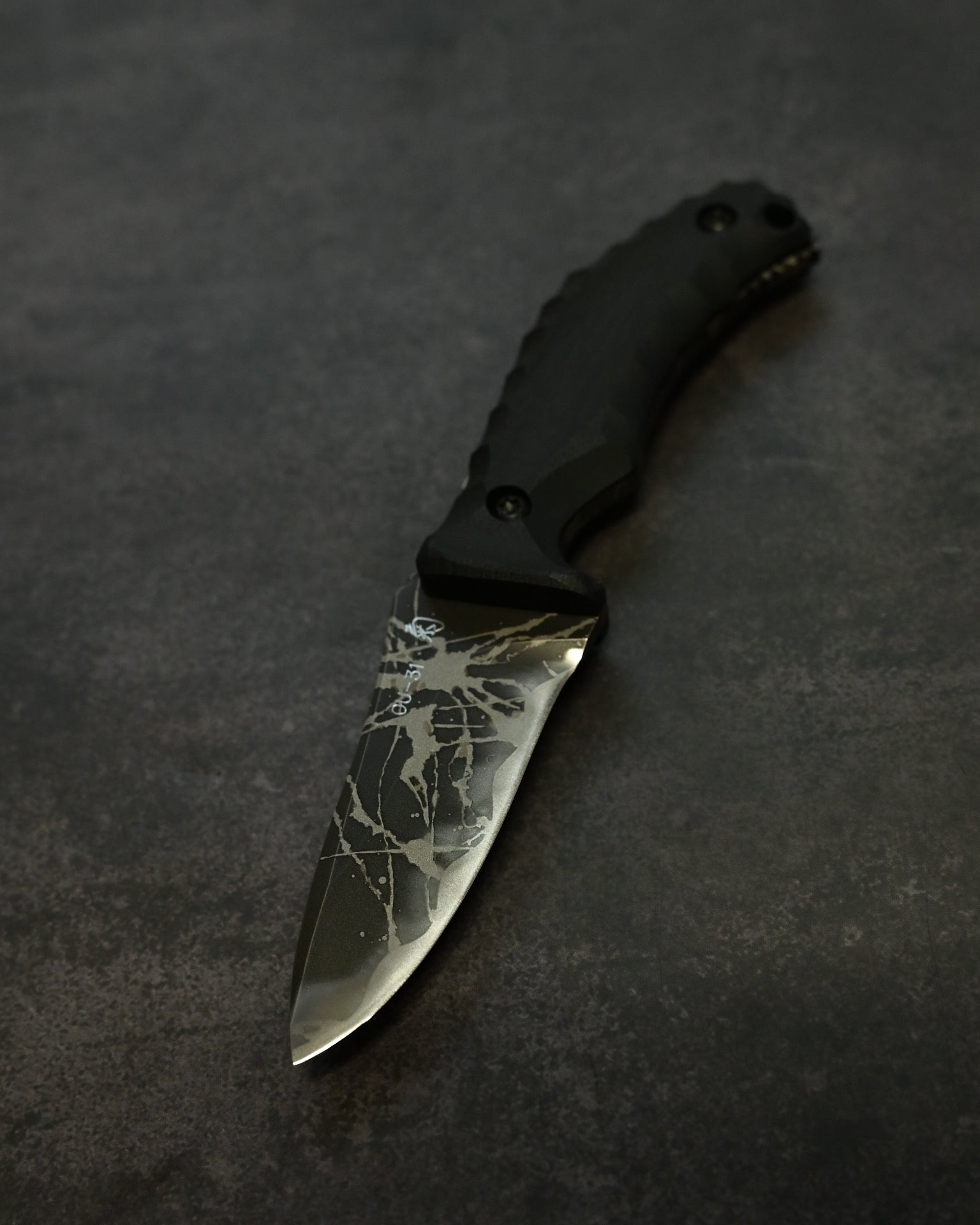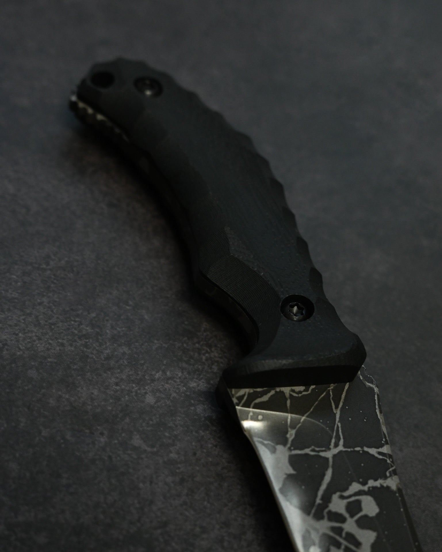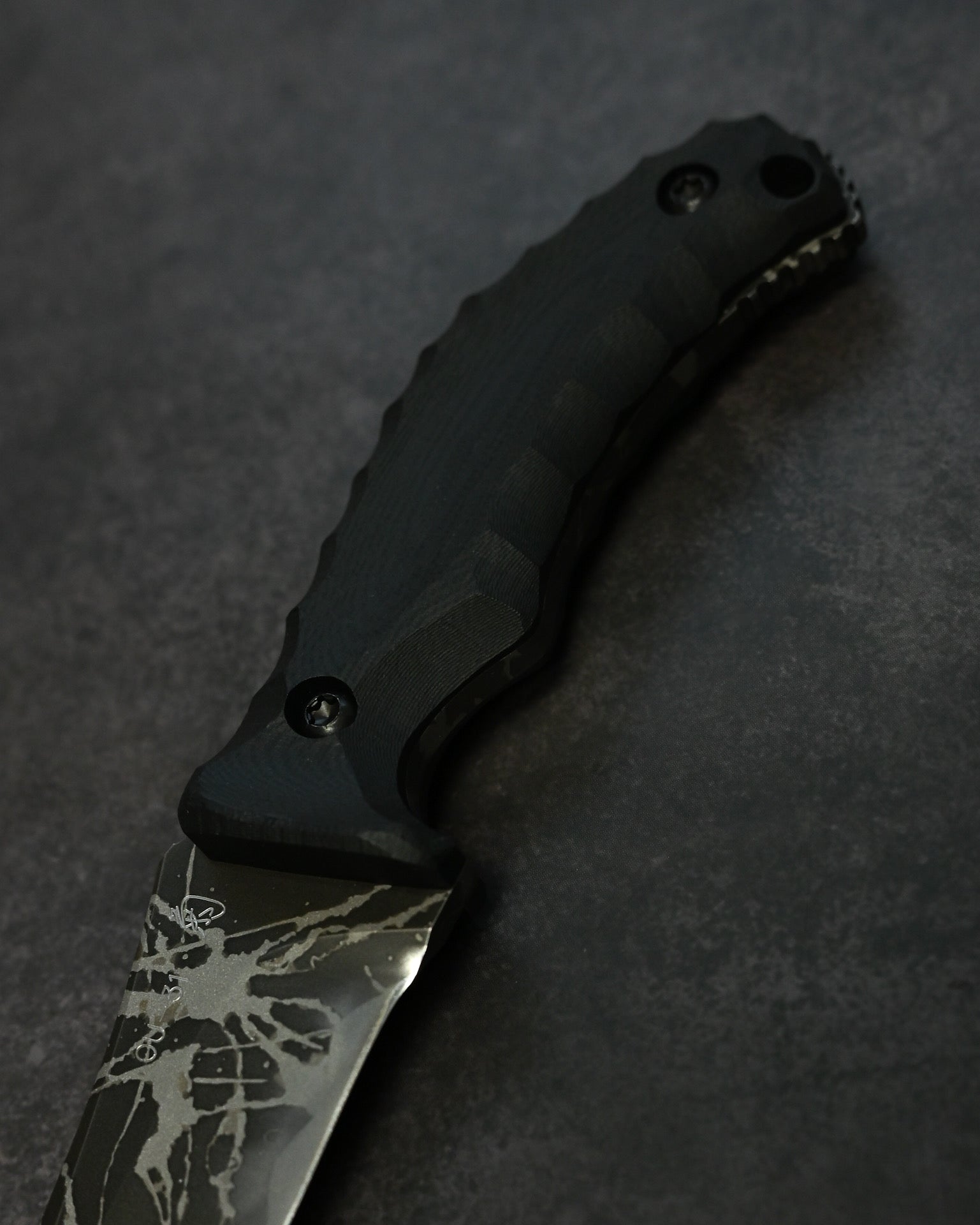 The three-dimensionally carved Black G10 handle offers excellent grip security, while the blade’s striking etched finish enhances both visual presence and durability.