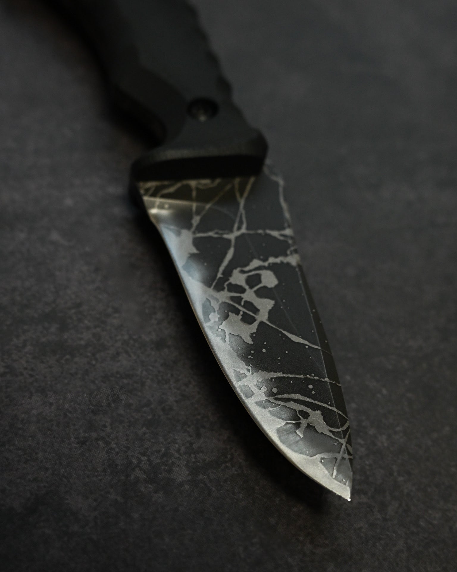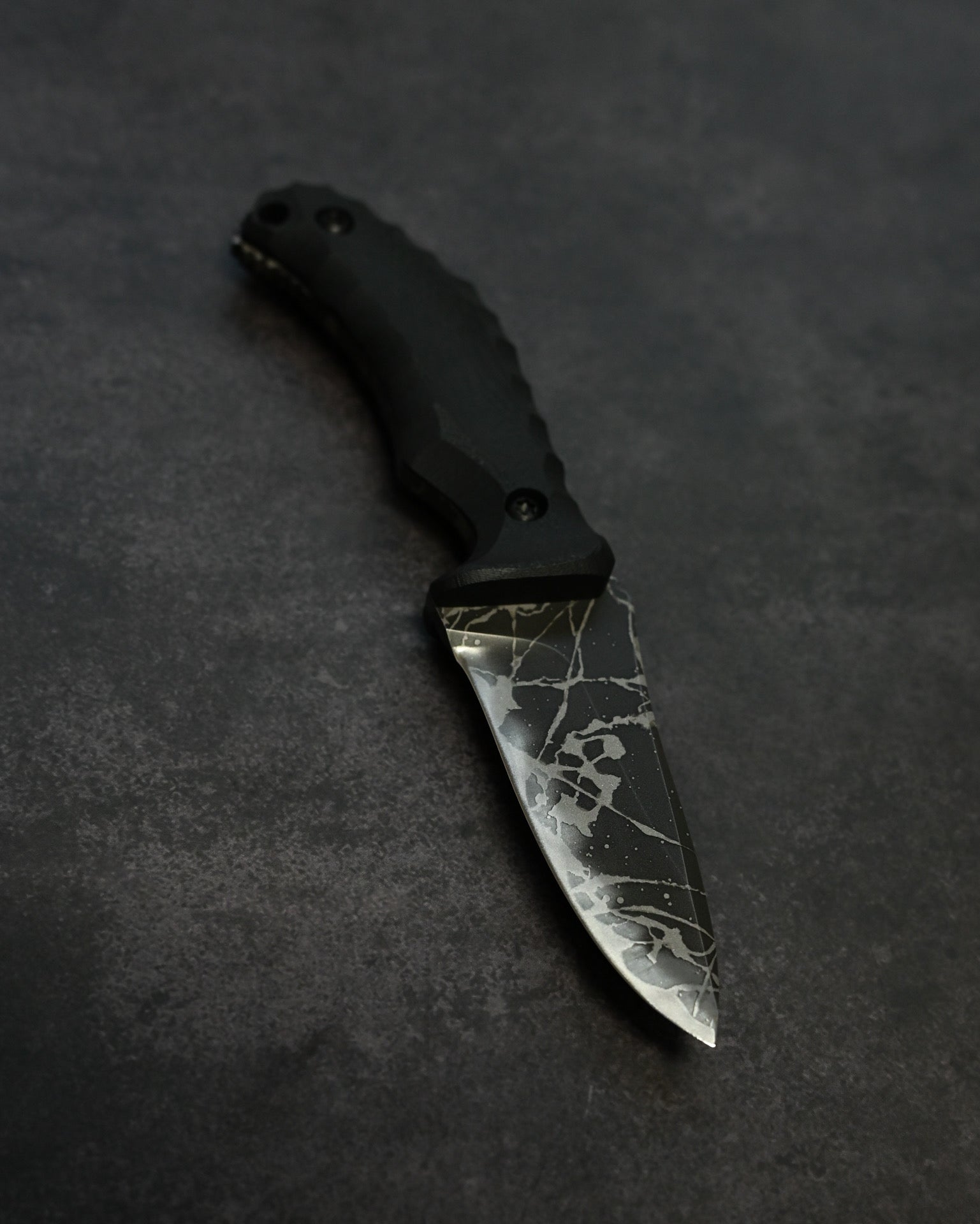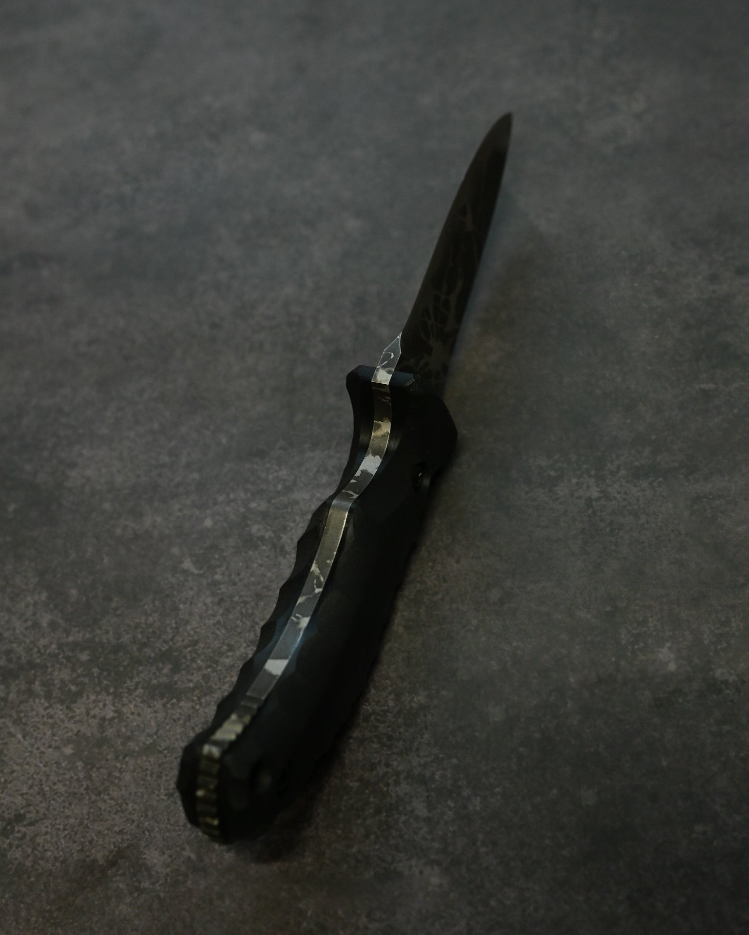 The three-dimensionally carved Black G10 handle offers excellent grip security, while the blade’s striking etched finish enhances both visual presence and durability.