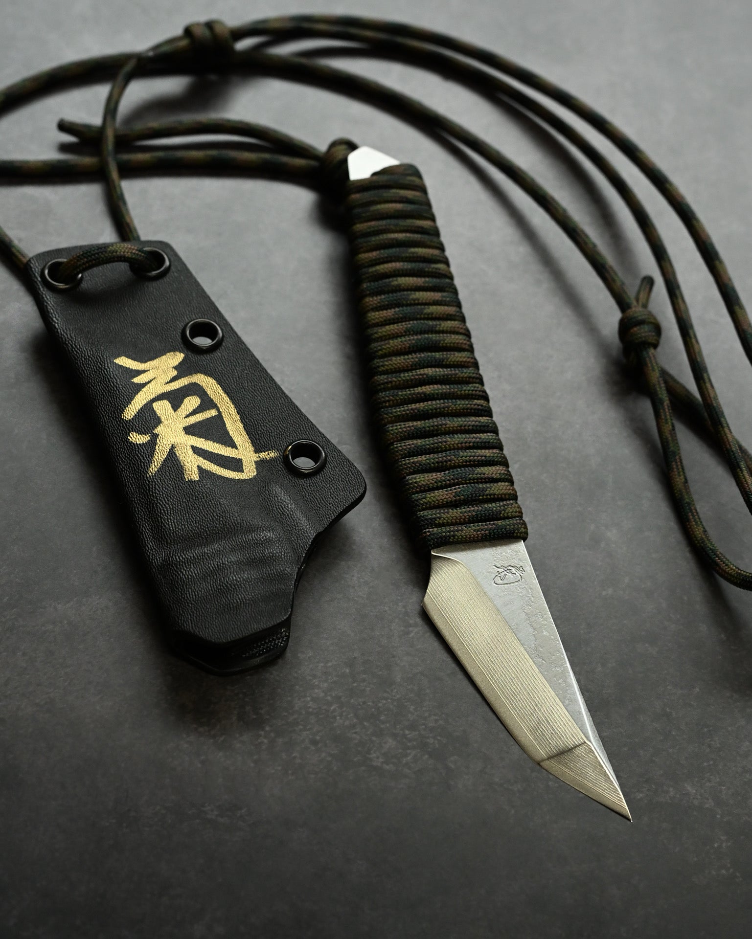 This knife is a Kiridashi-style compact fixed blade handcrafted by Japanese bladesmith Kiku Matsuda, known for his precise grinding and distinctive tactical aesthetics.