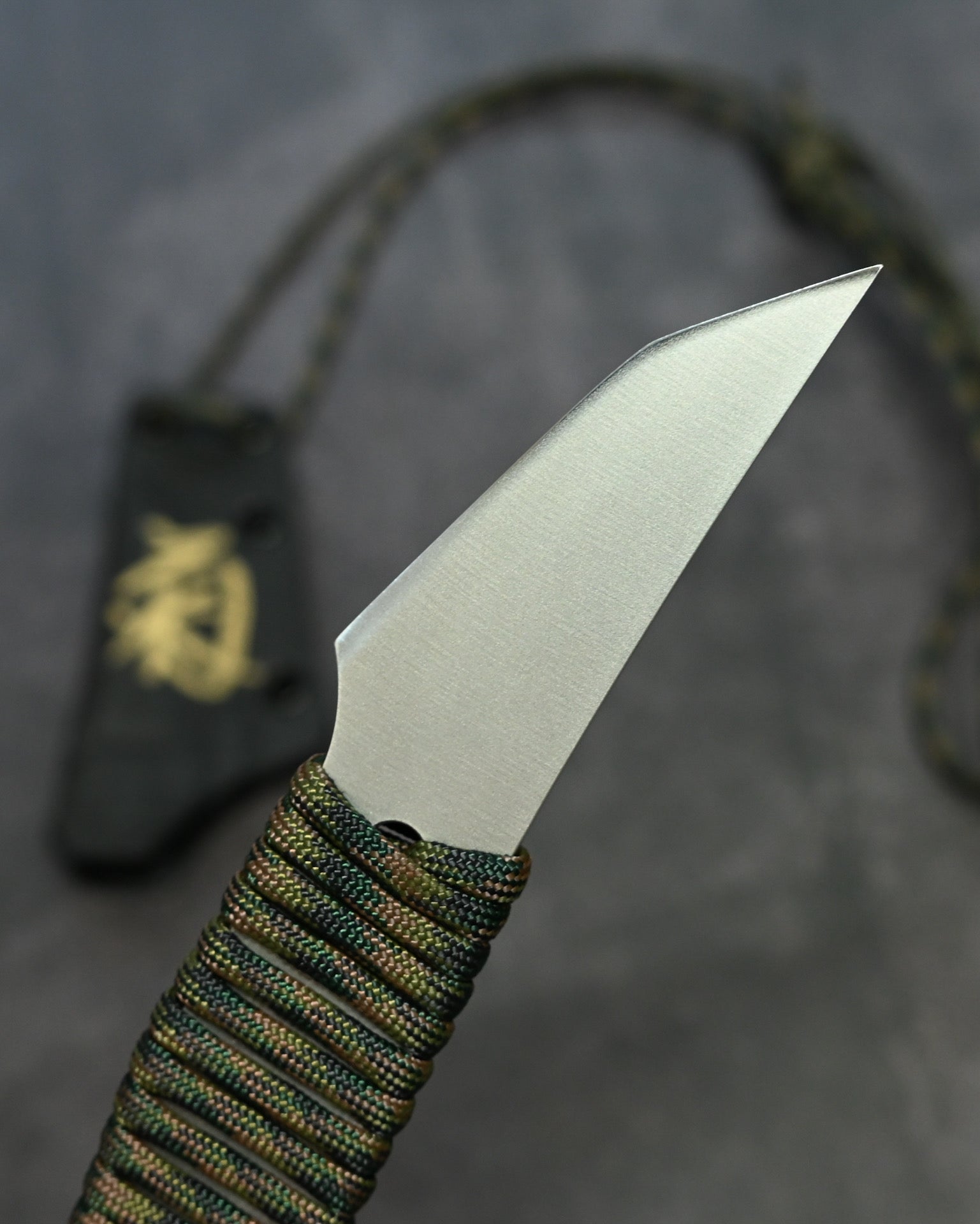 The handle features a G10 core wrapped with paracord, offering a secure grip with lightweight construction.