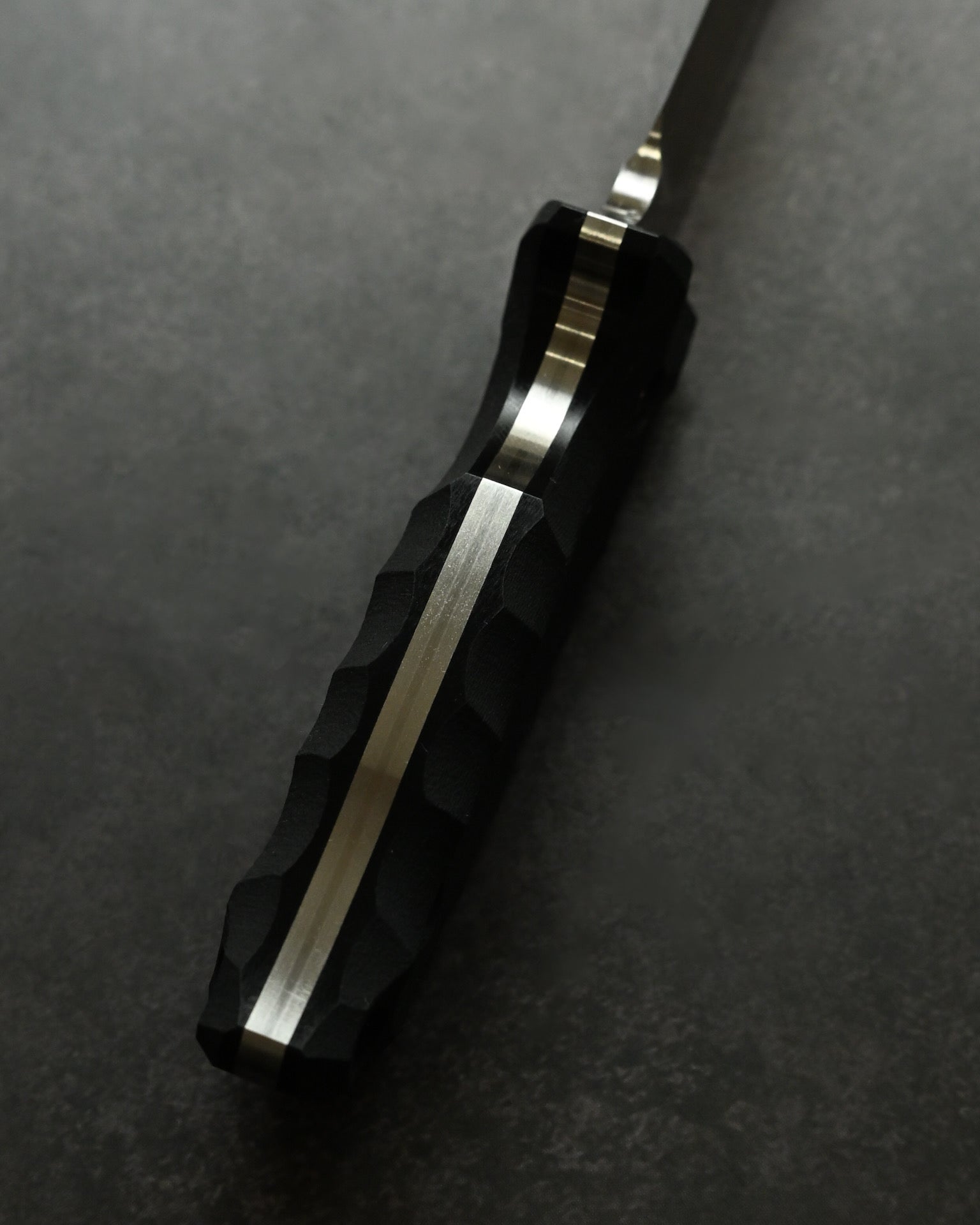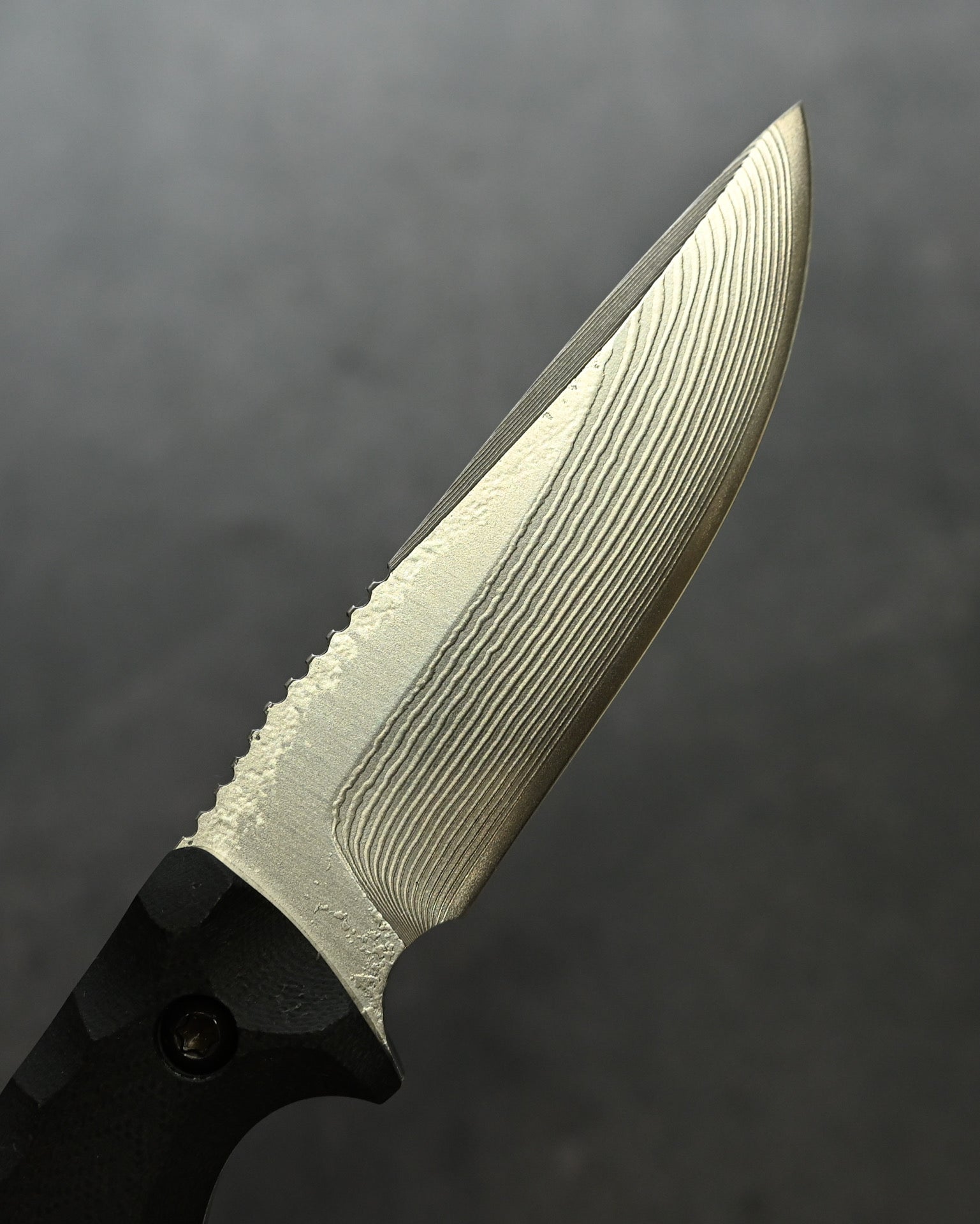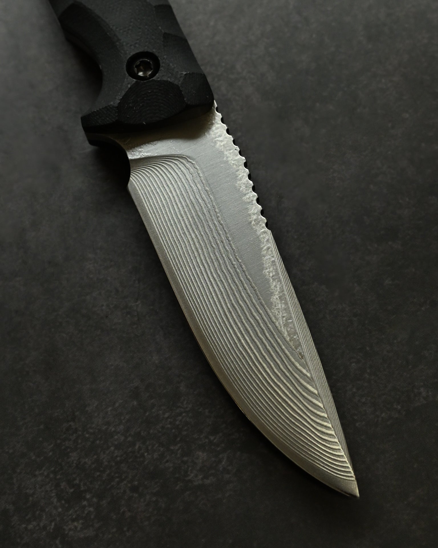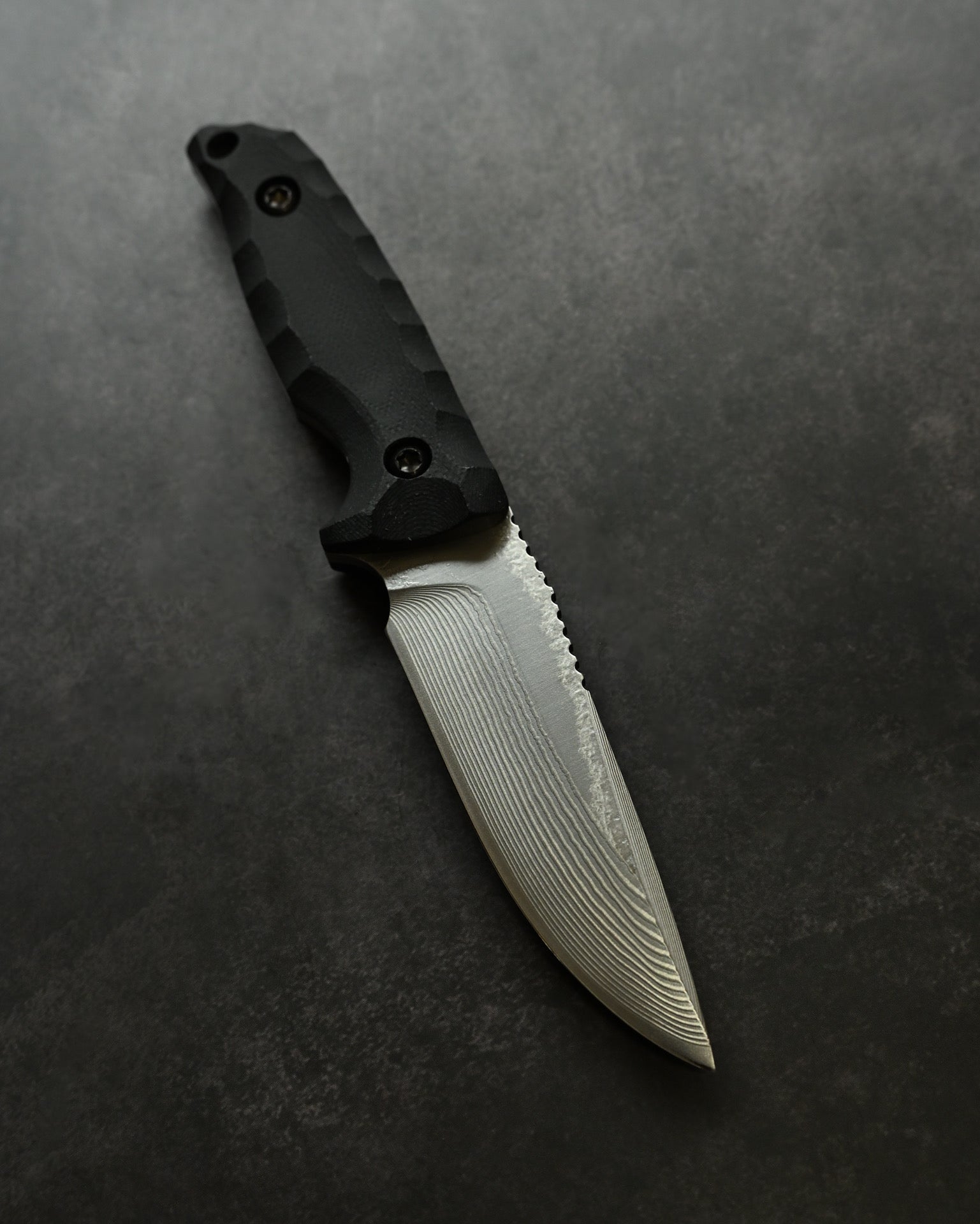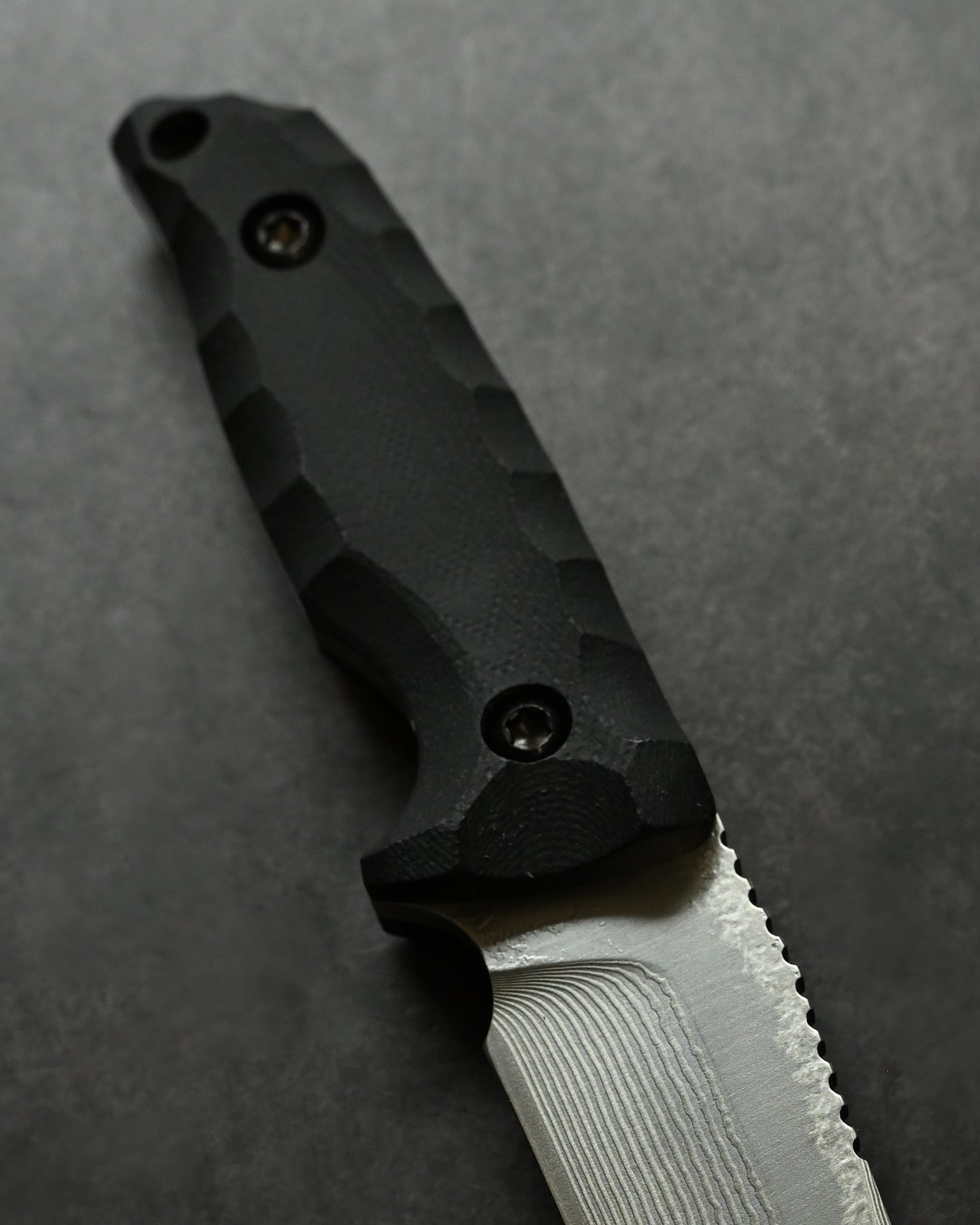 The handle is crafted from three-dimensionally machined black G10, providing excellent grip, durability, and weather resistance.