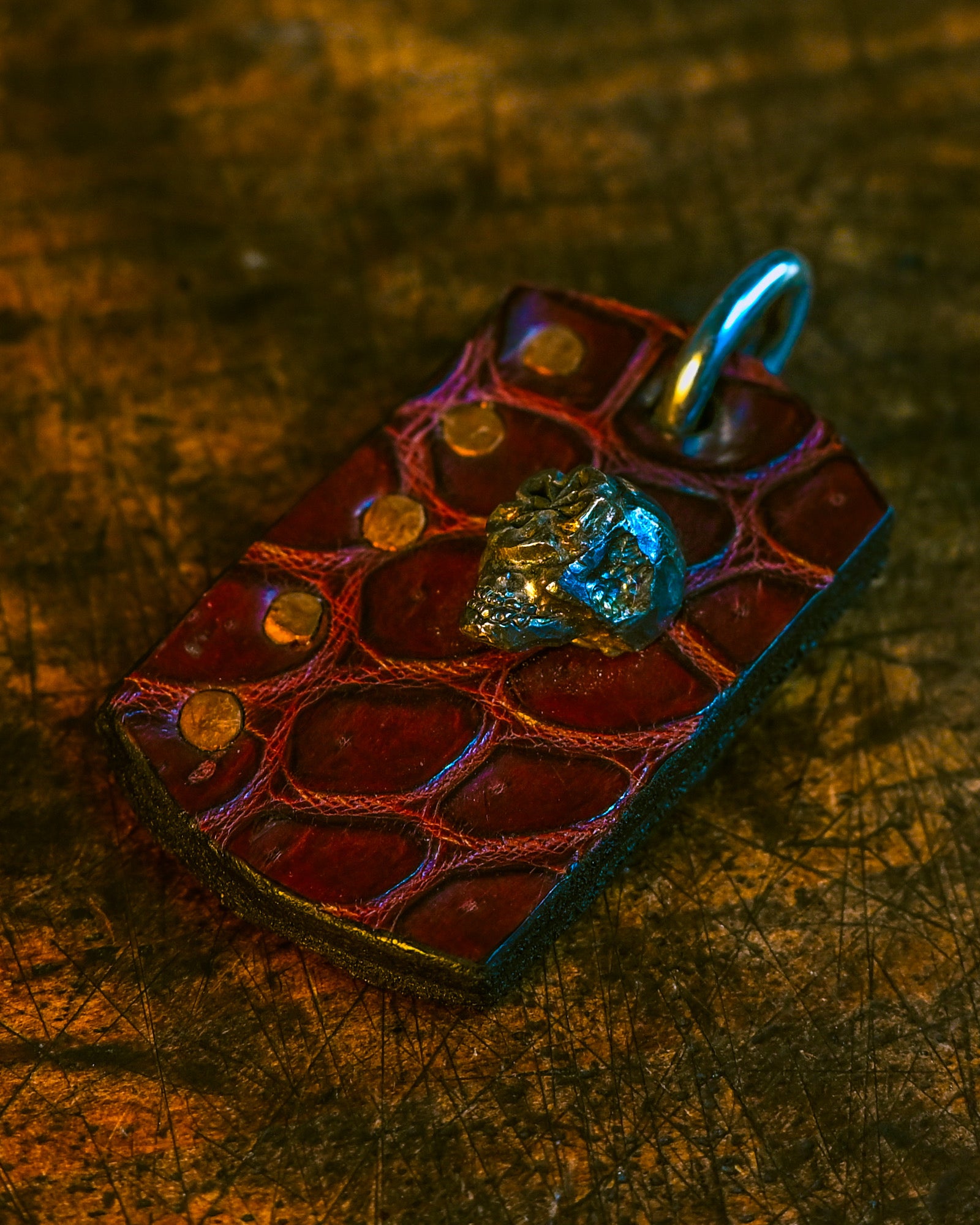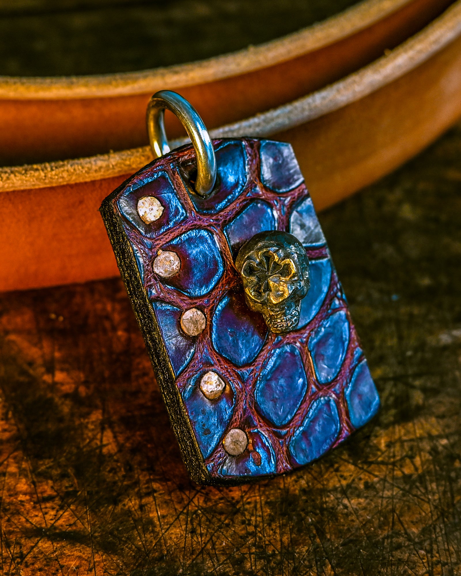 This unique dog tag-style pendant, designed and handcrafted by Wtopia Works in September 2024, embodies a bold vintage aesthetic. Made with a blend of alligator and bear leather, accented by copper rivets, and inlaid with 925 silver and brass ginkgo flower and skull, it’s full of character and beauty. The top features a 925 silver ring (inner diameter 0.49 inches / 12.5 mm), making it easy to wear as a pendant. The rich contrasts and textures bring out a stunning array of colors, making this a one-of-a-kind accessory.