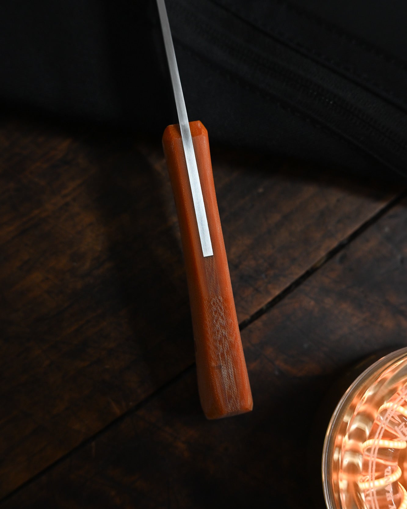 The Morimoto Yusuke Handmade Outdoor Hunting Knife is a limited edition piece showcased at the 2025 Kyoto Exhibition, embodying the perfect fusion of traditional Japanese craftsmanship and modern functional design. The blade is made from Japanese VG10 stainless steel, renowned for its exceptional sharpness and corrosion resistance, and features a hand-brushed finish that enhances its refined texture and durability. The handle, crafted from Micarta, offers a comfortable, non-slip grip with a 15mm thickness, ensuring a secure hold in all conditions. Equipped with a lightweight and durable Kydex sheath, this knife is easy to carry and safely store, making it an ideal choice for outdoor adventures, hunting, and everyday use.