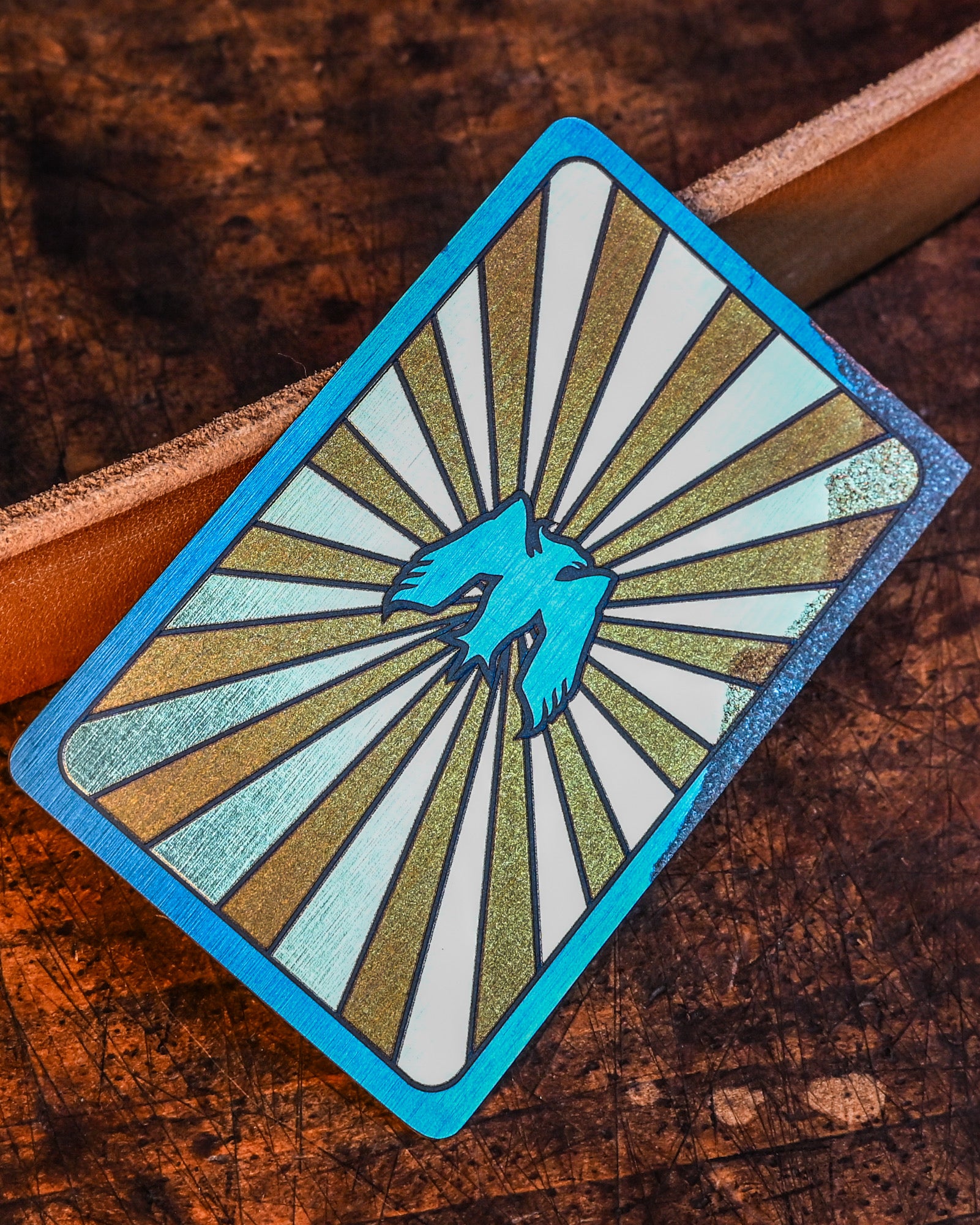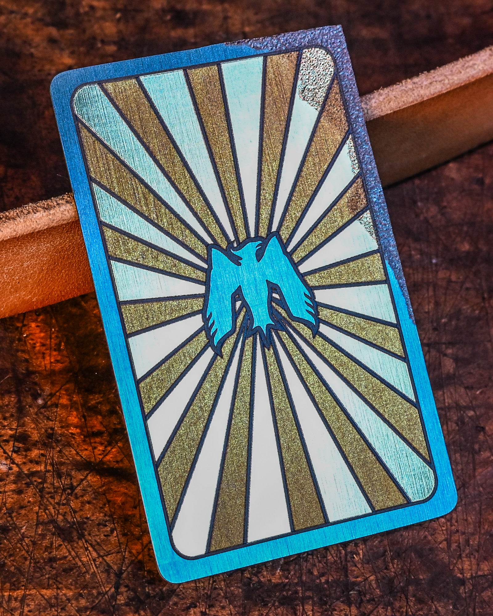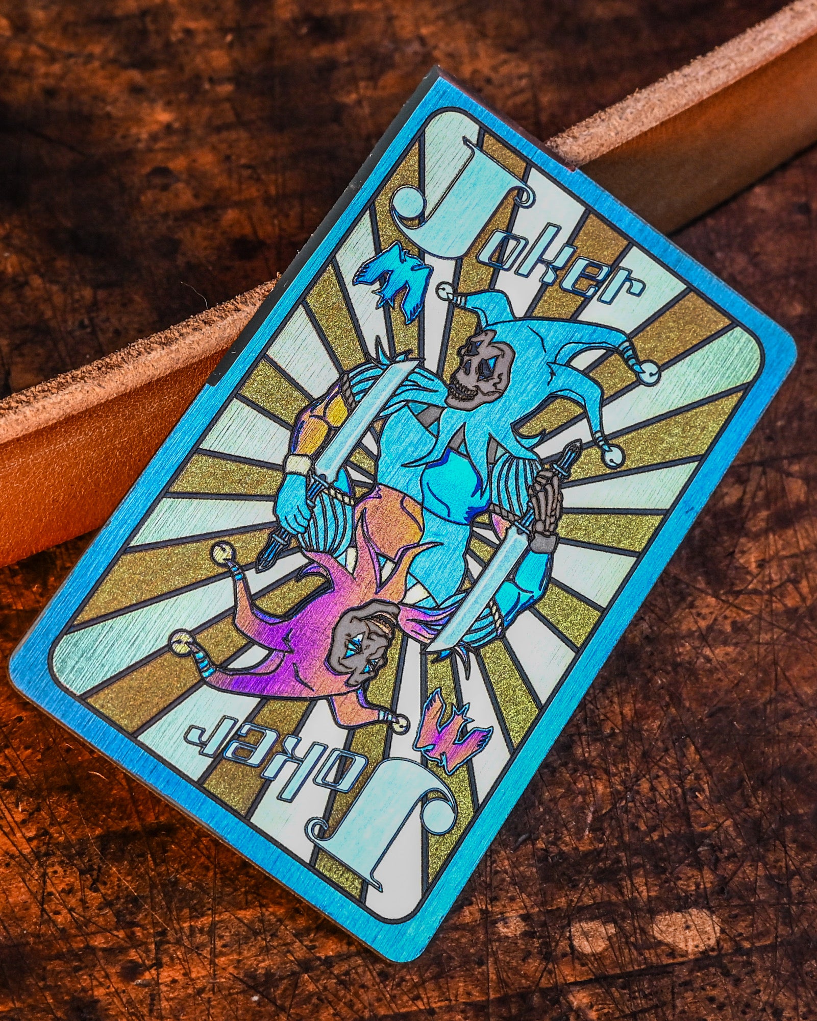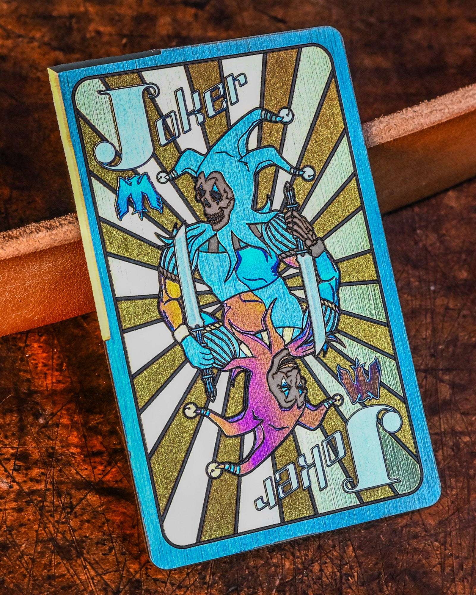 Crafted by Mummert Knives, this titanium card knife blends the iconic imagery of a Joker and an eagle, bringing both whimsy and strength into one unique piece. The Joker skeleton on the front embodies unpredictability and playfulness, while the radiating rays and eagle emblem on the back symbolize power and courage. Perfect for both collectors and everyday users, this card knife combines artistry with functionality, making it ideal for tasks like opening boxes and letters.