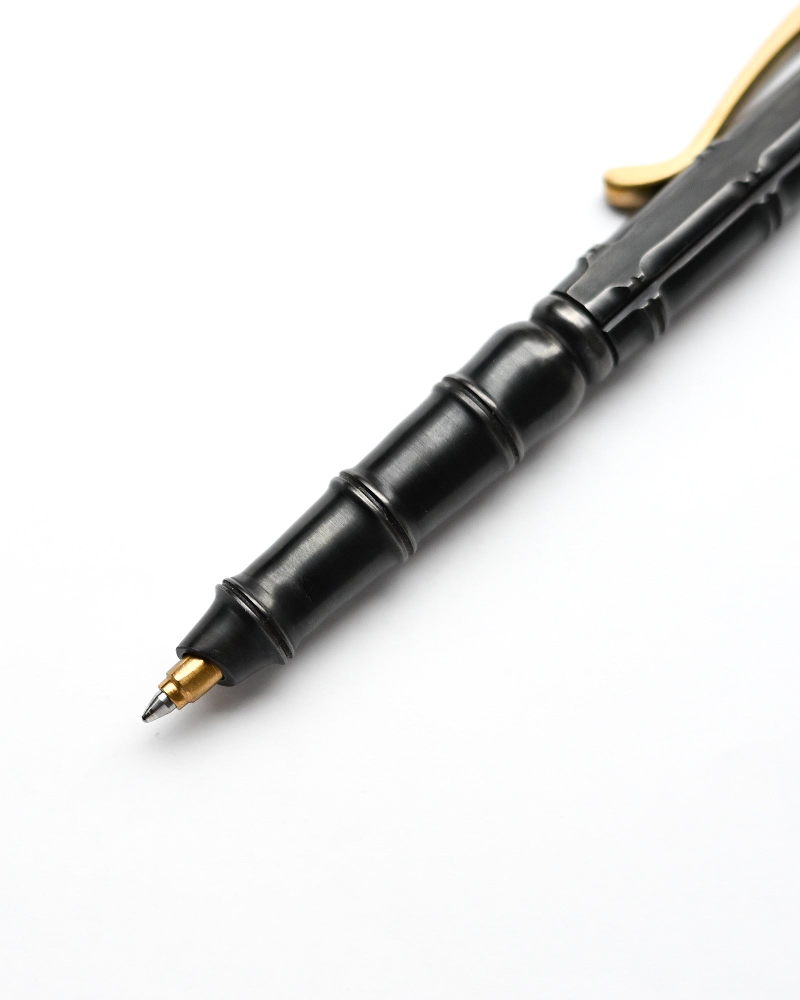 The pen body is made of high-quality stainless steel with a blackened finish, giving it a deep, sleek look while enhancing durability against corrosion and wear. The grip features a bamboo-style structure, providing a comfortable hold and adding an elegant touch of Japanese craftsmanship. The clip and select details are crafted from brass, creating a refined contrast and a vintage industrial feel.