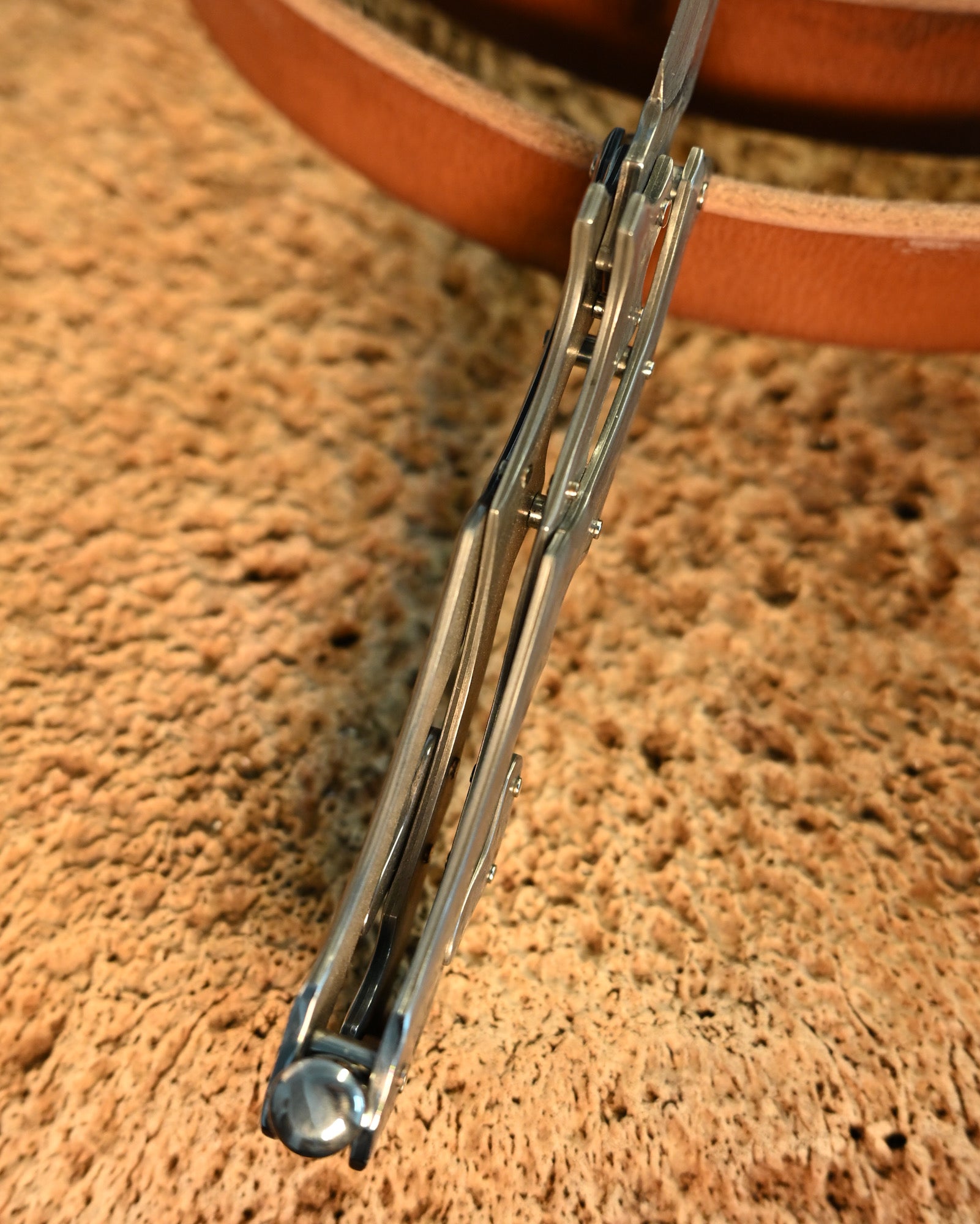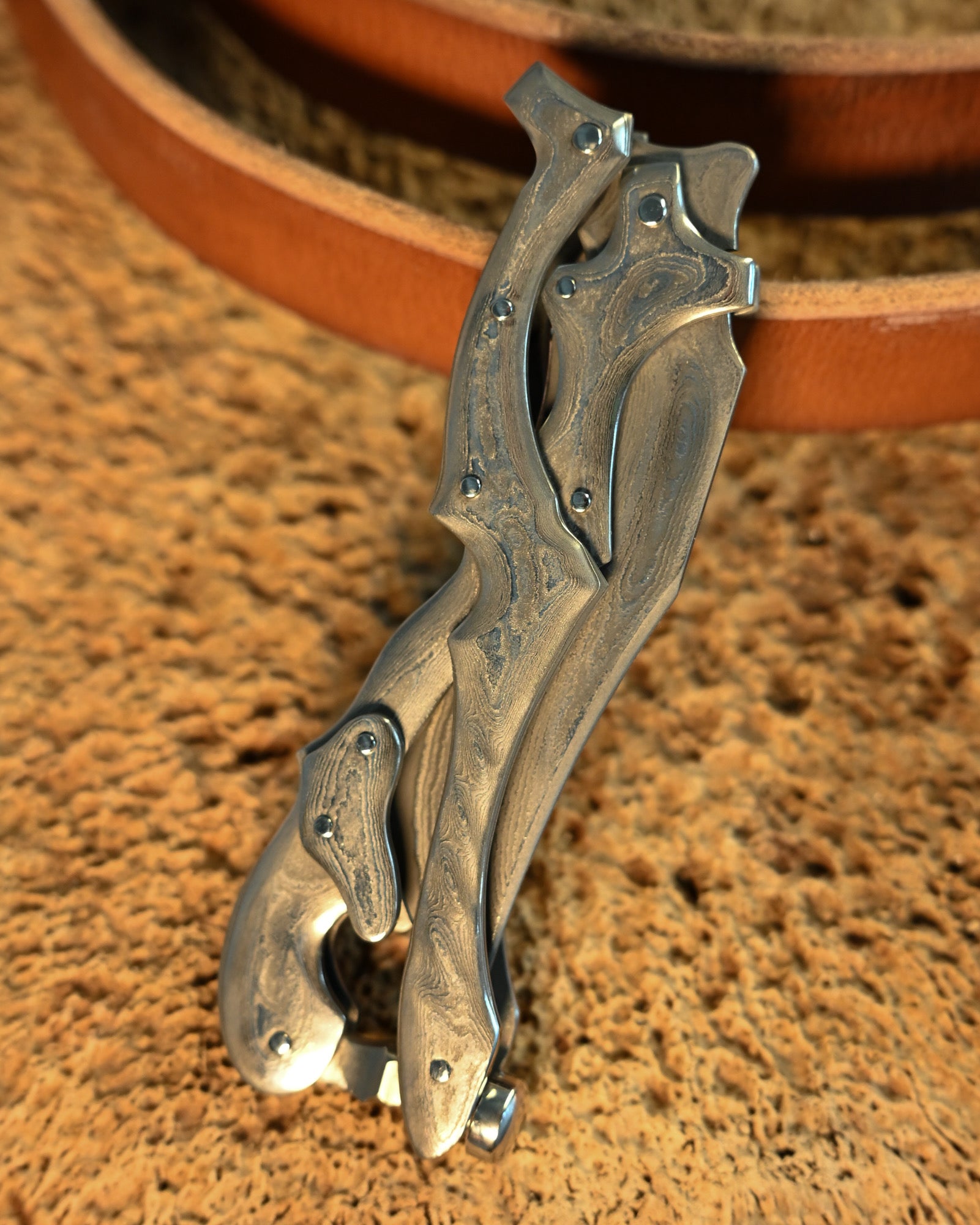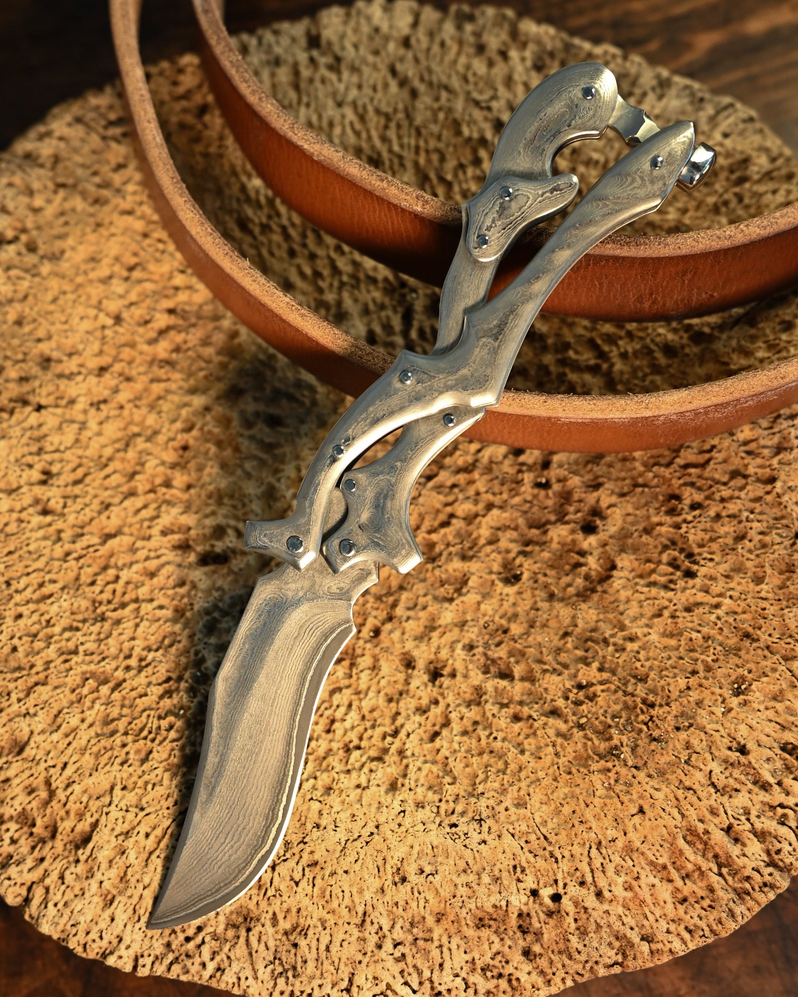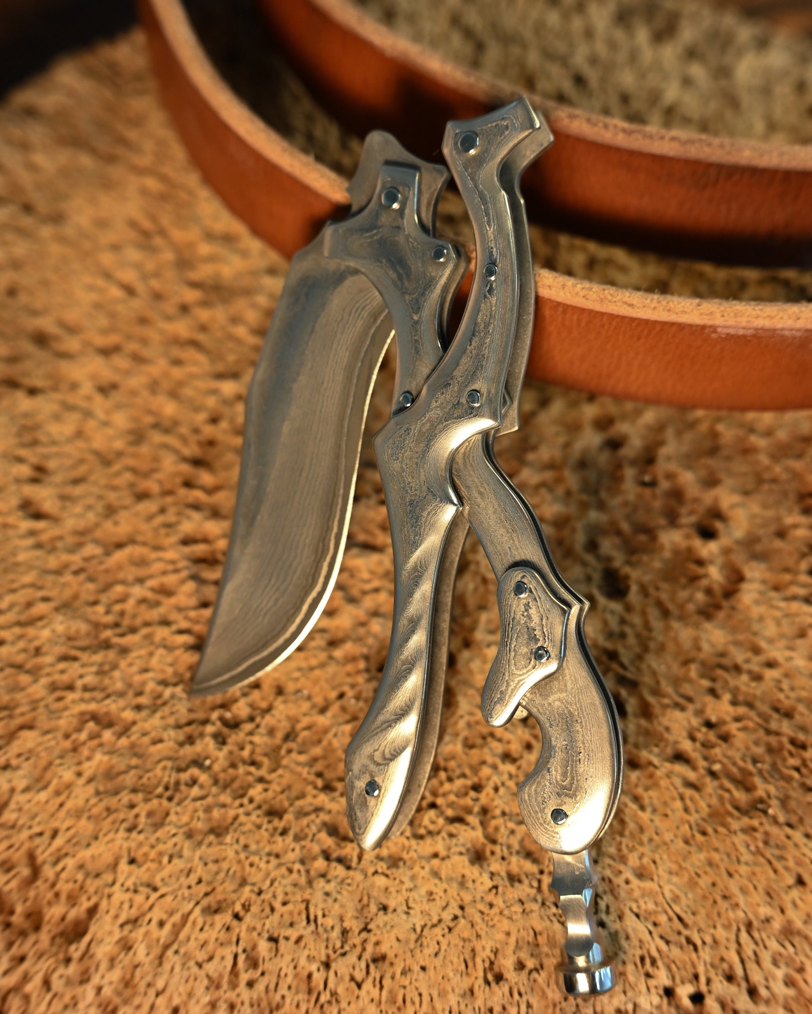 This folding knife features a high-quality Damascus steel blade, ensuring exceptional durability and sharpness. The meticulously designed handle, inspired by natural forms and modern artistic elements, showcases Nakayama Hidetoshi’s attention to detail. Its compact folding design makes it ideal for everyday carry, whether for outdoor use or daily tasks.