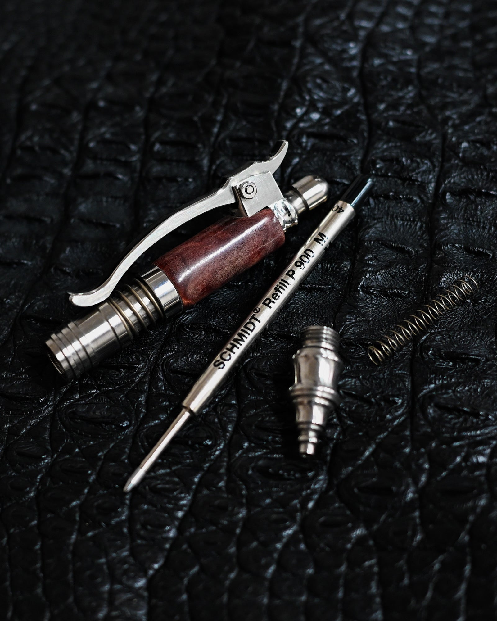 Crafted by Japanese artisan Nakayama Hidetoshi, this handmade tactical pen features a smooth twist-action mechanism housed in a solid stainless steel body. The grip section is made from rare, hand-polished burlwood, offering a warm contrast to the mechanical precision of the steel.