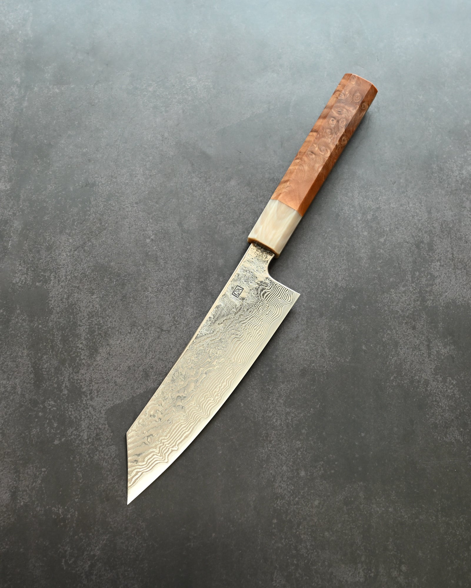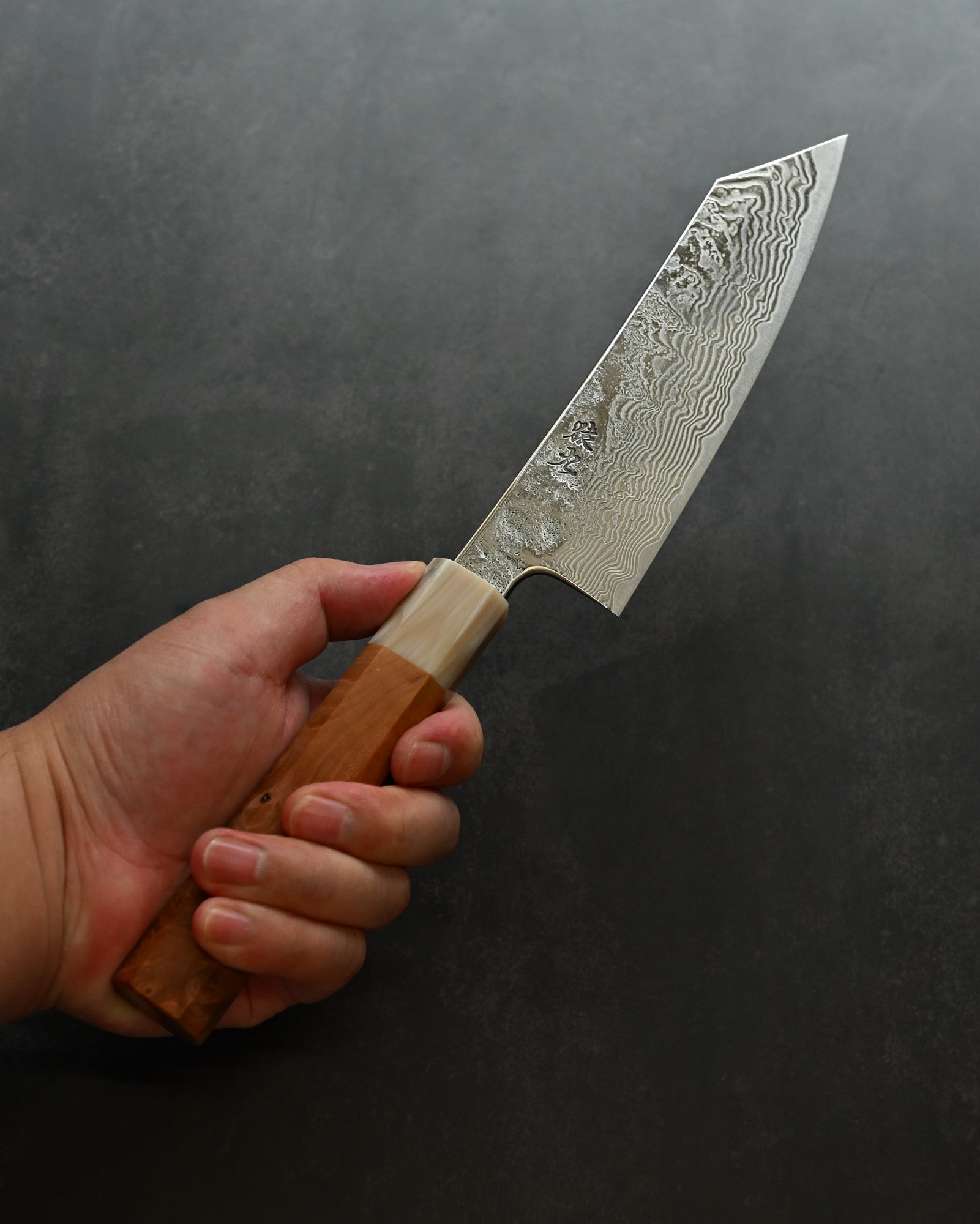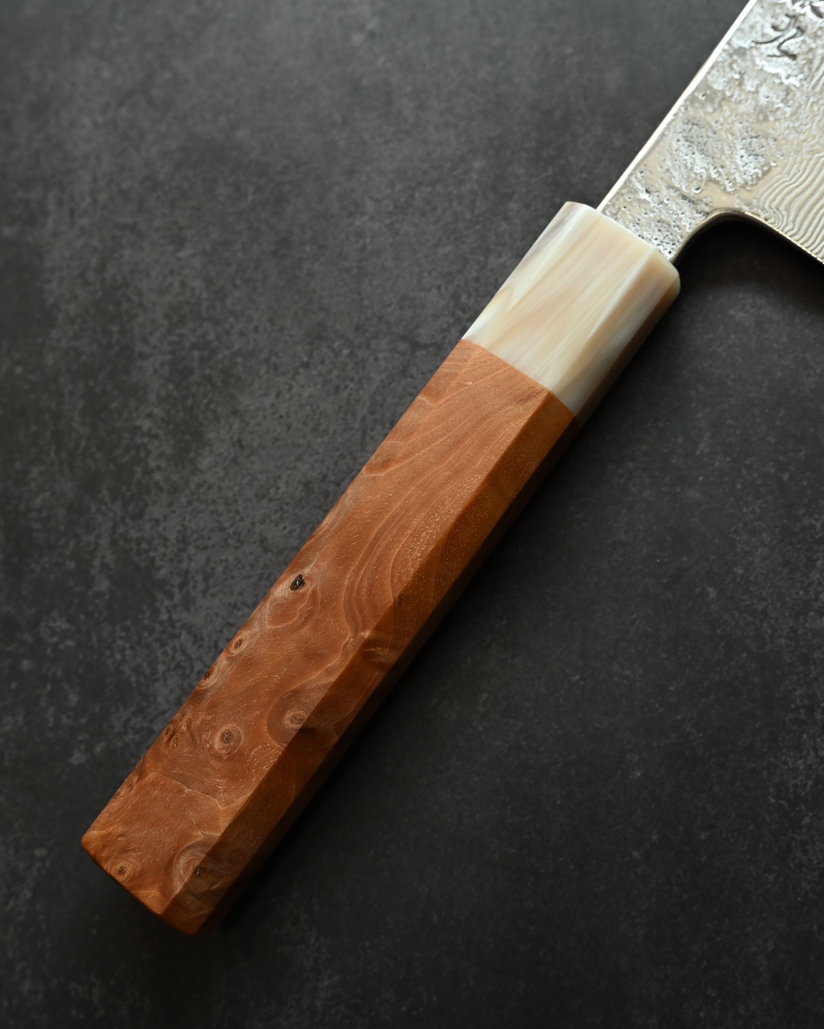 Saruku Homura-Un Knife 165mm Japanese Kitchen Knife SPG2 Damascus Burl Wood Handle Buffalo Horn Ferrule