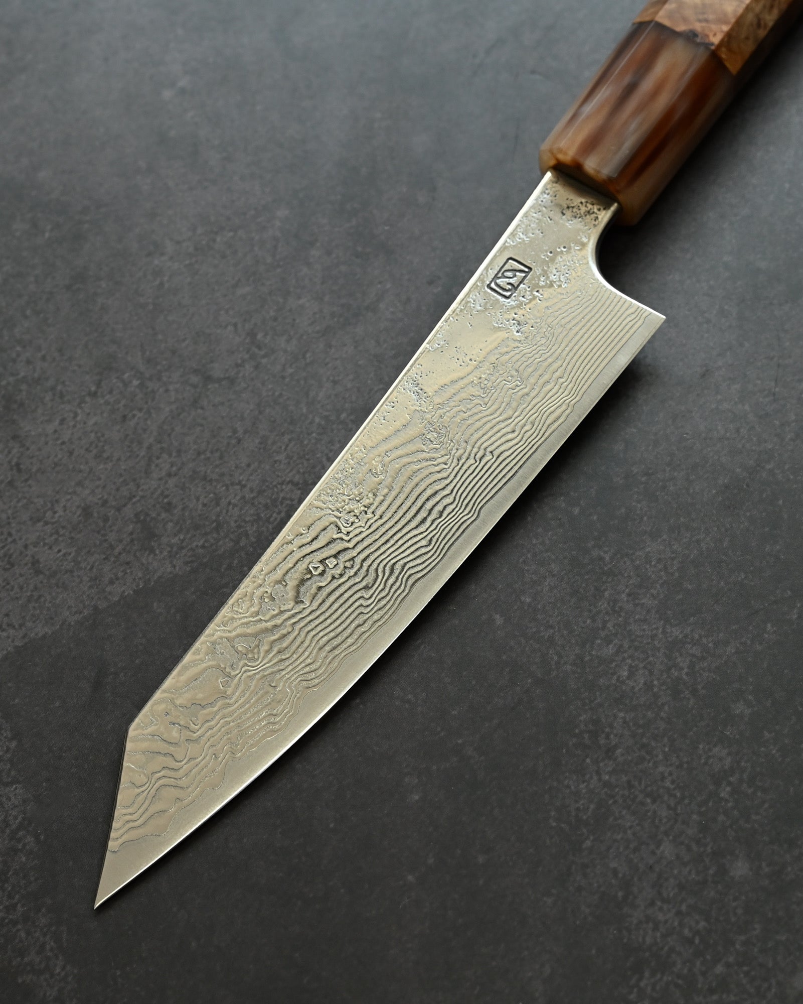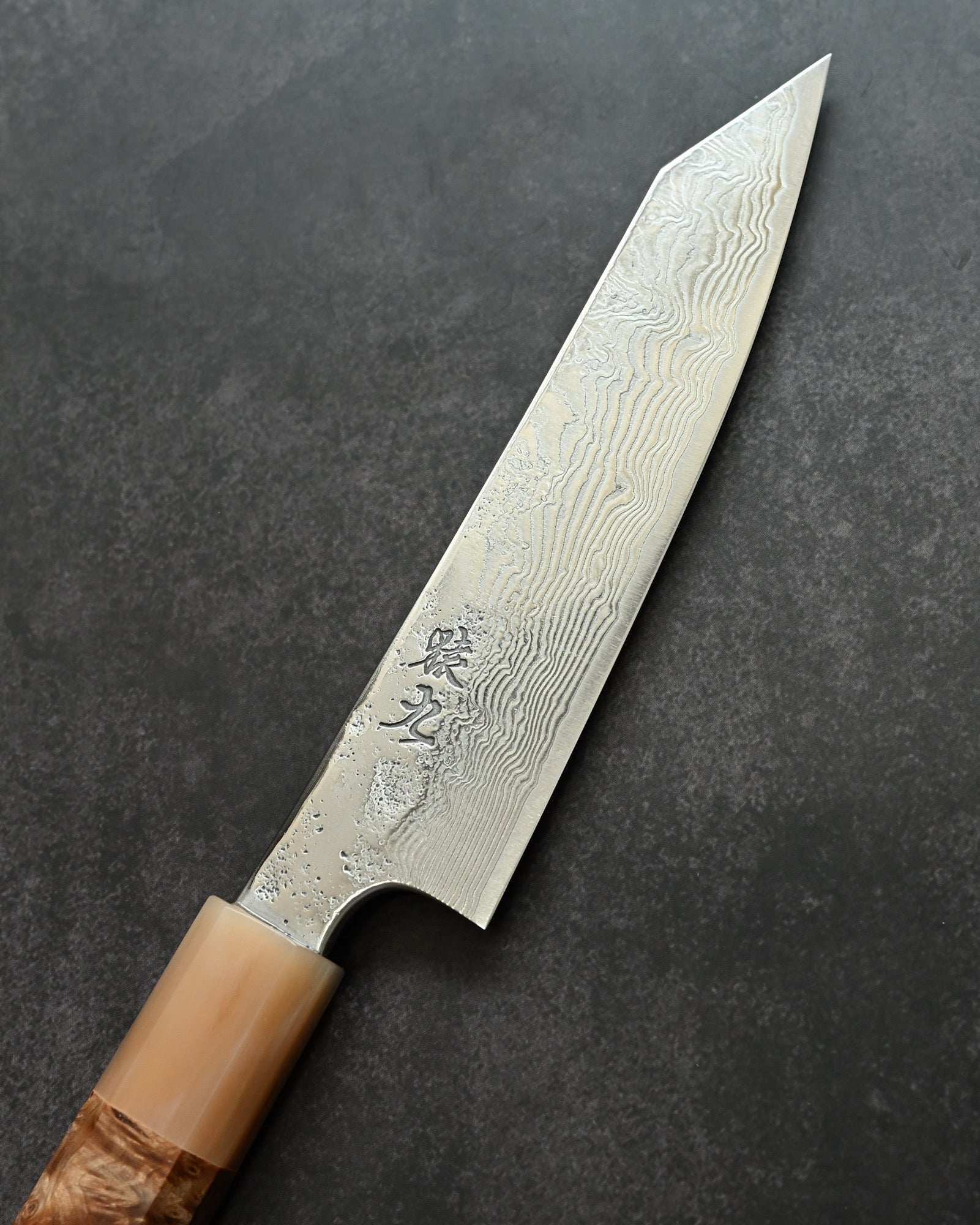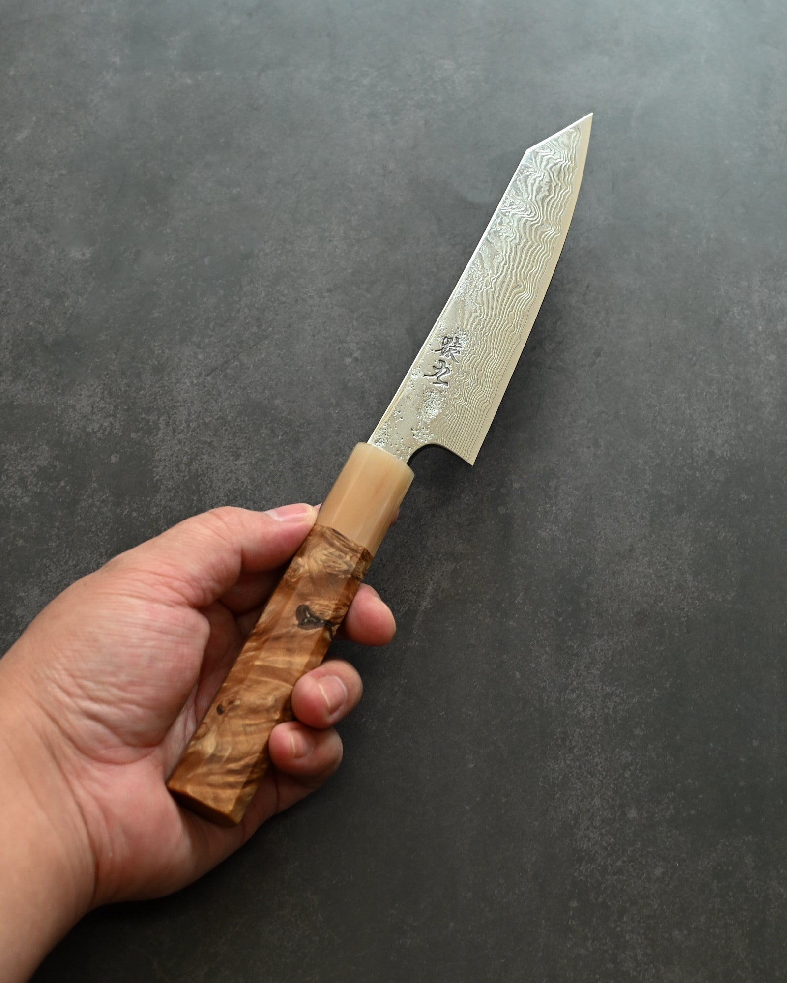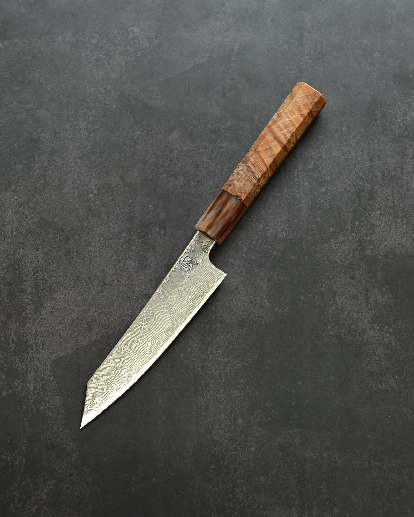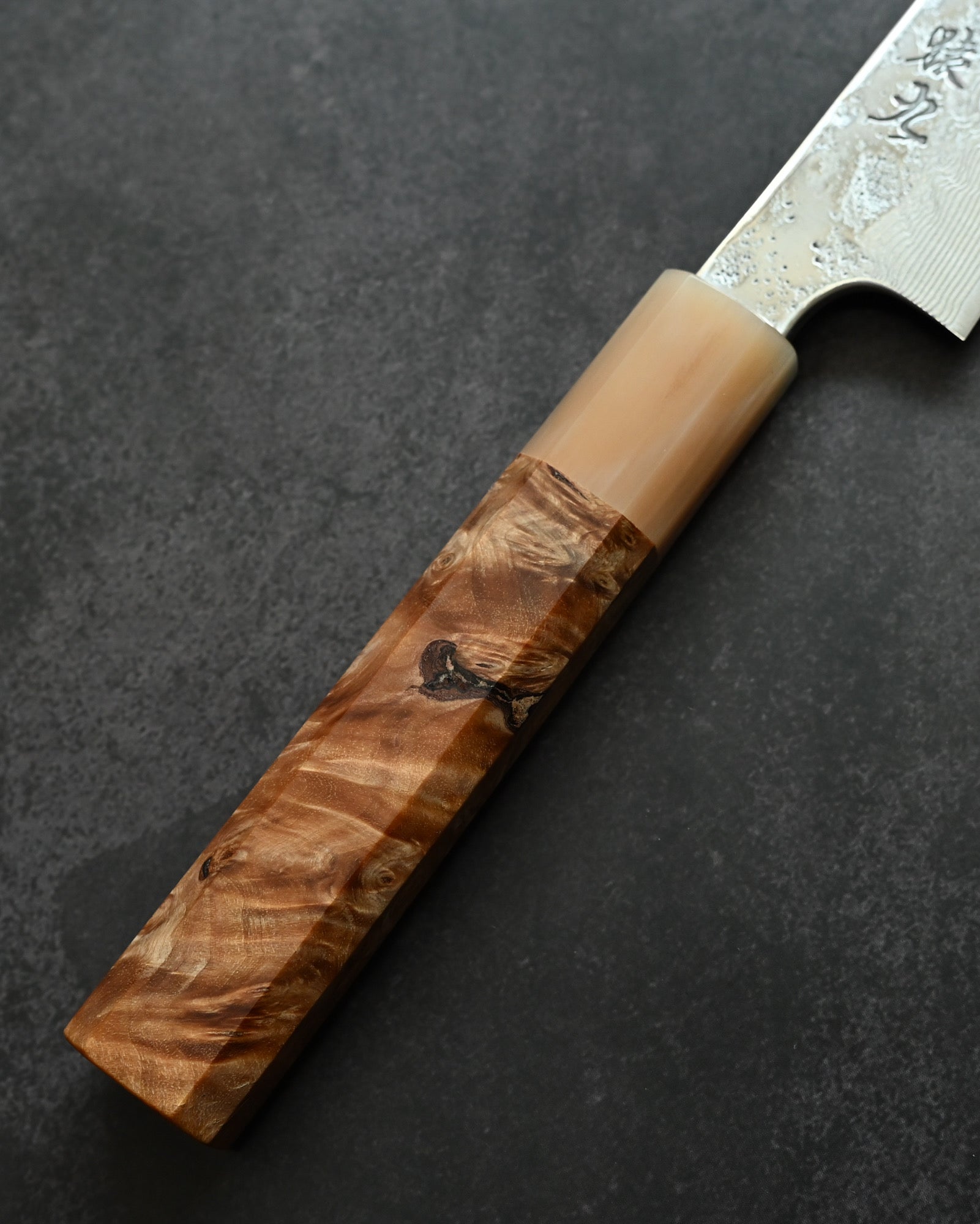 Saruku Homura-Un Petty Knife 135mm Japanese Kitchen Knife SPG2 Damascus Burl Wood Handle Buffalo Horn Ferrule