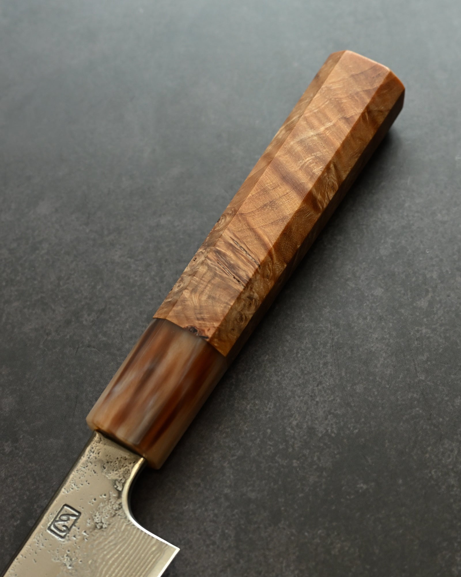 Handle: Natural Burl Wood (Karin Burl) + Buffalo Horn Ferrule
