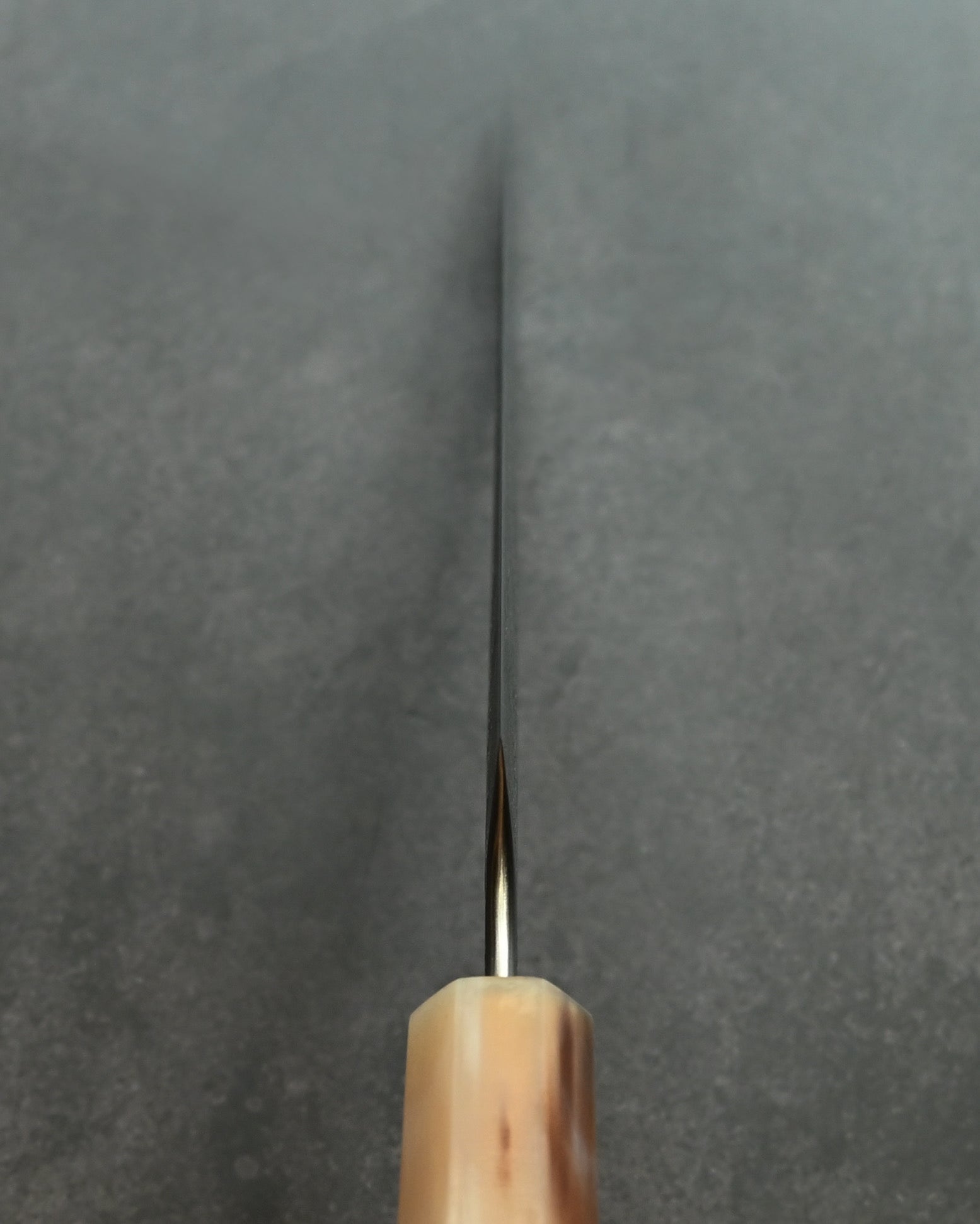 The Saruku Homura-Un Petty Knife 135mm is handcrafted by master bladesmith Toshiaki Saruwatari in Seki City, Japan. Forged with SPG2 (Super Gold 2) Damascus steel at 3mm thickness, it provides long-lasting sharpness and excellent corrosion resistance. The handle is crafted from rare burl wood (Karin burl), accented with a buffalo horn ferrule, combining elegance, durability, and a luxurious touch. Compact at 135mm, this petty knife is perfect for vegetables, fruits, and fine cutting tasks — a refined Japanese kitchen knife that blends functionality and artistry.
