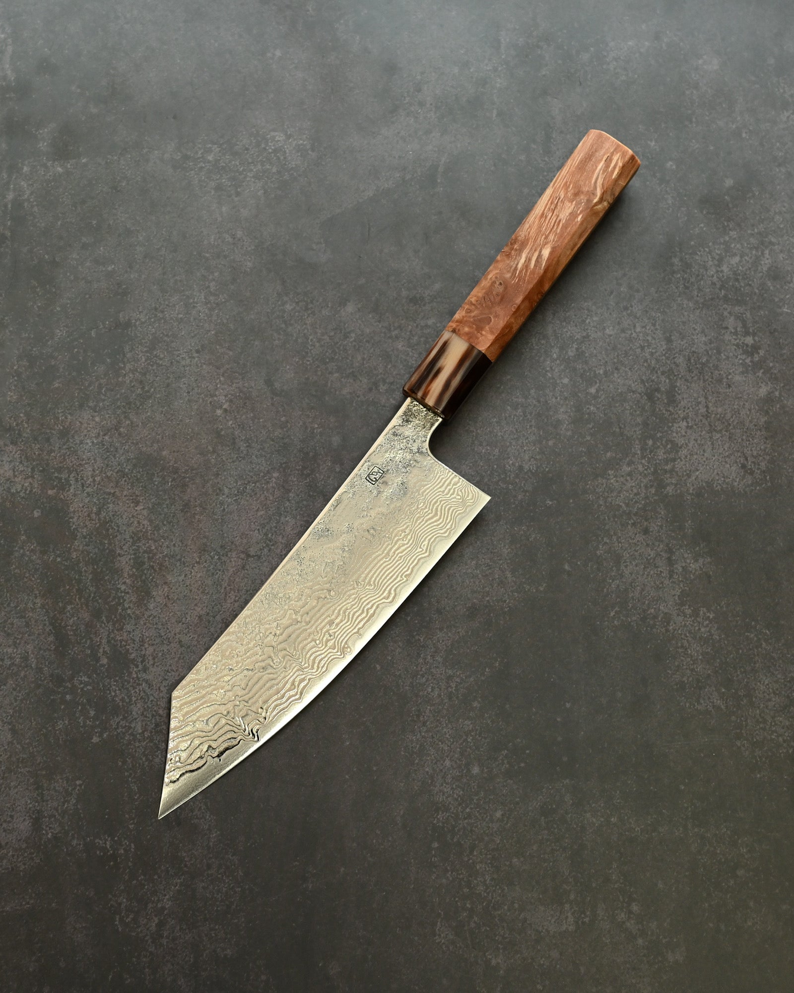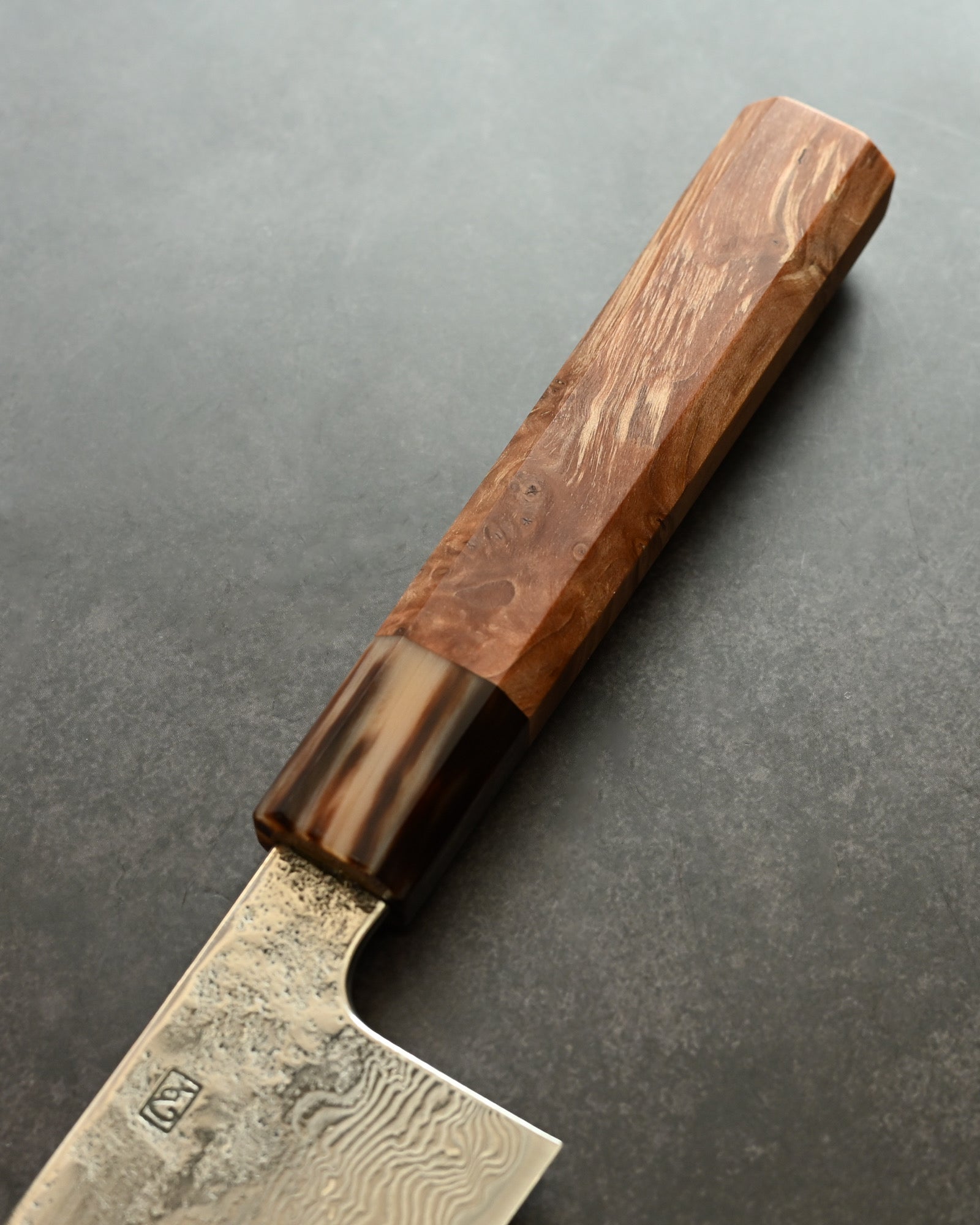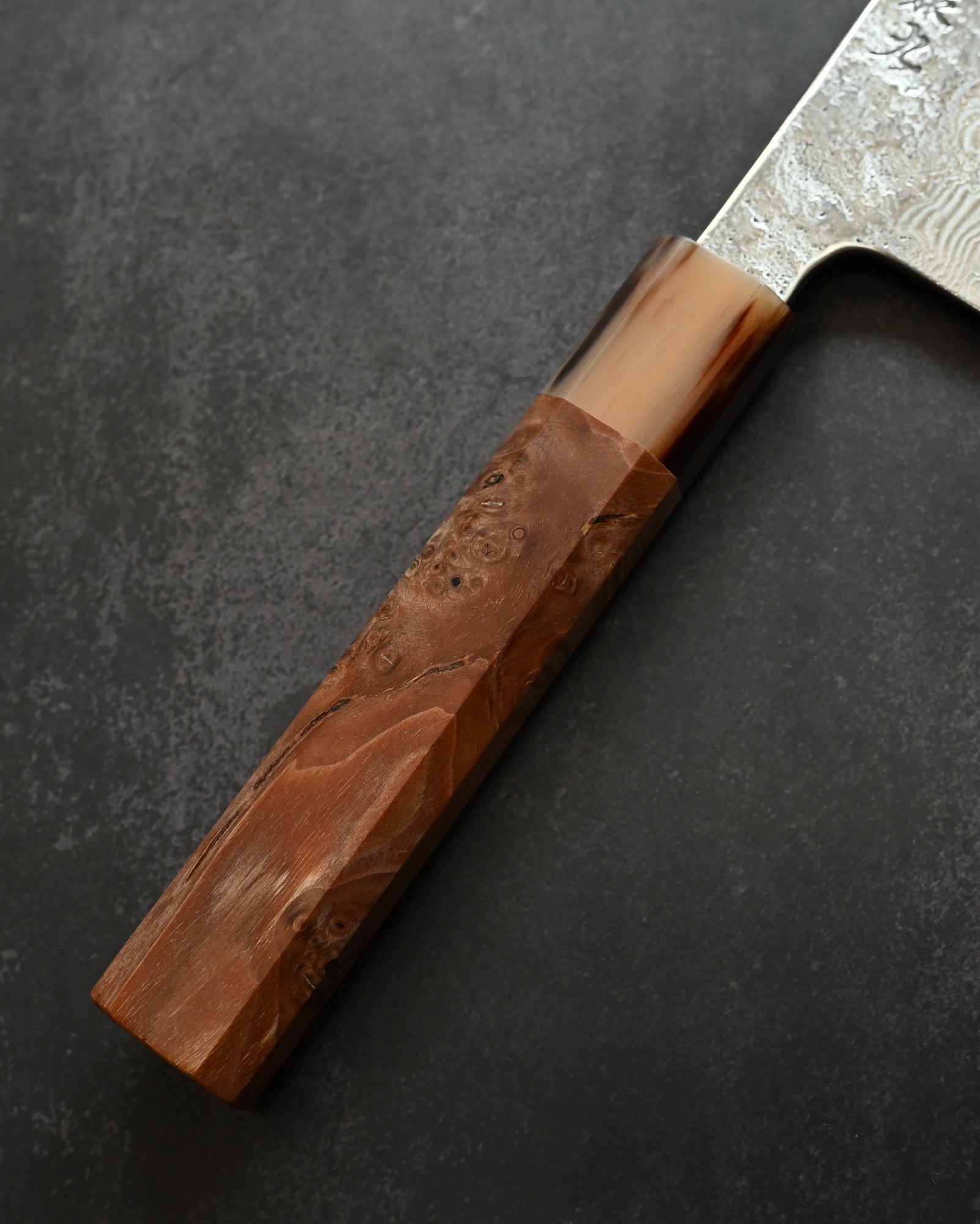 Handle: Natural Burl Wood (Karin Burl) + Buffalo Horn Ferrule