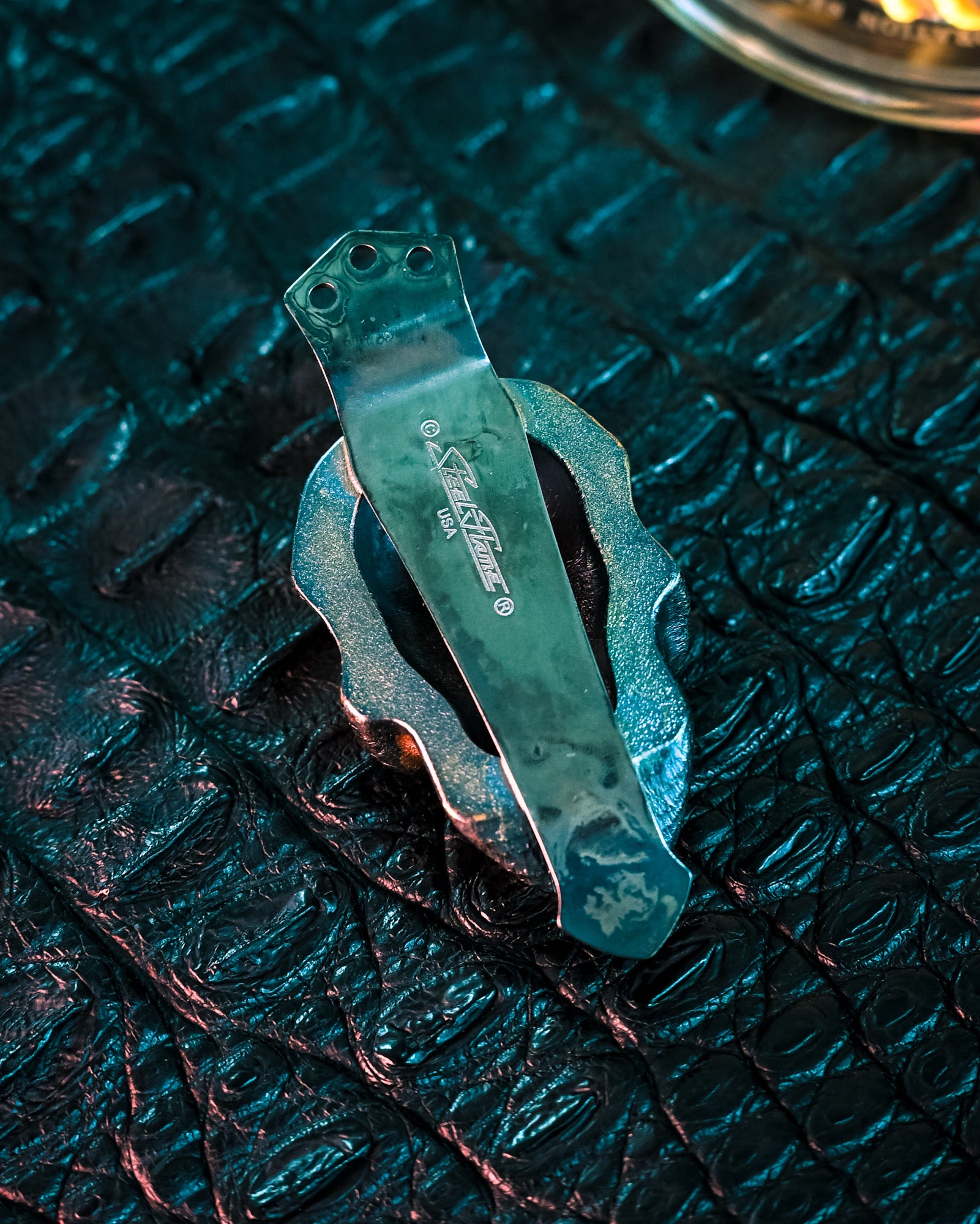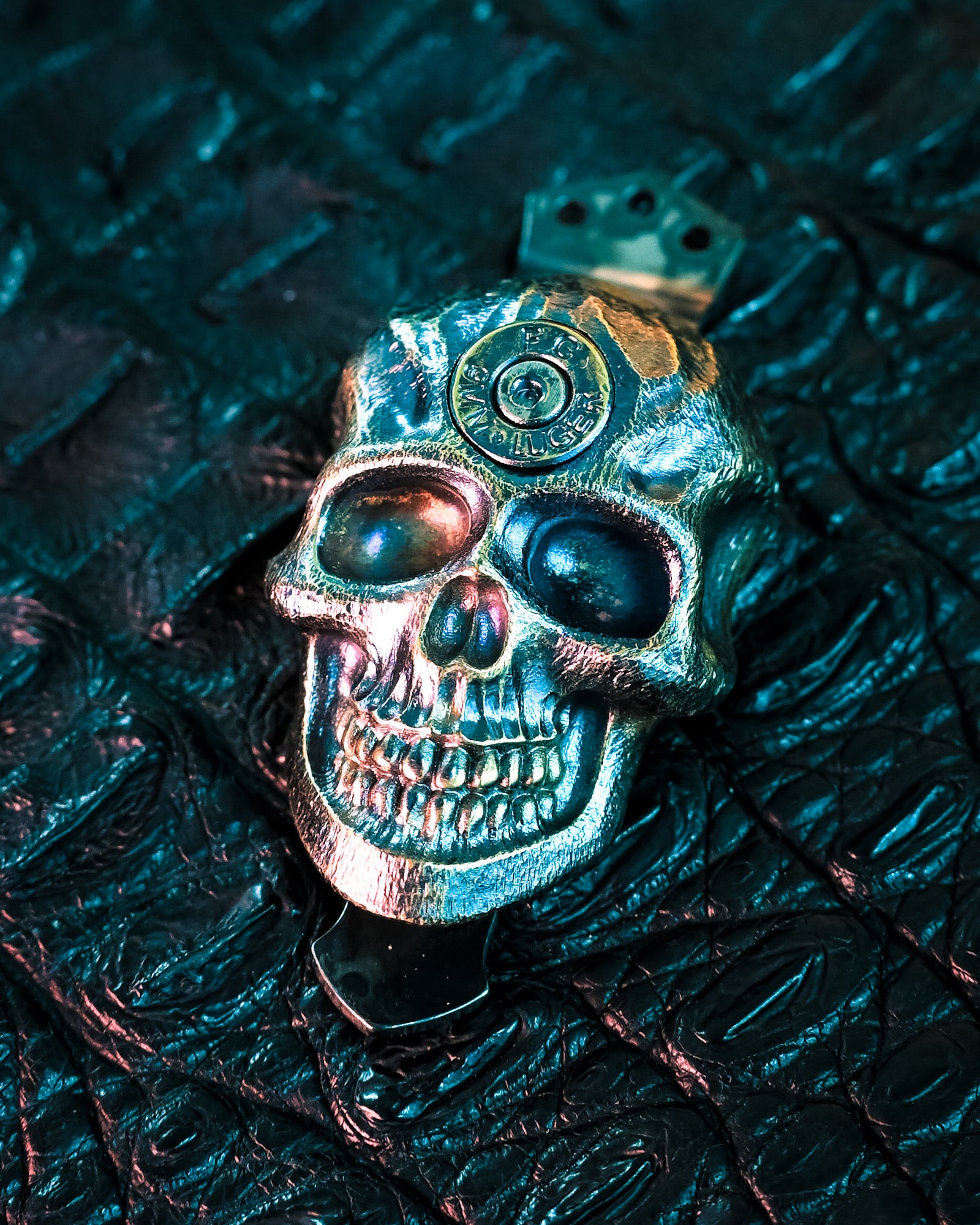 The Dark Gun Slinger XXXL Skull Pocket Clip by Steel Flame is a rare masterpiece, crafted from bronze with a striking 9mm Luger casing inlay. Its dark vintage oxidation finish enhances the bold tactical aesthetic, while the XXXL oversized build and triple-hole clip design provide both presence and functionality. A collector’s treasure for serious EDC and knife enthusiasts.