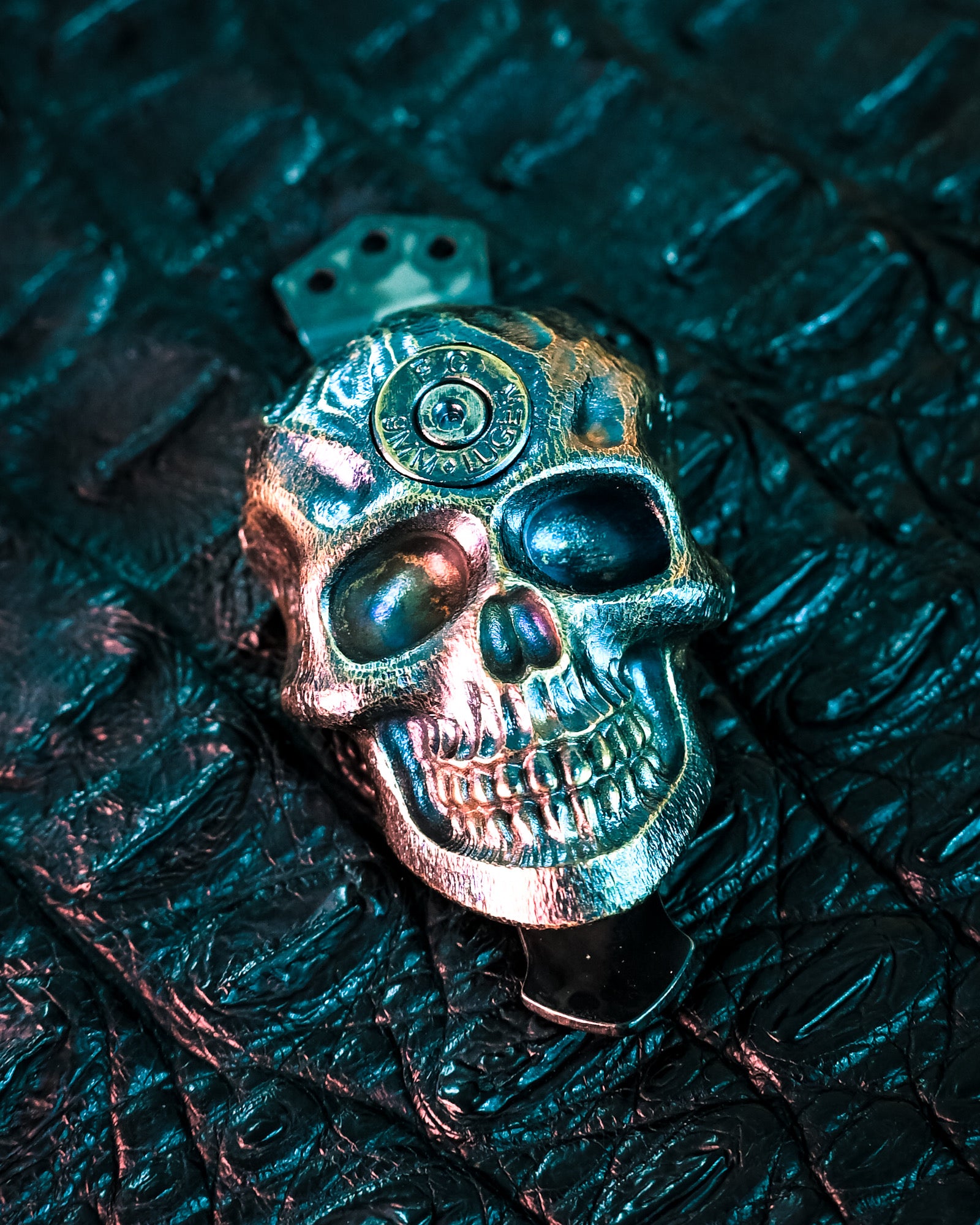 Steel Flame Dark Gun Slinger XXXL Skull Pocket Clip – Bronze & 9mm Luger, Triple-Hole Clip