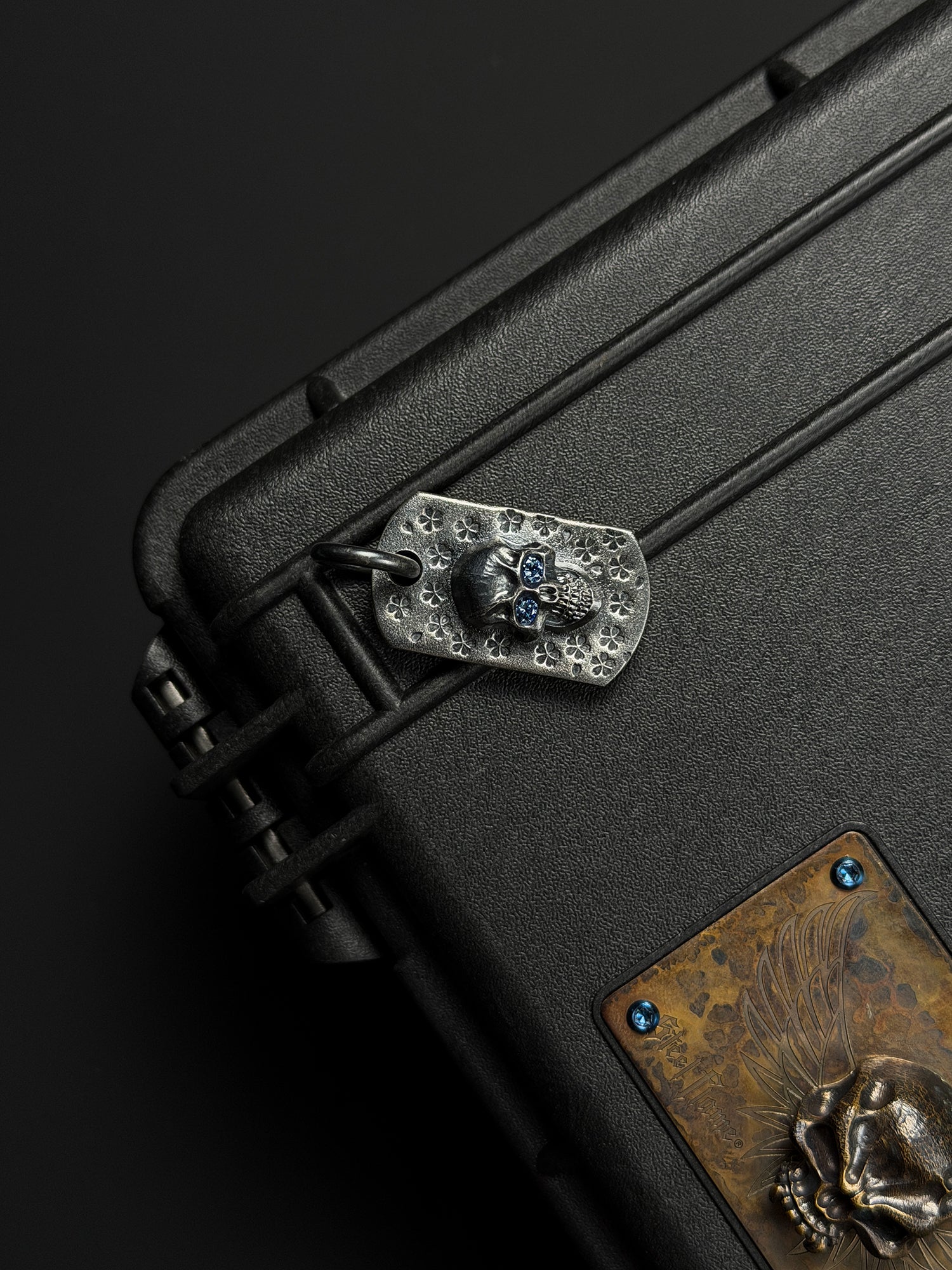Steel Flame Sakura Pattern Dark Skull TAG Pendant — One Signature Edition | 925 Sterling Silver Base × Dark Skull × Blue Faceted Gem Eyes | Collector-Grade EDC Art
