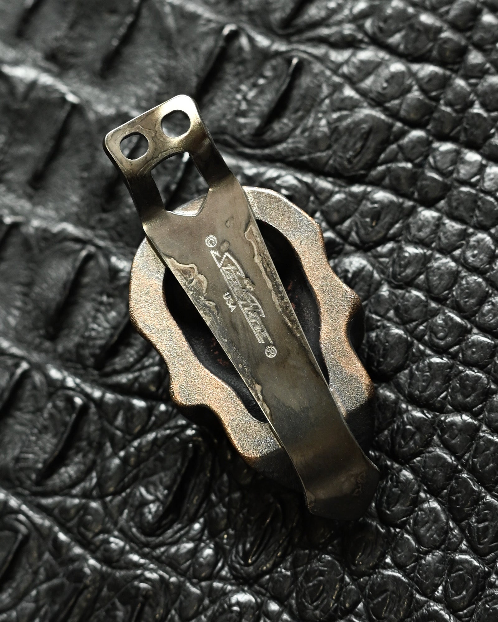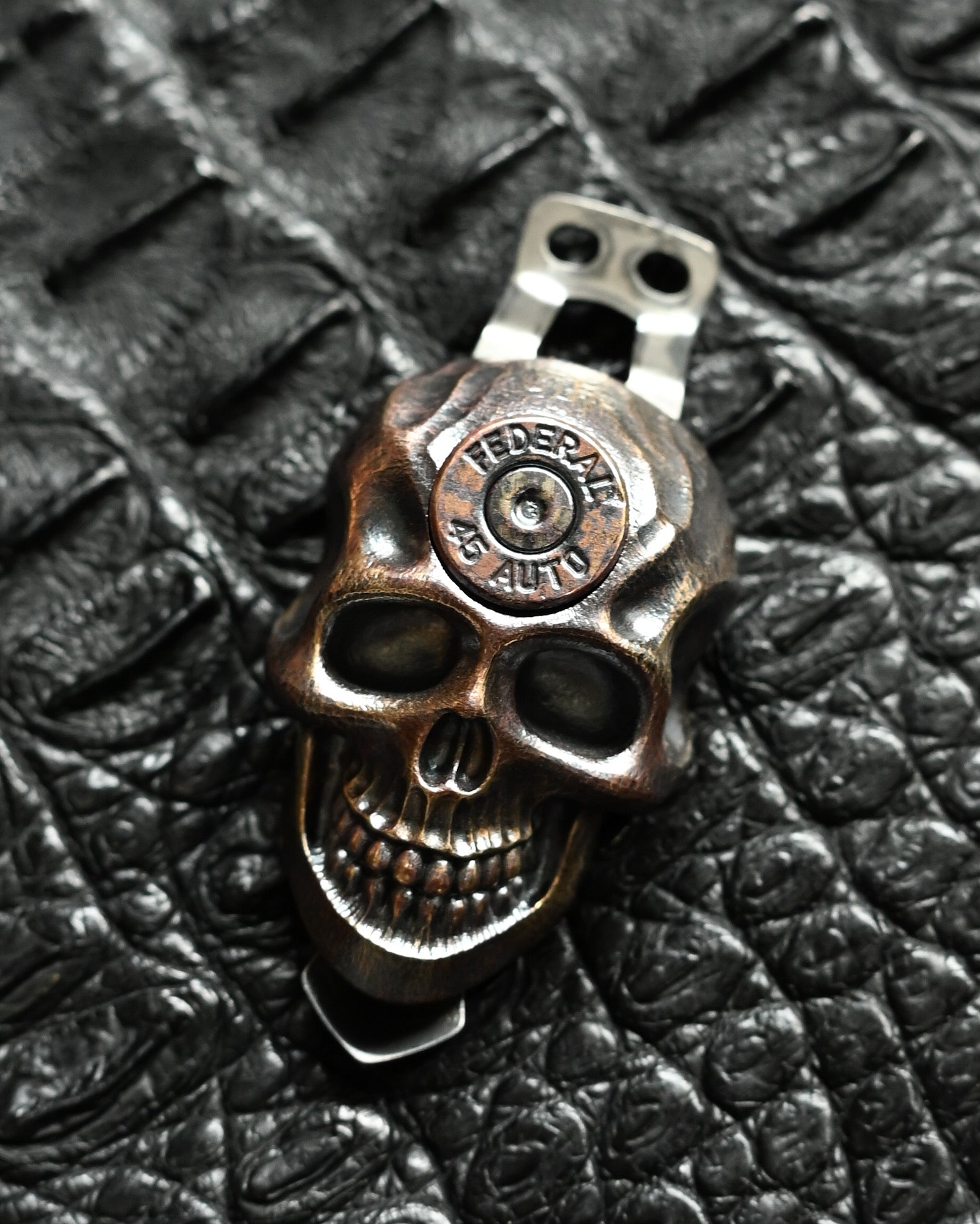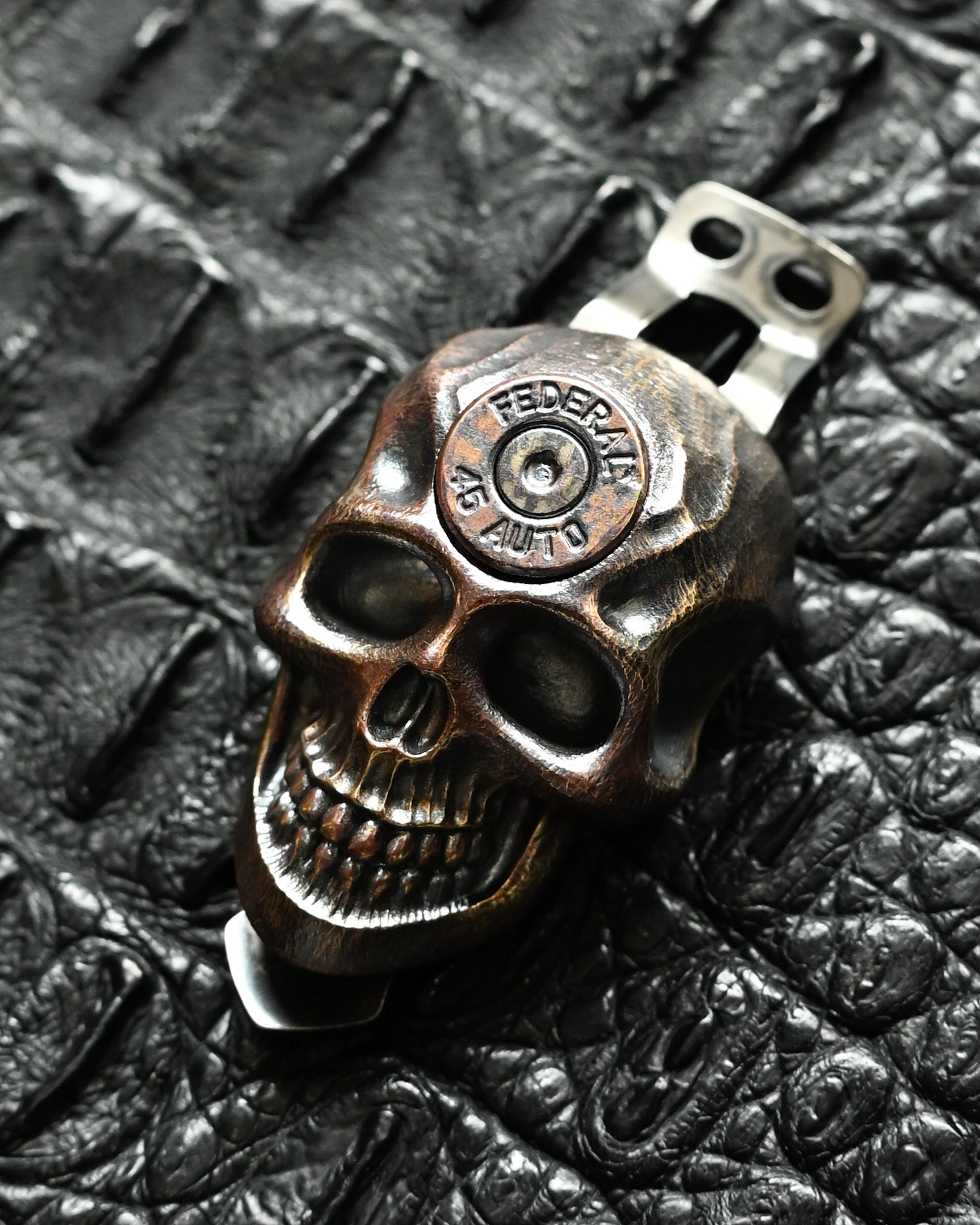 Steel Flame Skull Two-Hole Pocket Clip – Bronze / XXXXL / Federal .45 Auto Inlay / Limited Edition