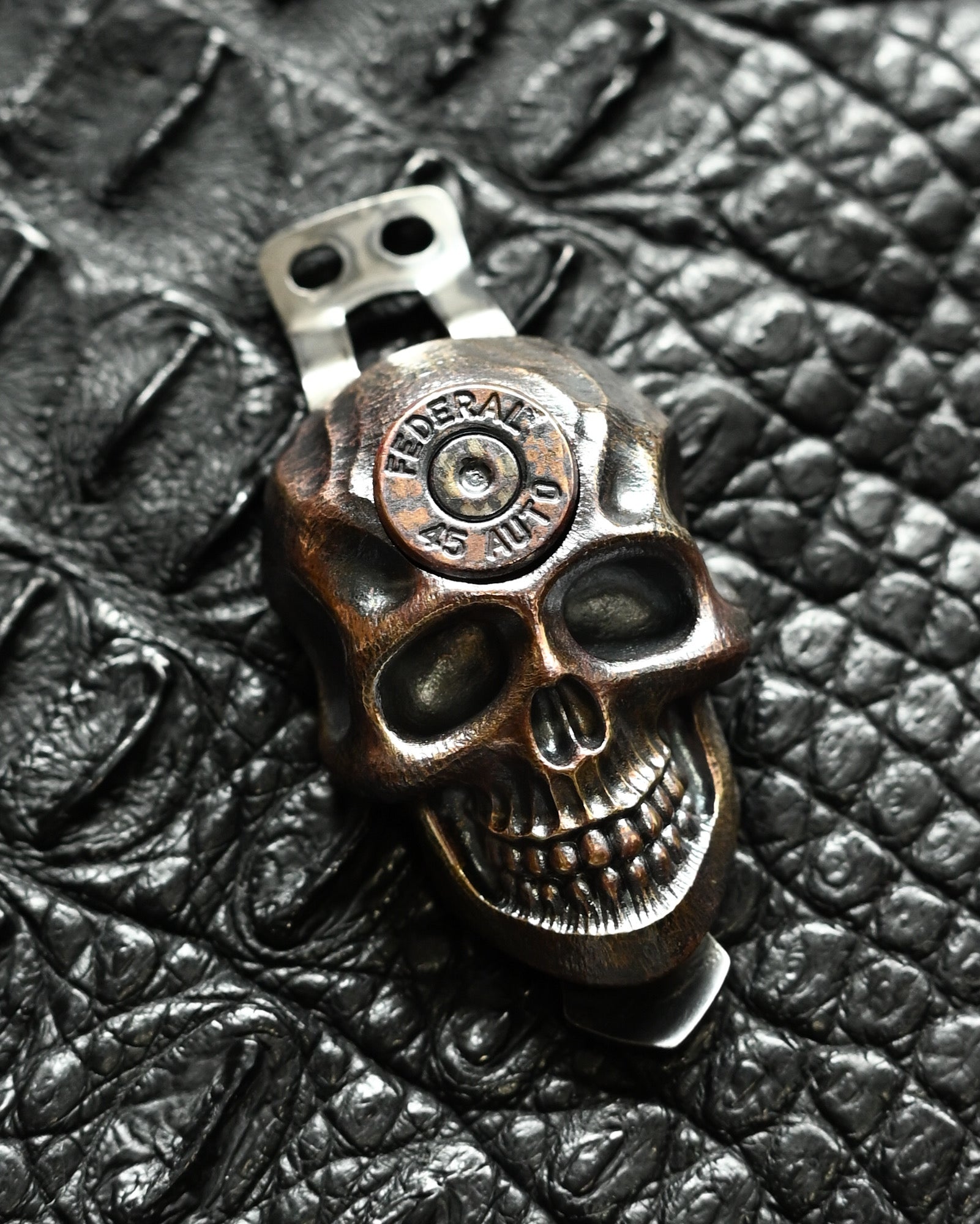The skull head features an authentic Federal .45 Auto cartridge inlay, symbolizing raw power and tactical artistry.