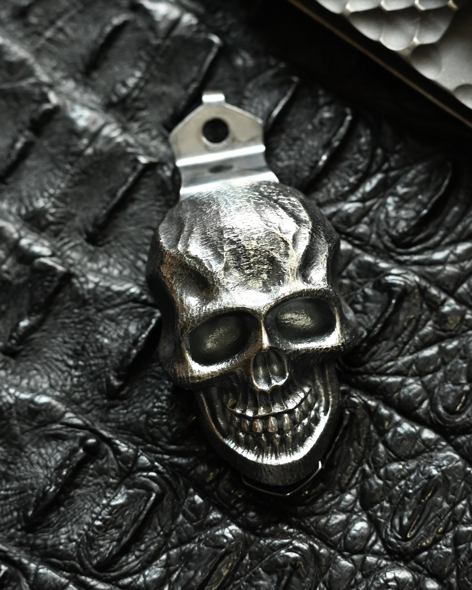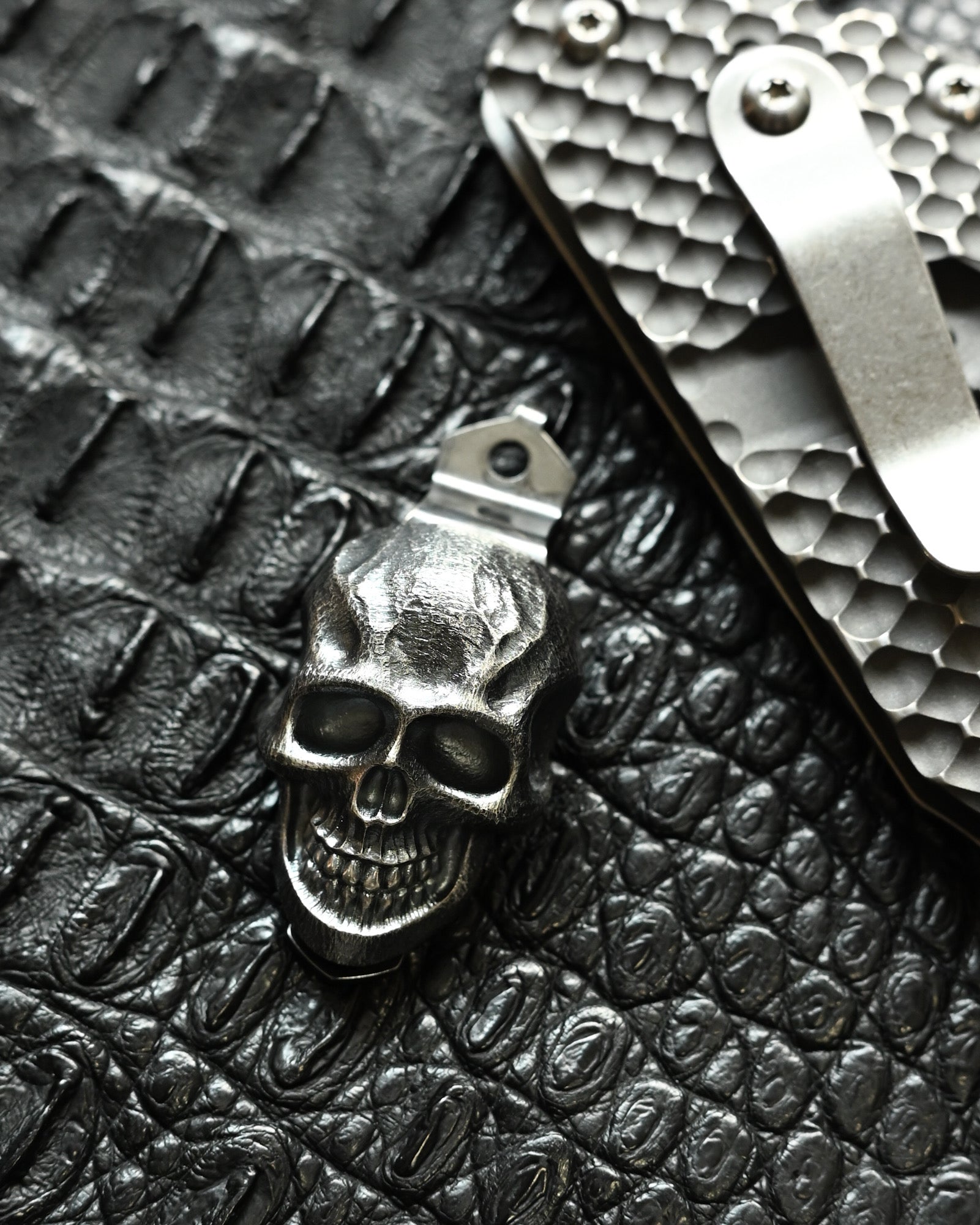 Crafted from solid stainless steel, this pocket clip features a 925 silver Dark Skull inlay, radiating a unique tactical and artistic presence.