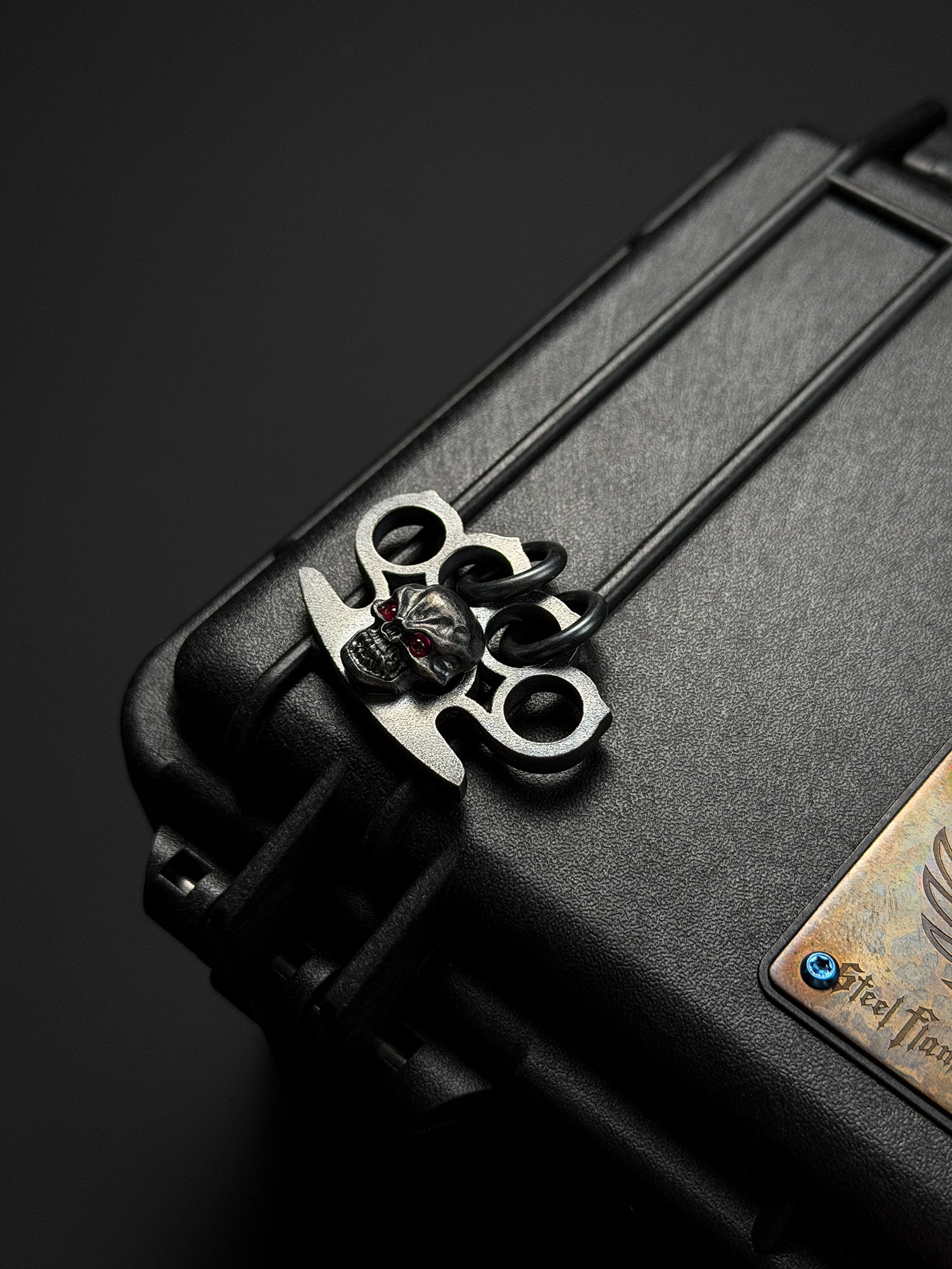 The front showcases a meticulously sculpted 925 Silver “Resolute Skull”, set with deep red zircon eyes that deliver a striking, intimidating presence. Every curve, bevel, and shadow is finished with exceptional detail, reflecting Steel Flame’s mastery of hand-worked metal and symbolic design.