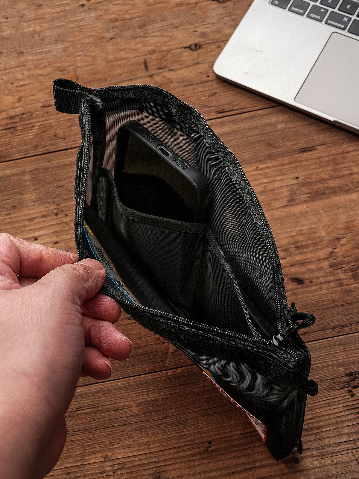 The interior includes slanted pockets and three separate areas, making it easy to categorize items of various sizes. The back and sides feature a MOLLE webbing system, enhancing compatibility with other bags and increasing flexibility of use.