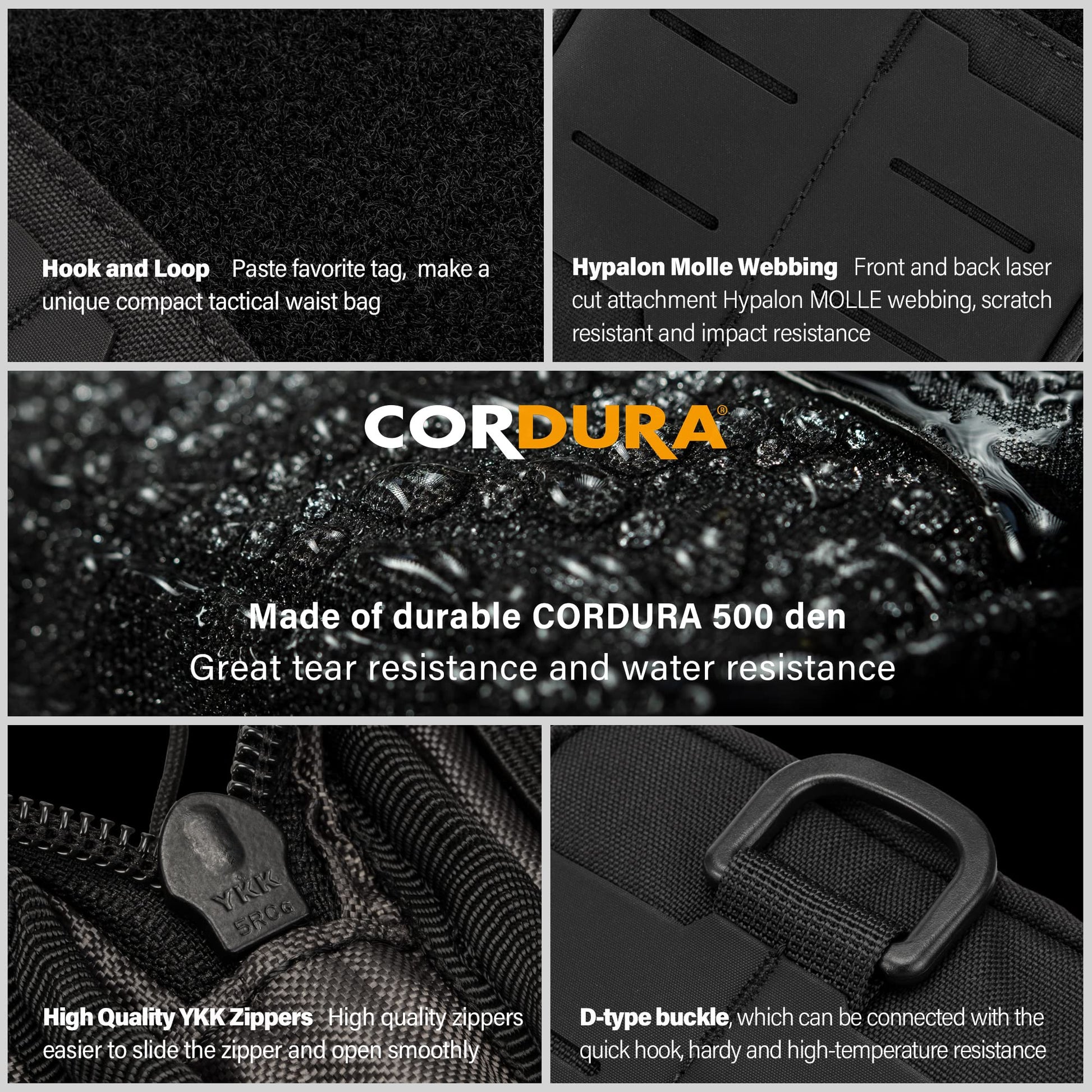 - SCRATCH RESISTANT & IMPACT RESISTANCE:TACTICAL GEEK EDC compact waist bag is made of 500D CORDURA Nylon fabric as major material, and the front and back attachment Hypalon MOLLE panel, which is durable, has better tear resistance and water resistance, better protect the outdoor supplies you need and is specially designed for the tough outdoor environment.