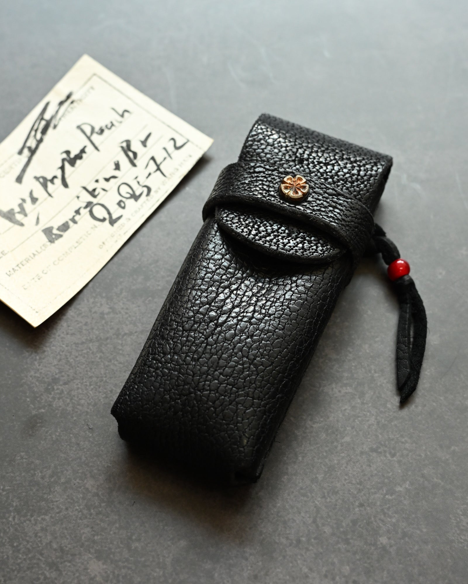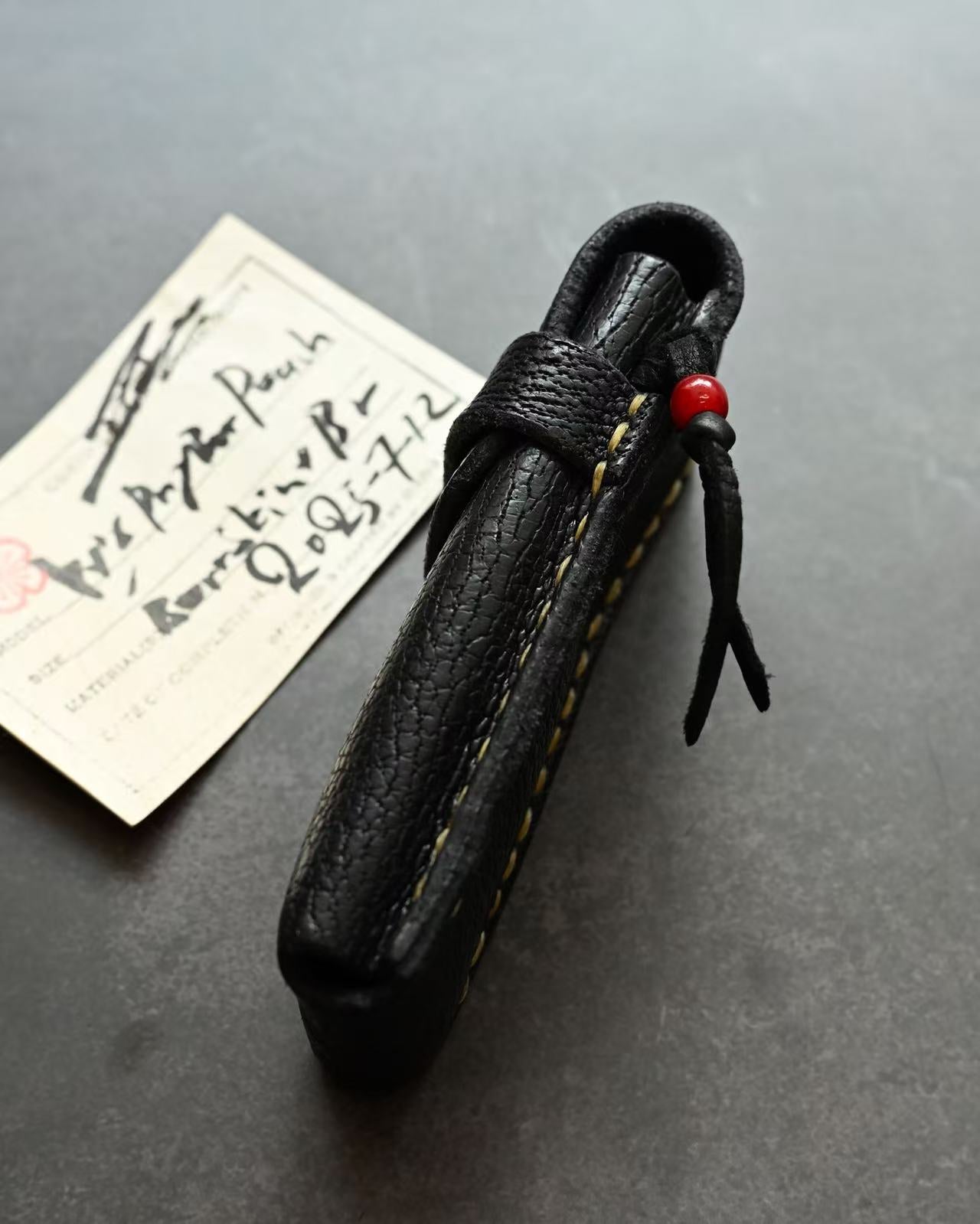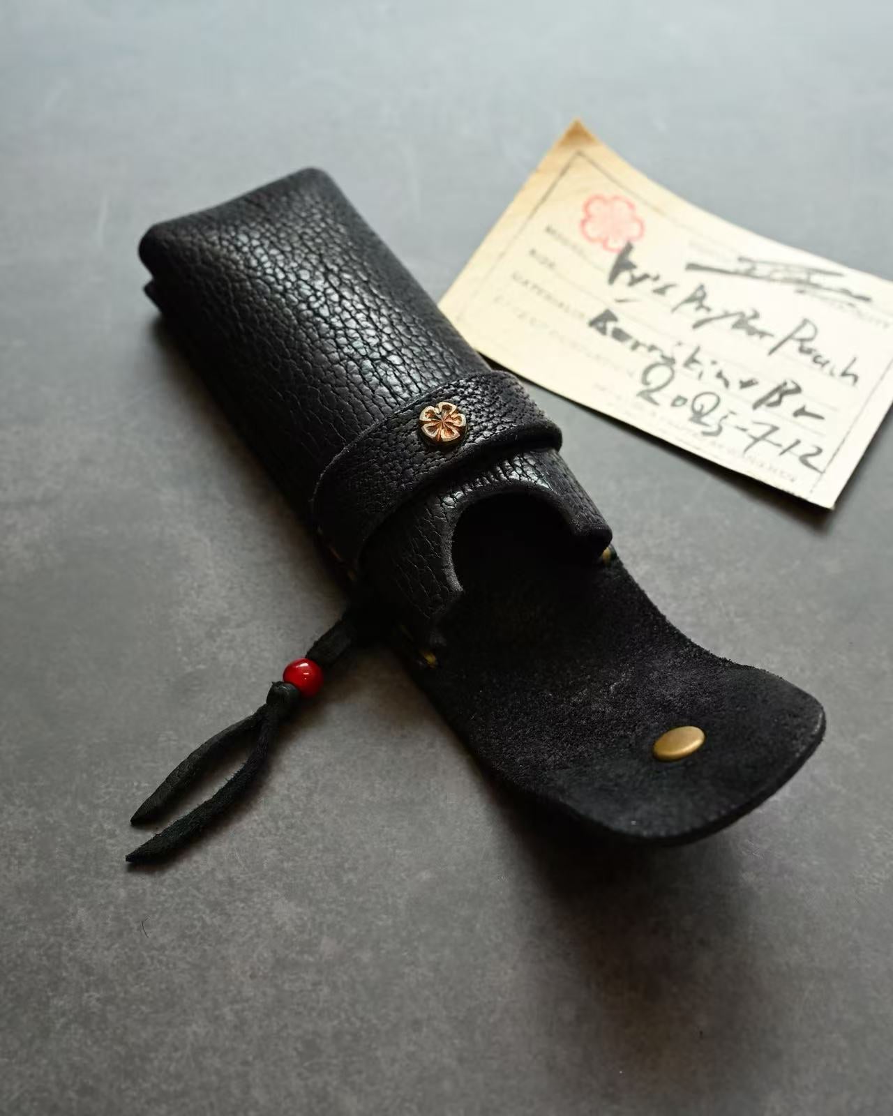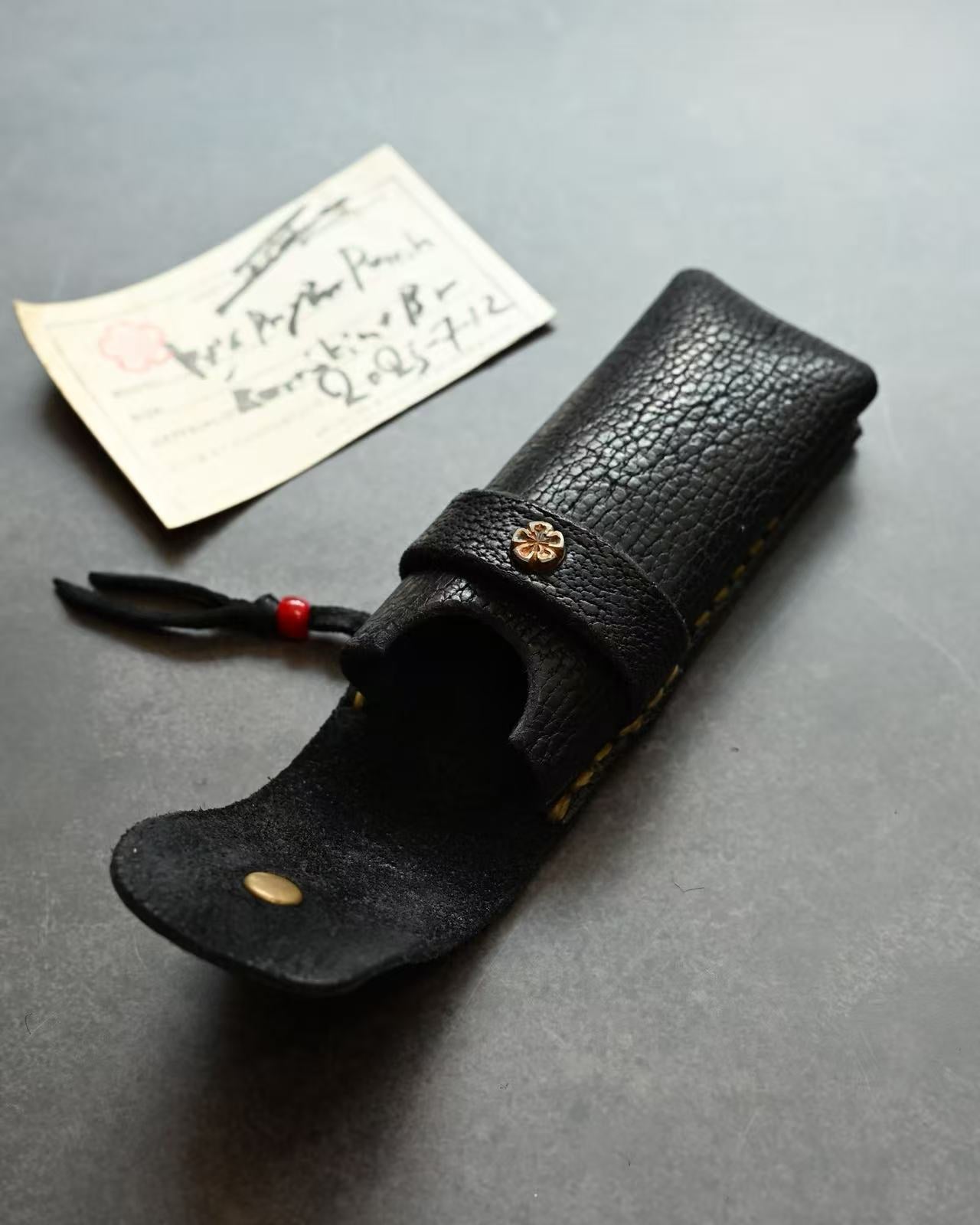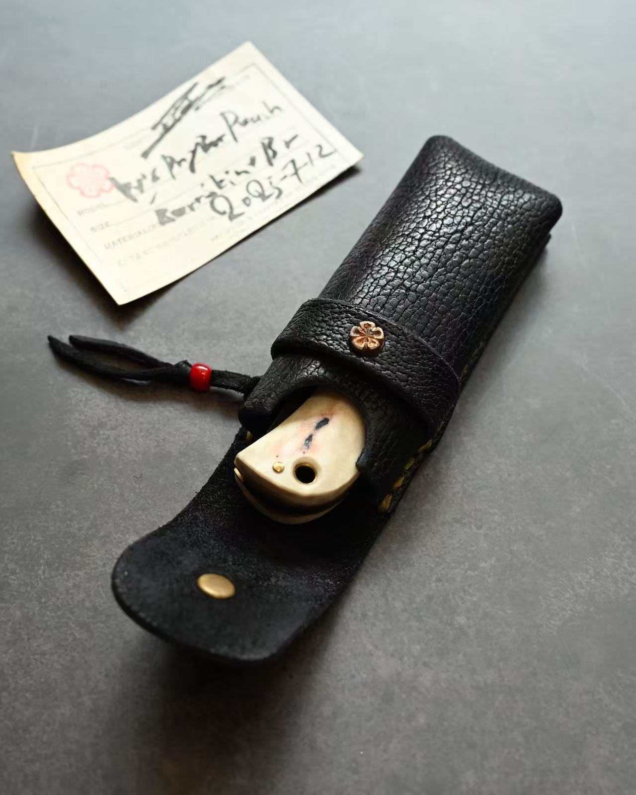 From the Japanese artisan brand Wtopia, this unique knife/tool/flashlight pouch is crafted from rare bear leather, featuring a delicate bronze cherry blossom inlay on the flap.