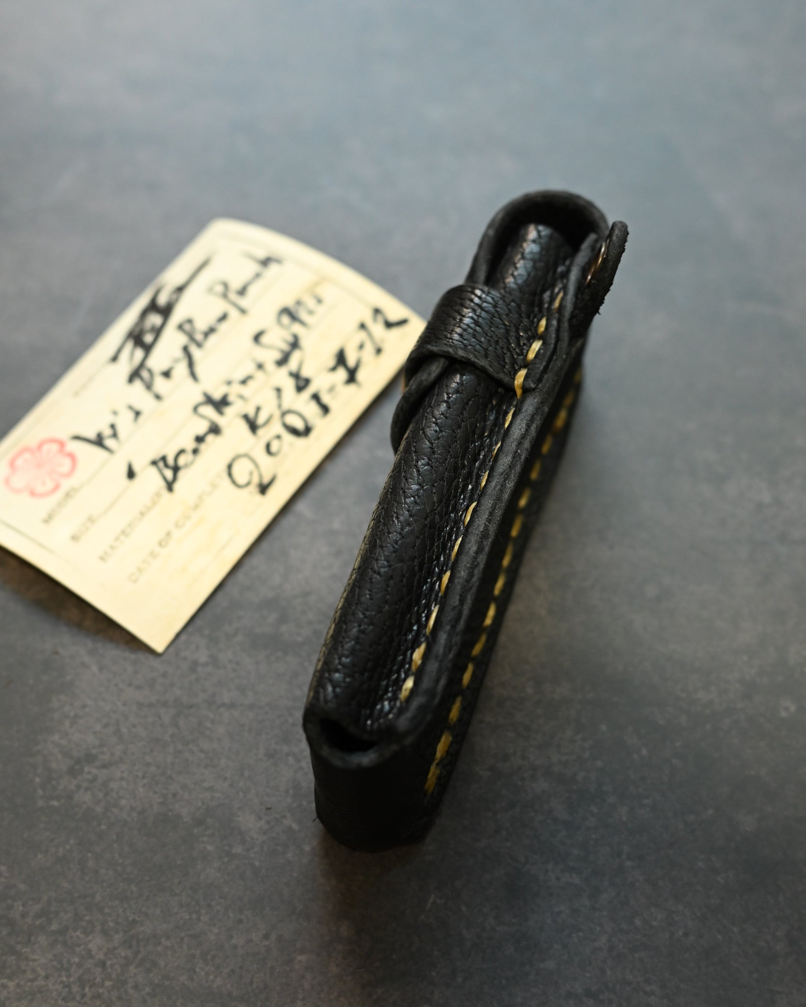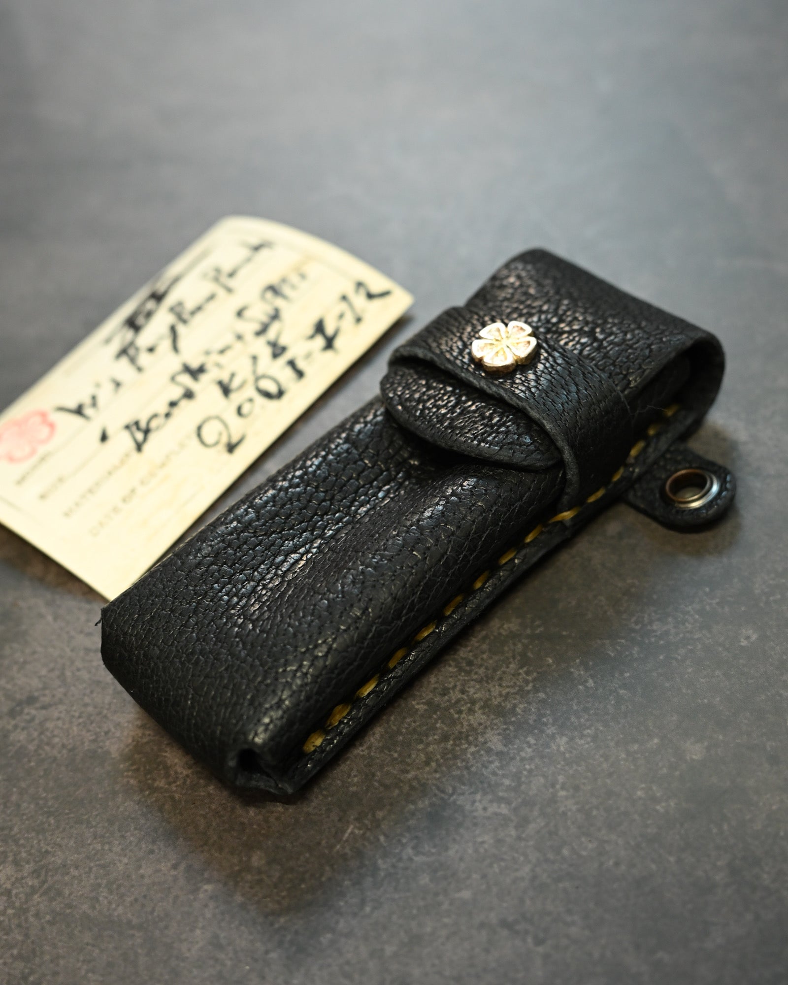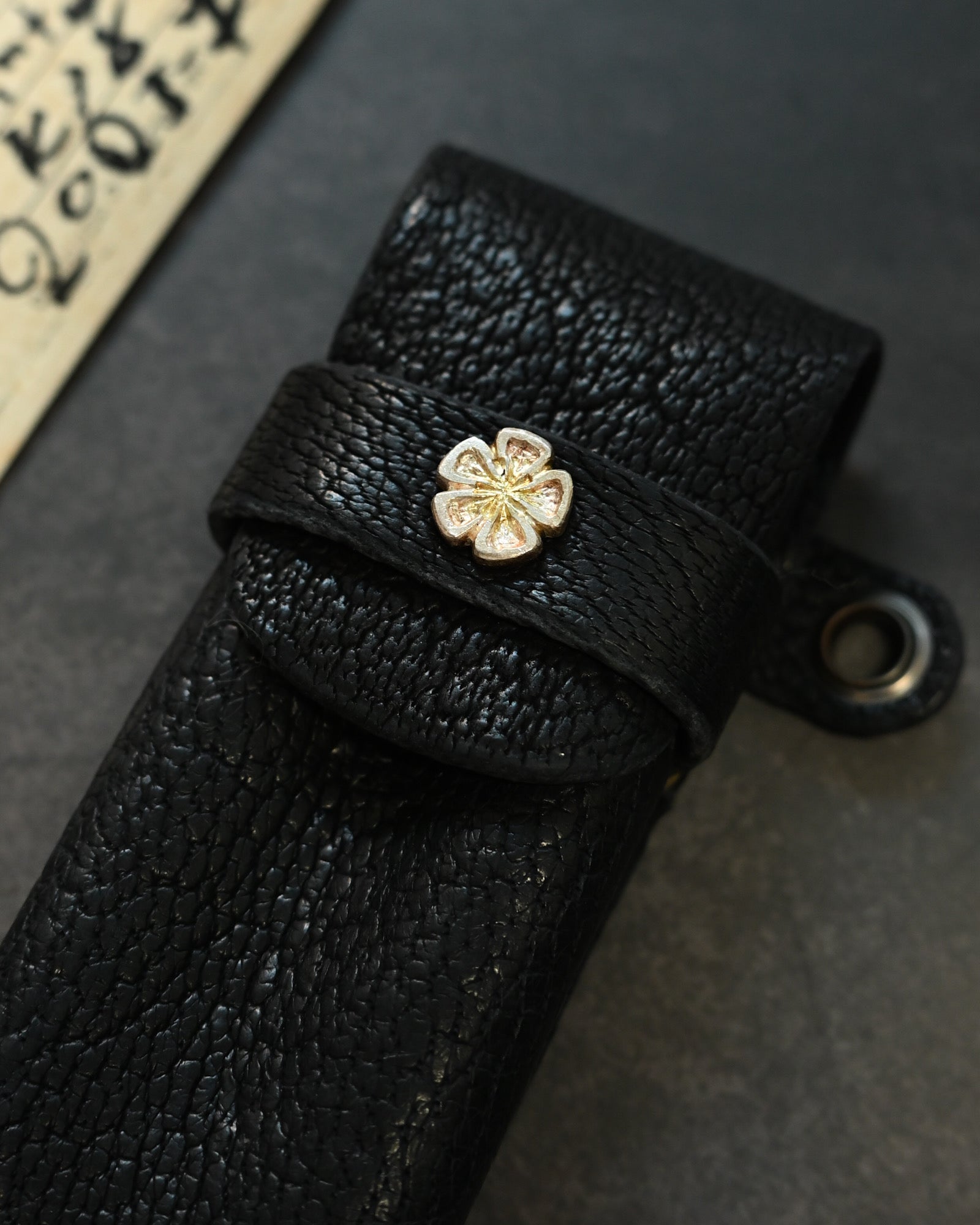 The flap is adorned with a 925 silver apricot blossom stud, adding a subtle yet elegant accent against the deep black leather. On the side, a grommet hole is reserved for attaching knife lanyards or pendants, offering both practicality and personalization.